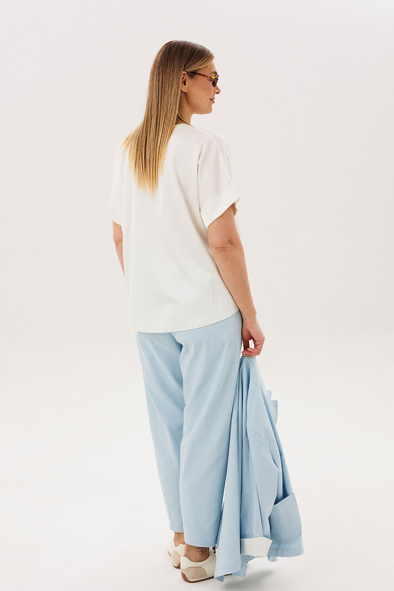 Атласная блуза добавляет комплекту изысканности: лёгкий блеск ткани освежает образ и делает его более выразительным, сохраняя при этом сдержанность.