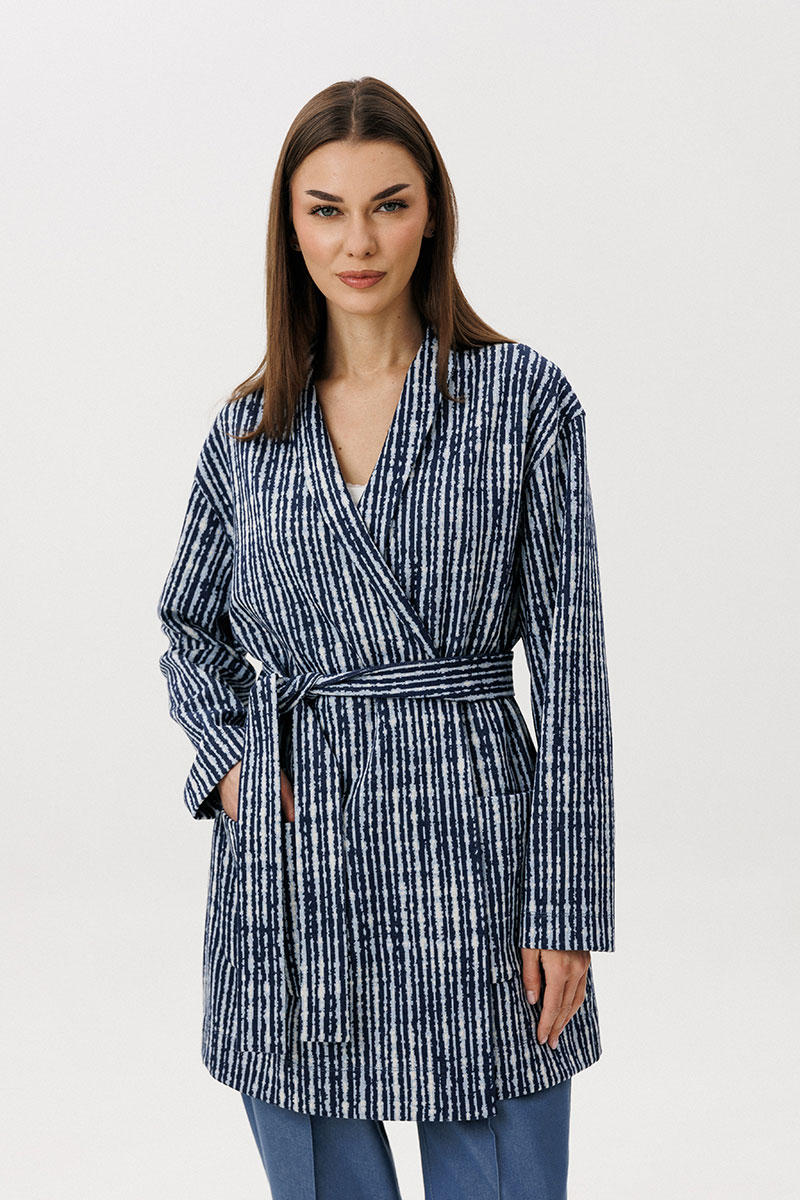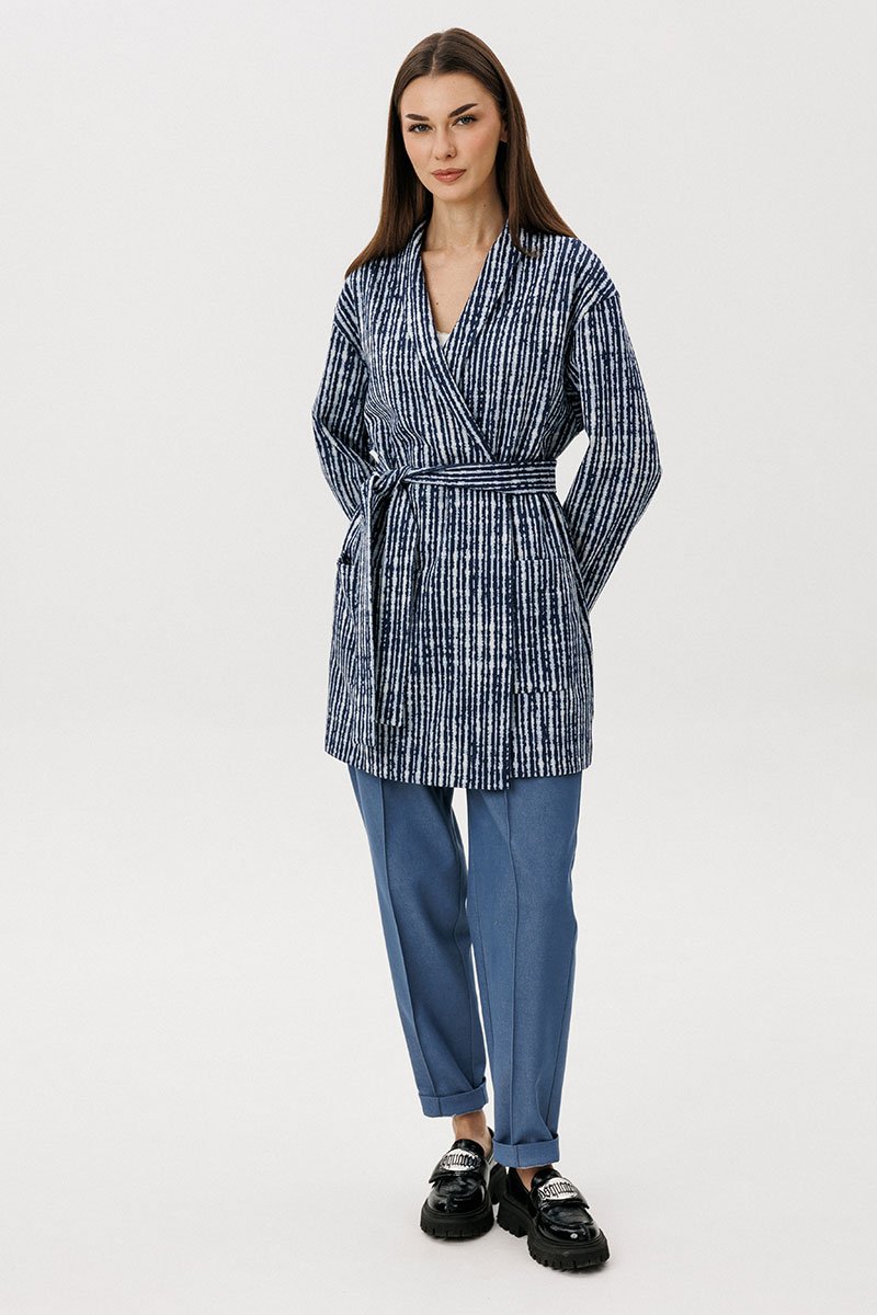 Кардиган выполнен из мягкого трикотажного полотна с декоративным узором, который добавляет образу динамику и подчёркивает его fashion-характер. Прямой силуэт и аккуратная линия плеч делают модель универсальной и легко адаптируемой под разные стилистические сценарии.