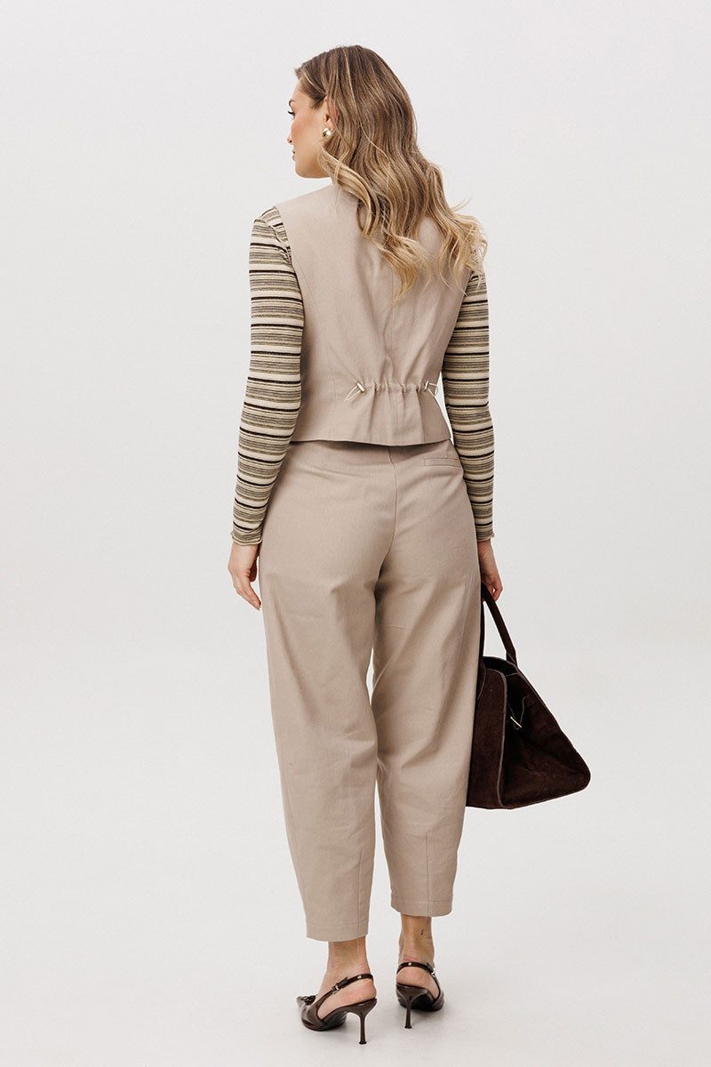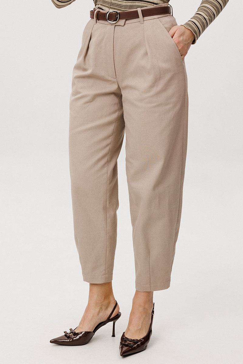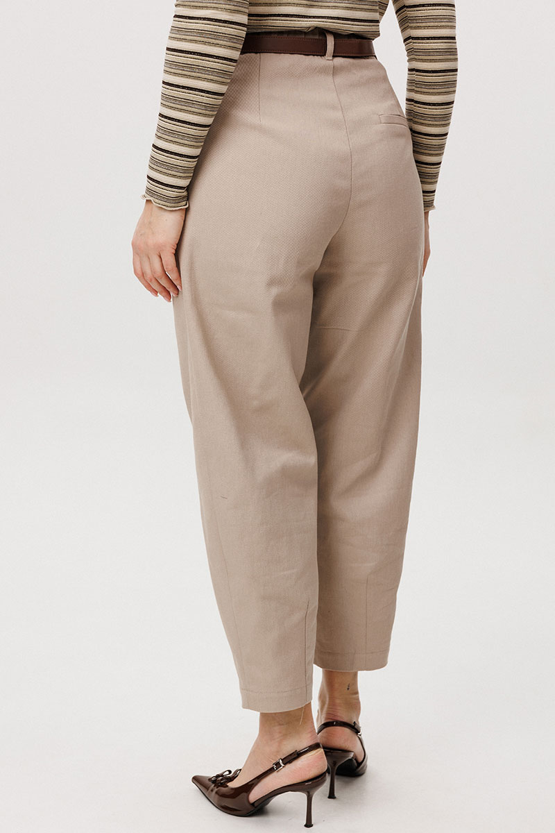 Брюки "баррел" на притачном поясе со шлёвками (эластичном в области спинки), с наклонными карманами , мягкими складками защипами по верху брюк и вытачками по низу.