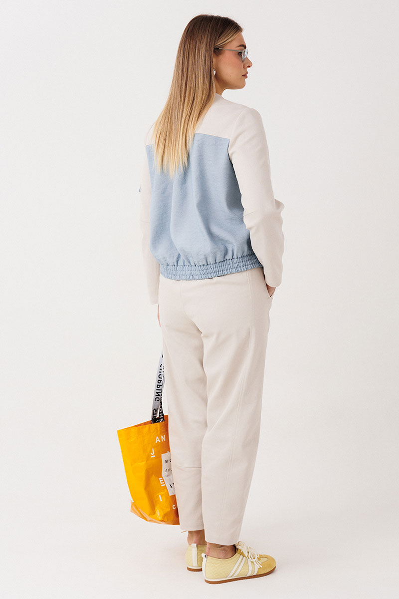складкой и притачным поясом на резинке. Рукав одношовный, с локтевой вытачкой и накладным карманом-пеналом с молнией на левом рукаве.