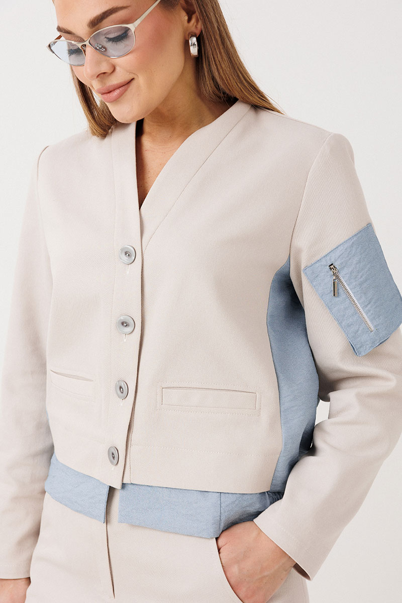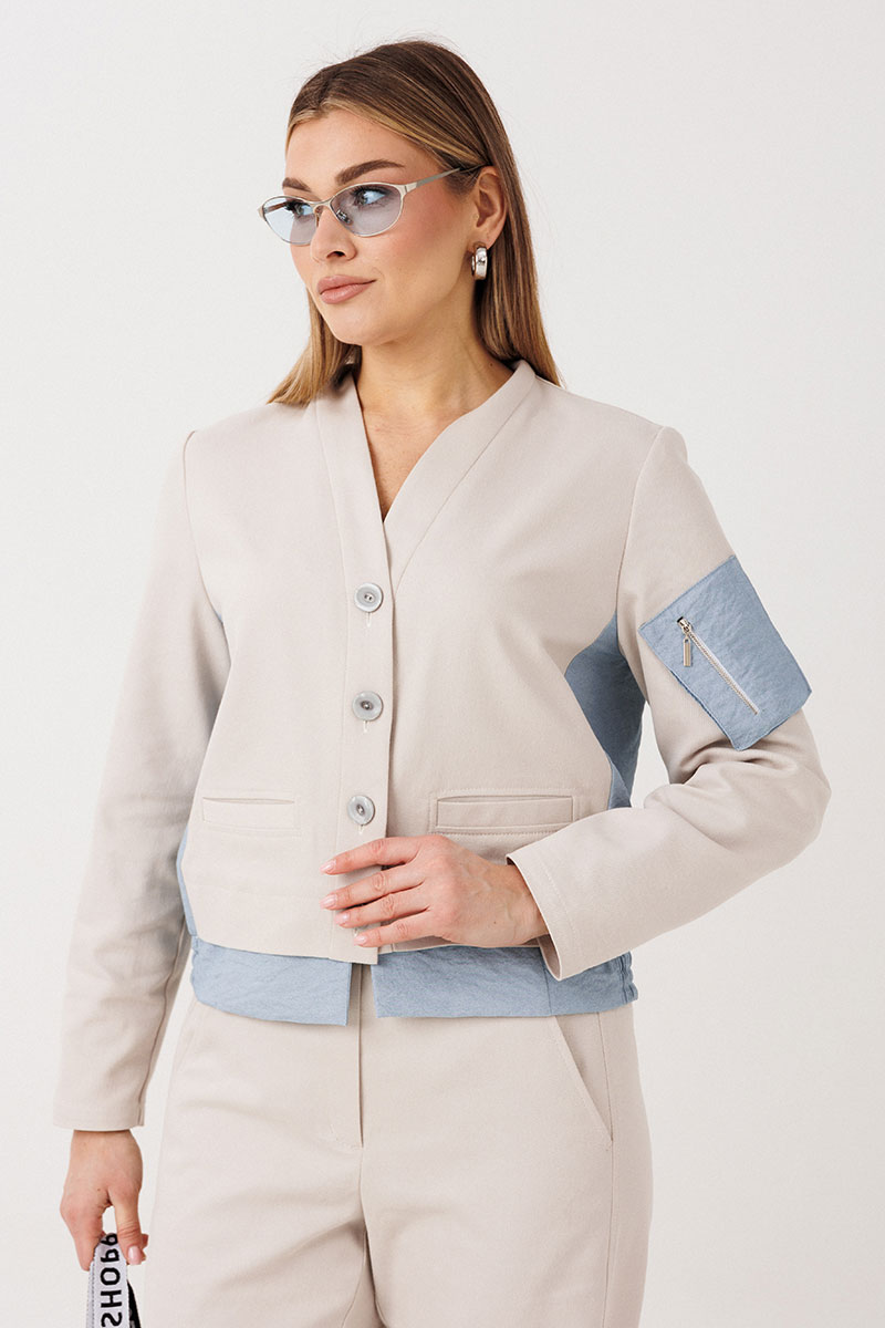 Жакет свободный, упрямленного силуэта, втачного покроя с центральной застежкой на притачной планке. Полочка с прорезным карманом с листочкой. Спинка с отрезной кокеткой, мягкой