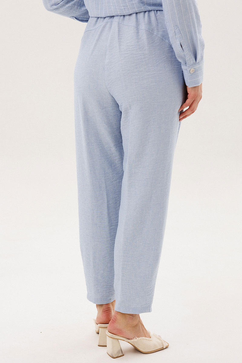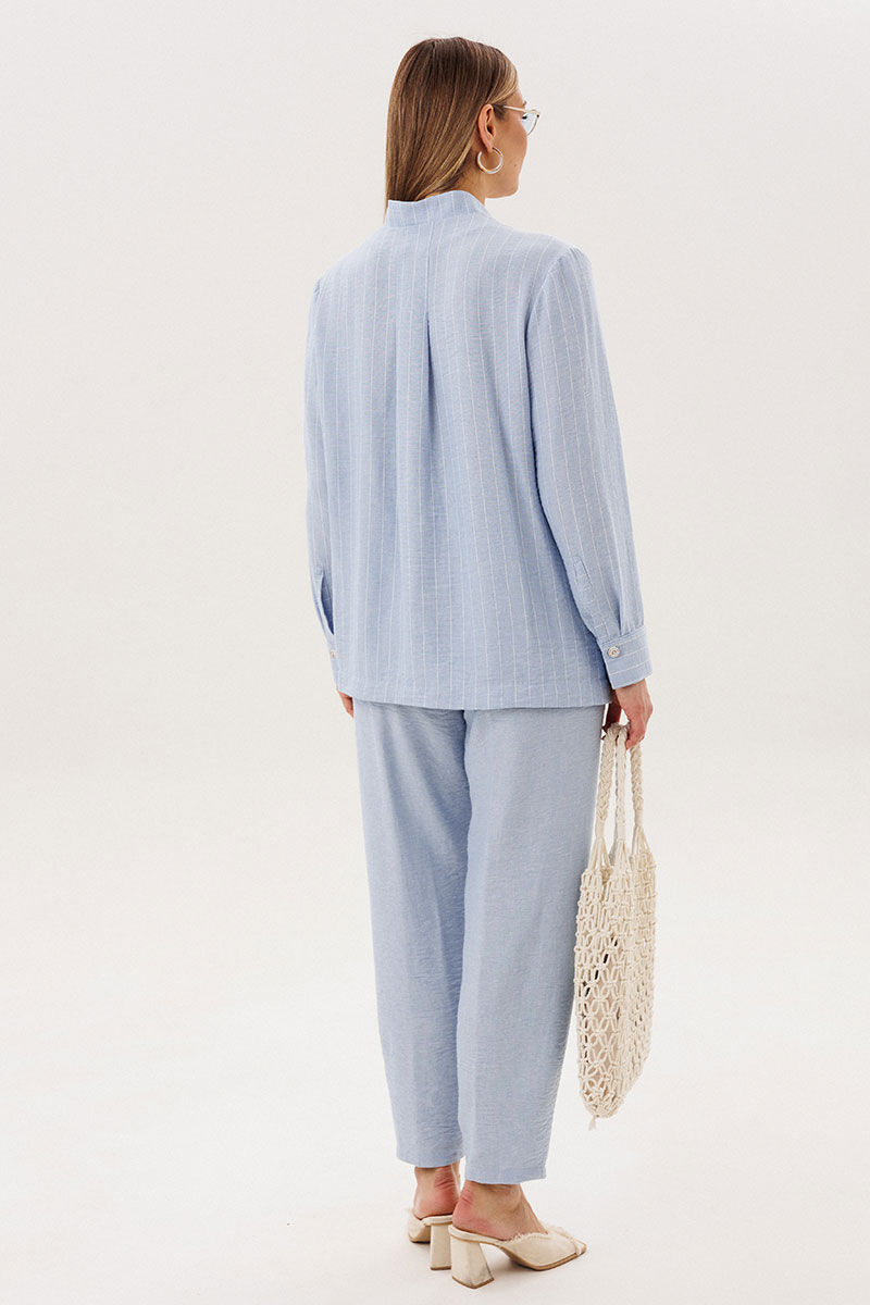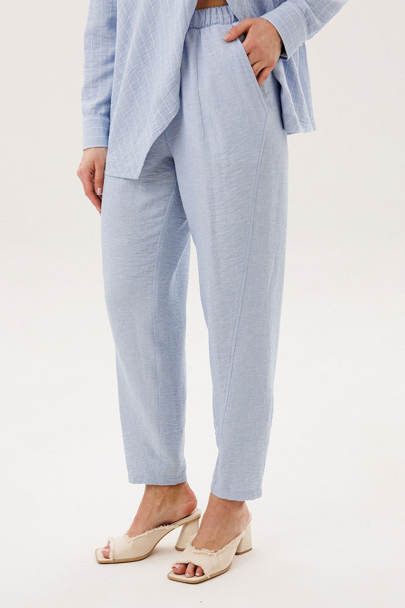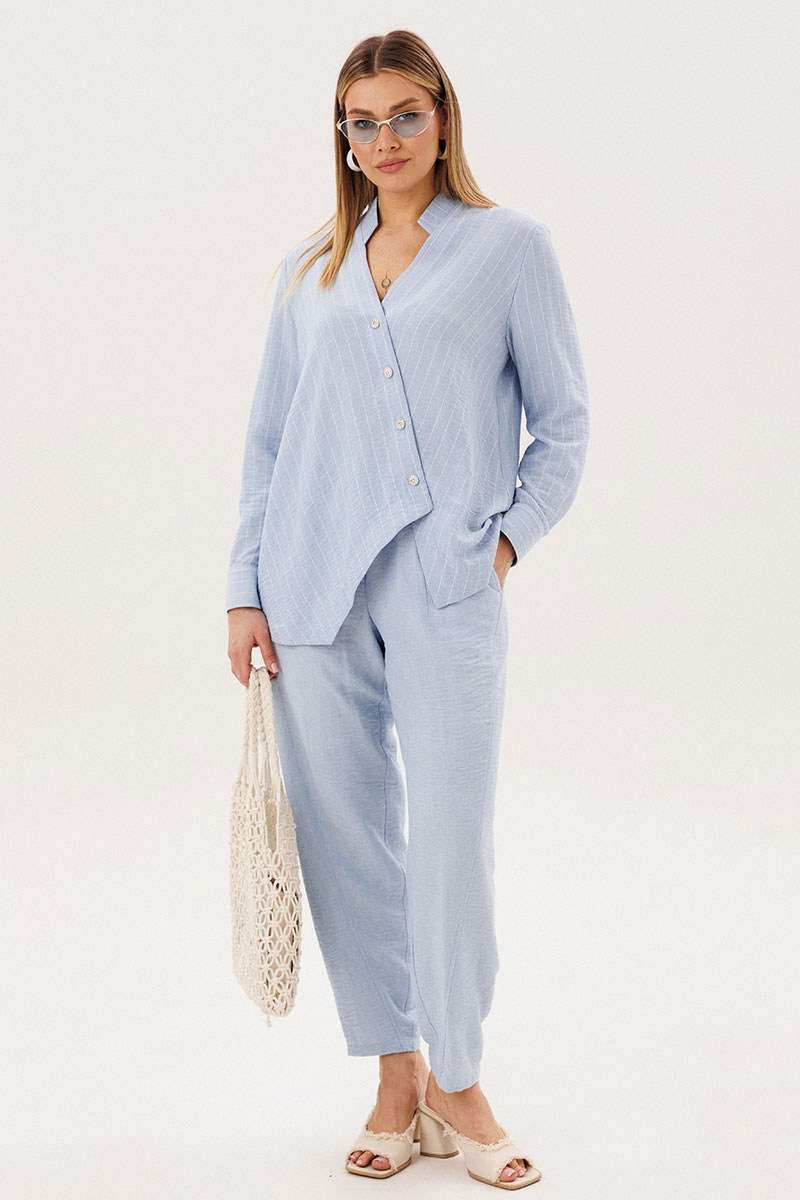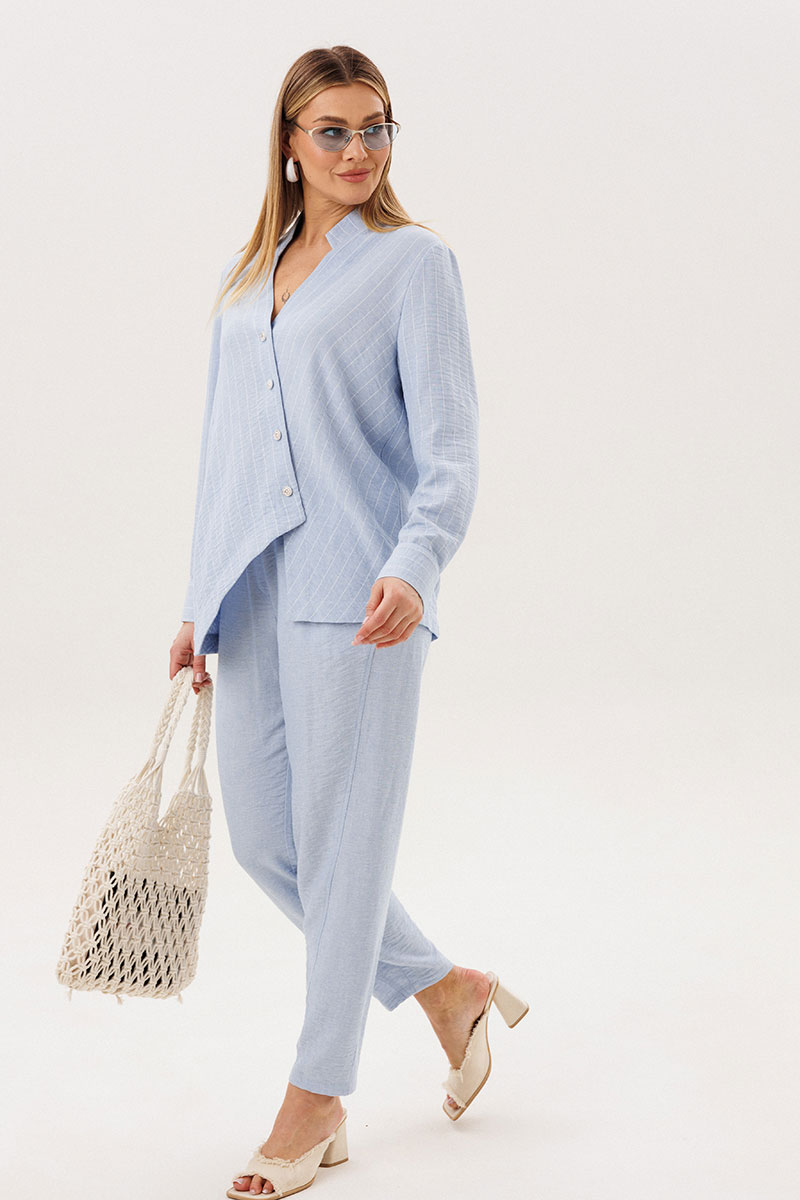 Лёгкий и элегантный брючный комплект в нежном голубом оттенке — идеальный выбор для тёплого сезона. Современный крой и натуральные фактуры создают гармоничный образ, сочетающий комфорт и утончённый стиль.