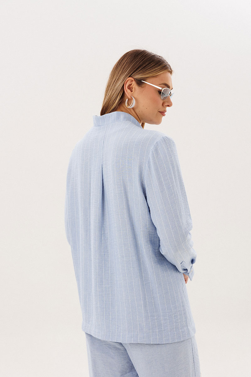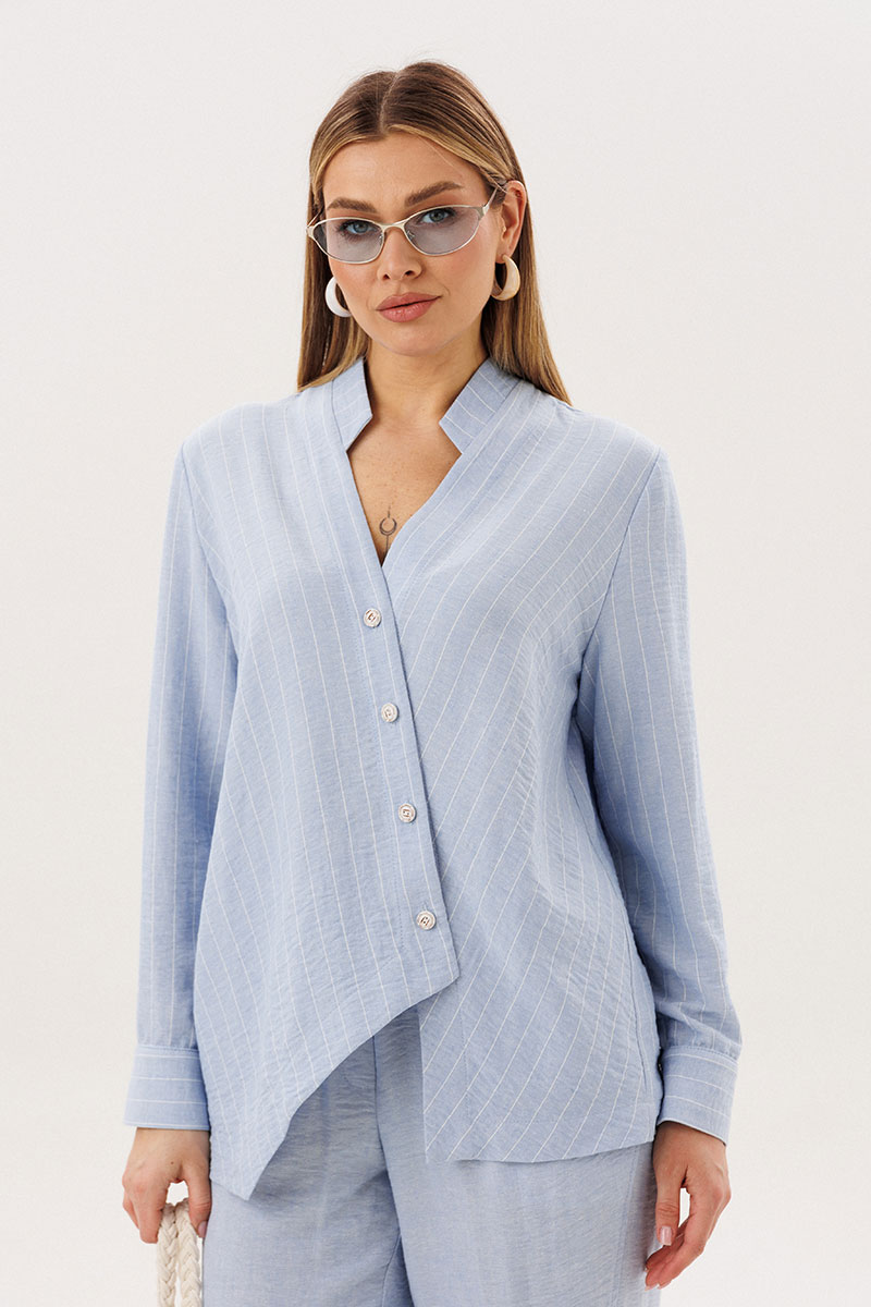 Рубашка выполнена из смесового полотна с добавлением льна, что обеспечивает отличную воздухопроницаемость и лёгкость. Тонкая полоска визуально вытягивает силуэт, а асимметричная линия низа и аккуратный ворот придают модели современный характер.