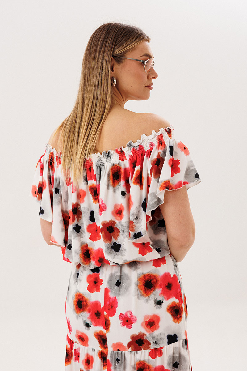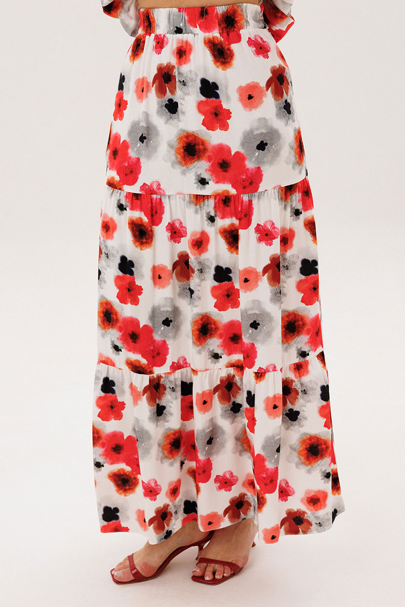Юбка А-образного силуэта, состоит из трёх горизонтальных воланов с лёгкой сборкой и на эластичном поясе.
