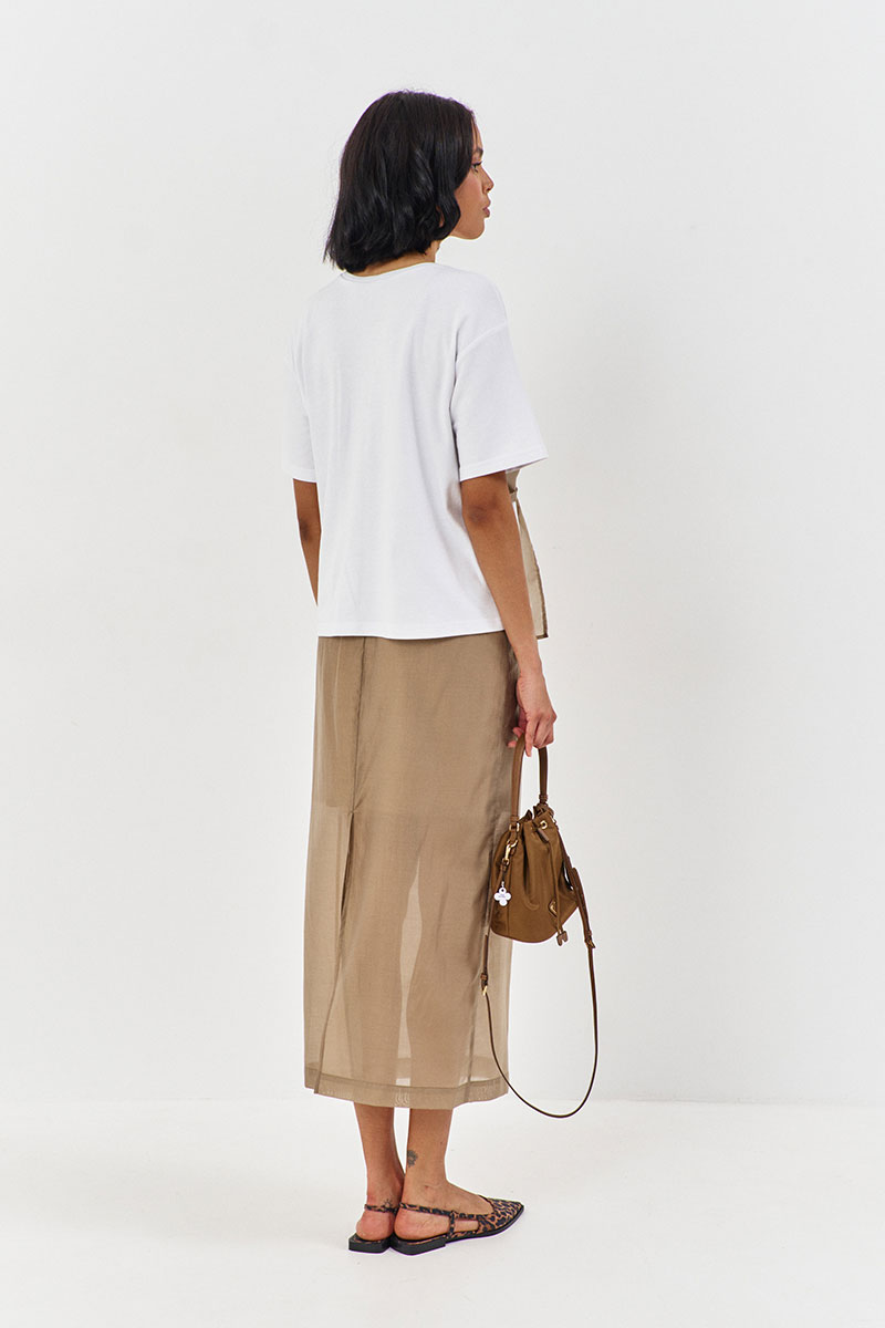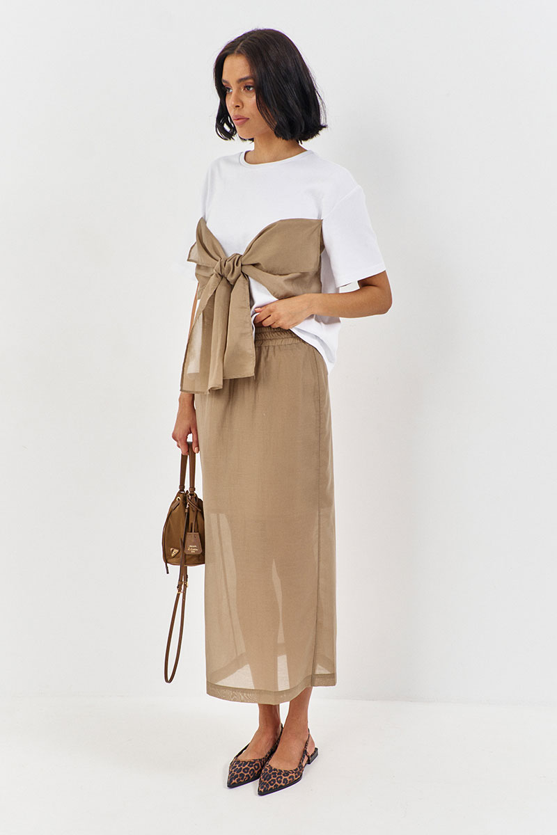 Юбка выполнена из блузочной ткани в цвете капучино, пояс обработан эластичной тесьмой (резинкой), по заднему полотнищу юбки обработан разрез.