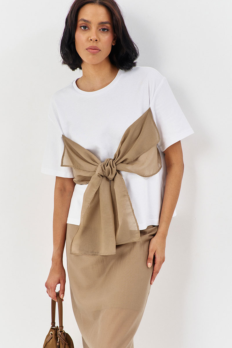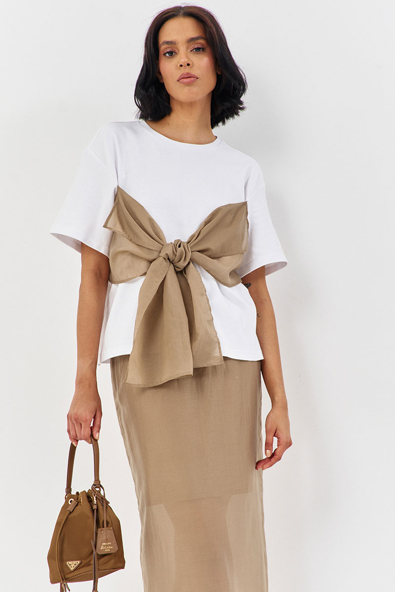 Майка свободного силуэта со спущенным рукавом. Характеристики: выполнена из трикотажного полотна в белом цвете, по переду декоративный бант в цвете капучино, горловина обработана планкой, рукав укороченный.