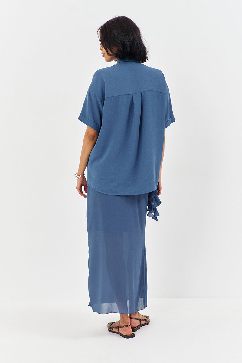 Блузка свободного силуэта, выполнена из плательной ткани в джинсовом цвете, центральная застежка на петли и пуговицы, по полочкам декоративный элемент ввиде воланов, по спинке отрезная кокетка и складка.