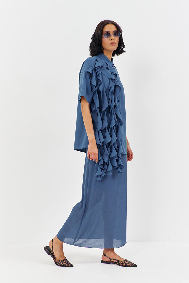 Юбка прямого силуэта в длине макси, выполнена из шифона-крэш в джинсовом цвете, юбка на подкладке, пояс обработан эластичной тесьмой (резинкой).