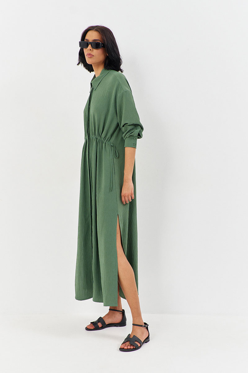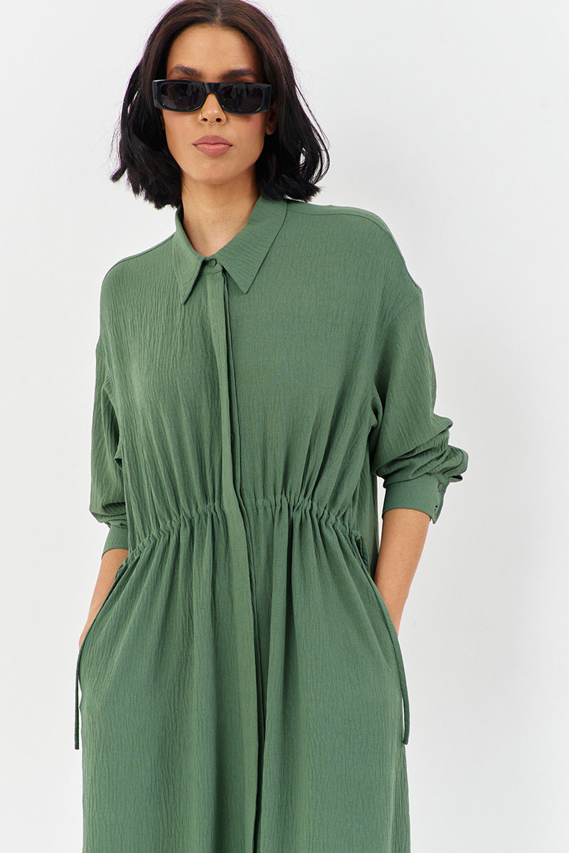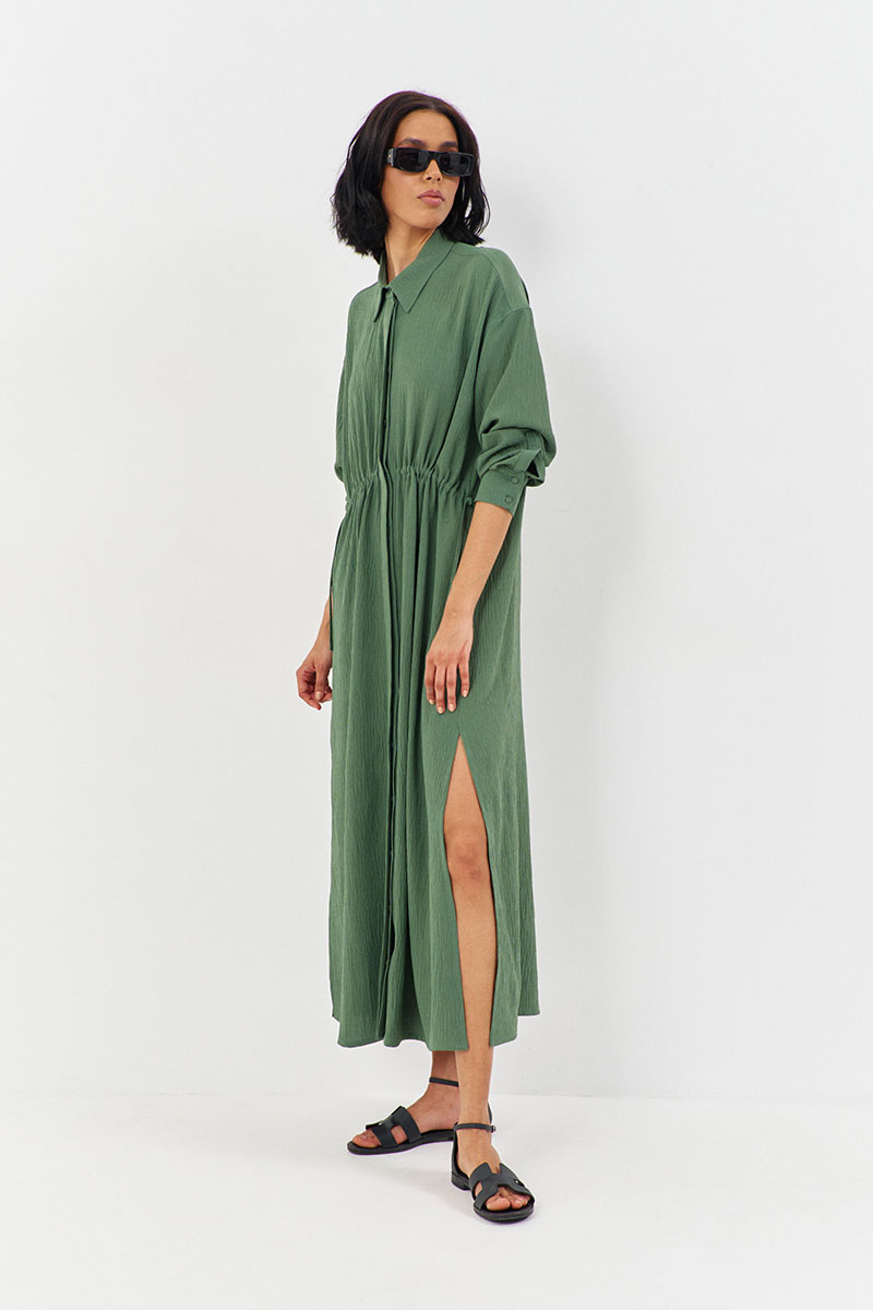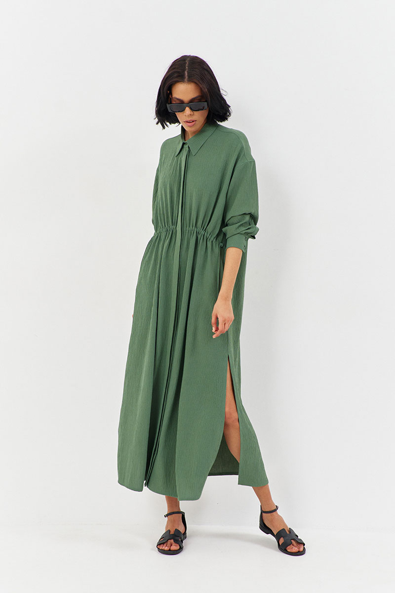 Платье свободного силуэта. Характеристики: выполнено из плательной ткани в цвете зеленый мох, по переду кулиса на талии, застежка потайная на петли и пуговицы, в боковых швах карманы, внизу боковых швов разрезы, низ рукава обработан манжетами на петли и пуговицы.