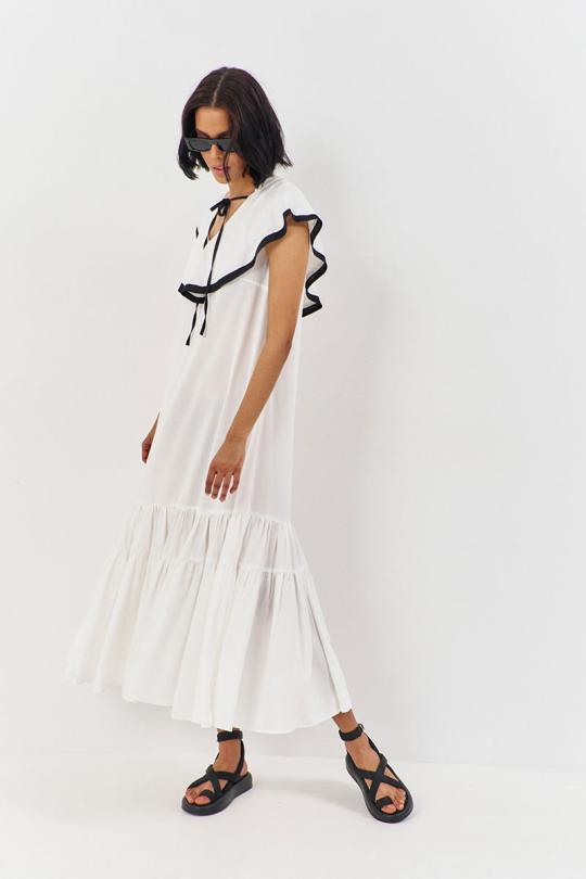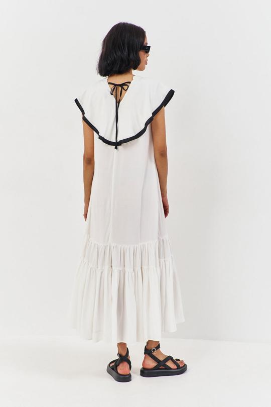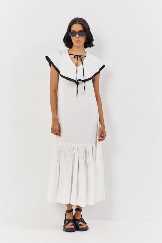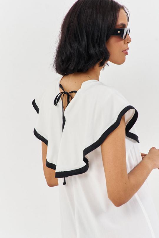Платье свободного силуэта. Характеристики: выполнено из плательной ткани в белом цвете с черной отделкой по волану горловины, по горловине переда и спинки декоративные завязки.