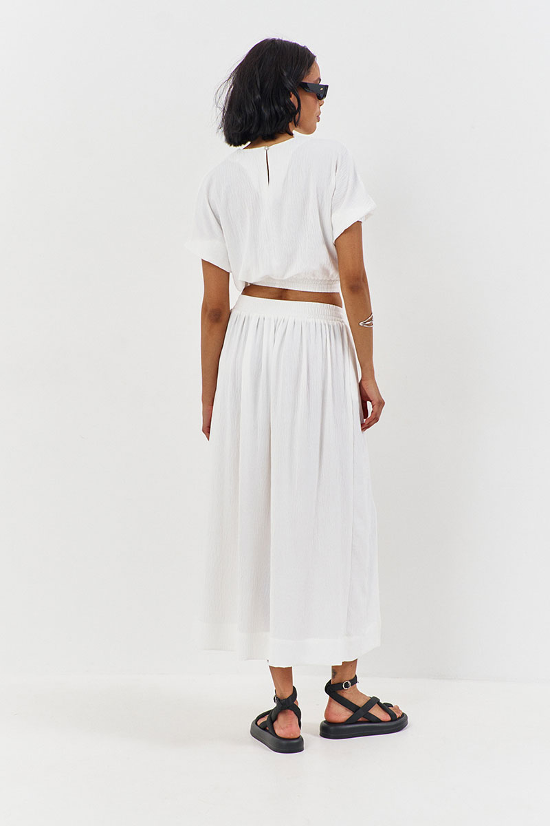 Топ свободного силуэта с резинкой по низу и рукавам. Характеристики: выполнен из плательной ткани в молочном цвете, по низу и рукавам резинка, по горловине спинки разрез на петлю и пуговицу.