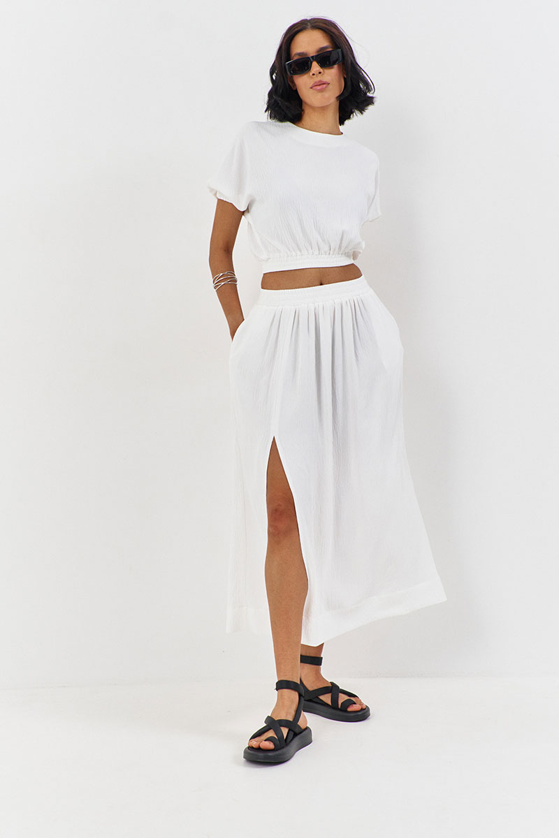 Юбка свободного силуэта. Выполнена из плательной ткани в молочном цвете, по переду разрез, в боковых швах карманы. Пояс юбки на резинке.