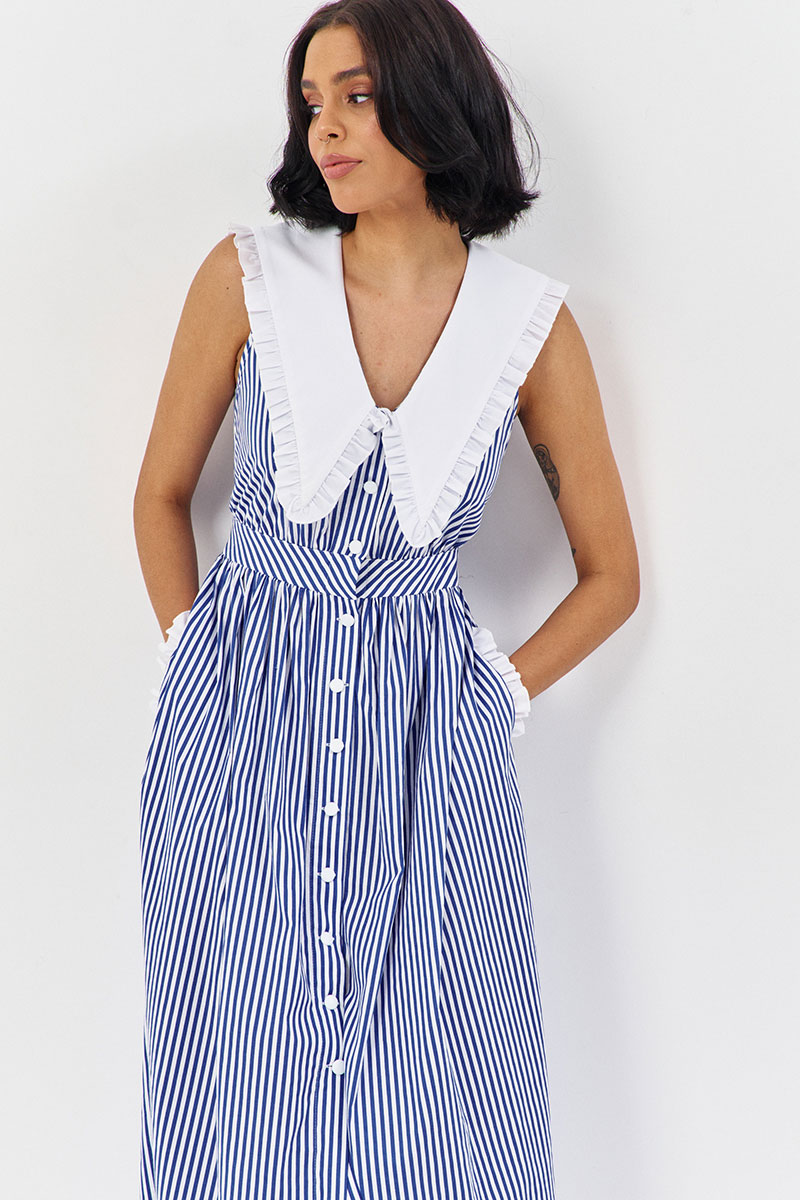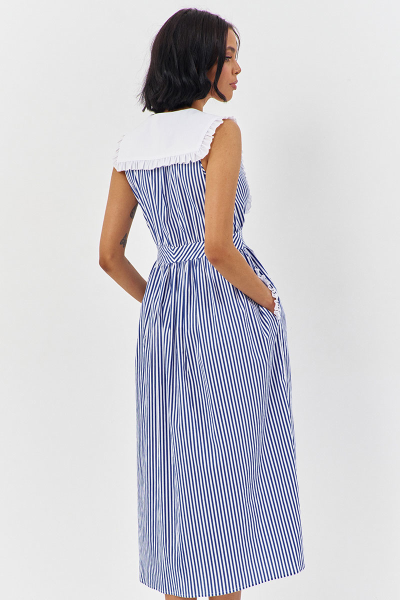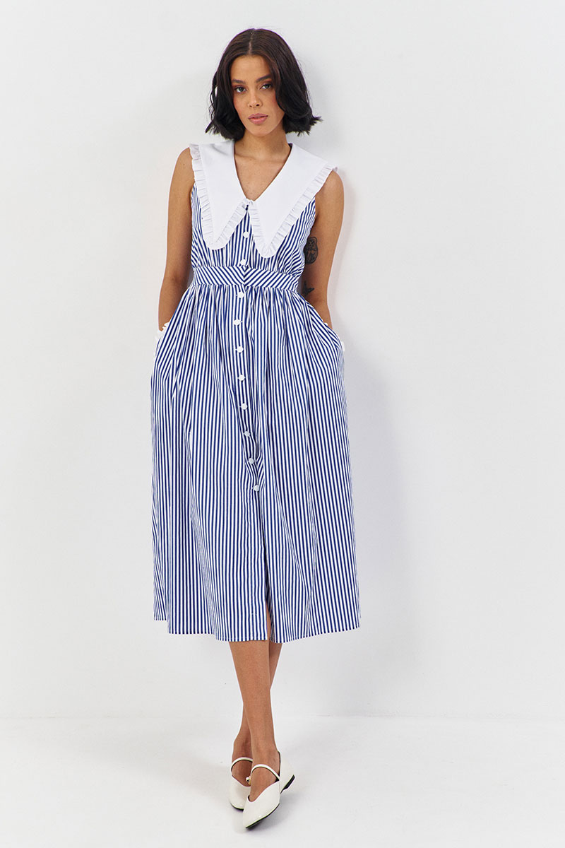 Платье с отложным воротником. Характеристики: выполнено из плательной ткани в сине-белую полоску, с застежкой на петли и пуговицы, по талии сборка, воротник отложной из белой отделочной ткани, в боковых швах карманы.