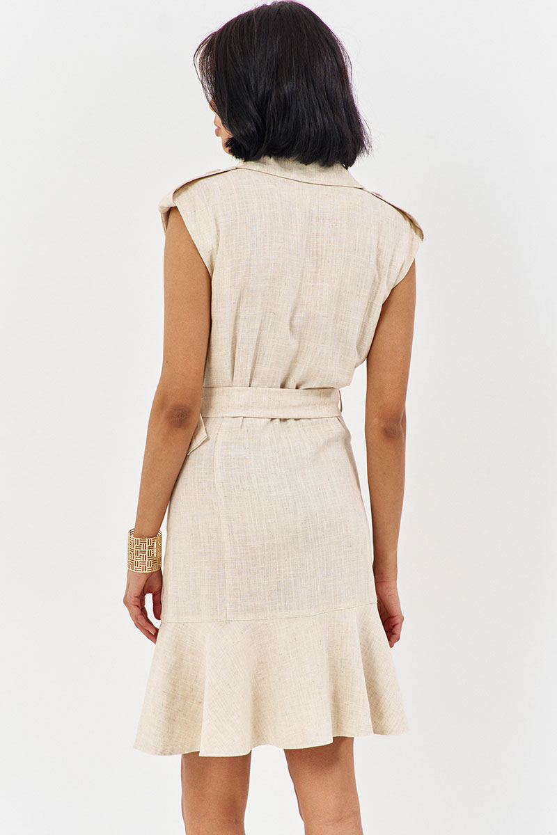Платье-тренч с кокетками и воланом. Характеристики: выполнено из плательной ткани в бежевом цвете, со смещенной застежкой на петли и пуговицы, по переду отлетные кокетки, волан по переду и спинке, пояс съемный, по плечам паты.