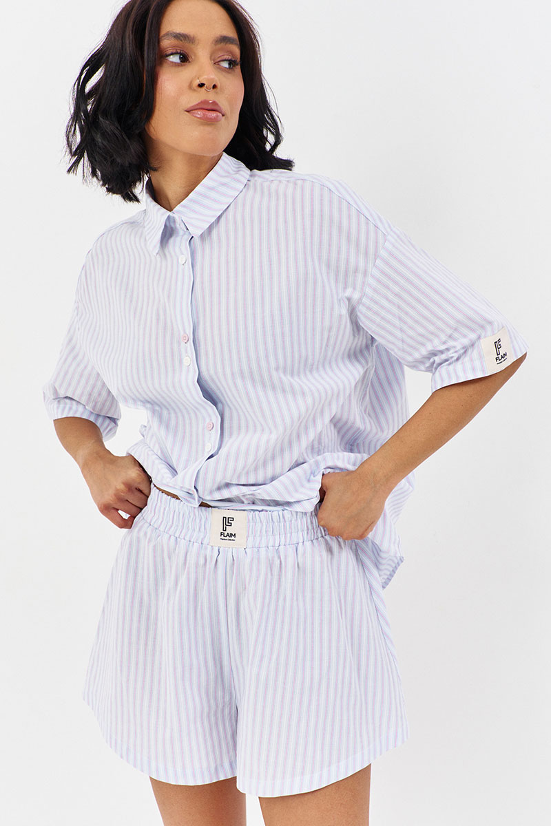 Шорты свободного силуэта. Выполнены из рубашечной ткани в голубую полоску. Пояс на резинке.