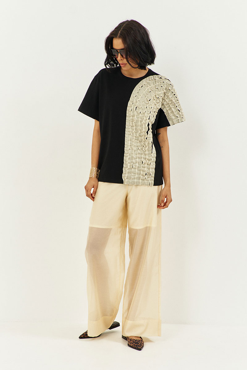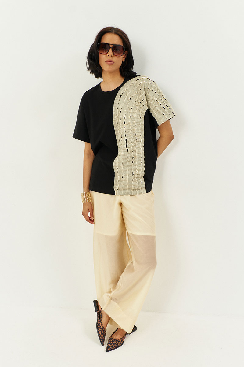 Майка свободного силуэта со спущенным рукавом. Характеристики: выполнена из трикотажного полотна в черном цвете, по переду декоративные детали в цвет брюк, горловина обработана планкой, рукав укороченный.