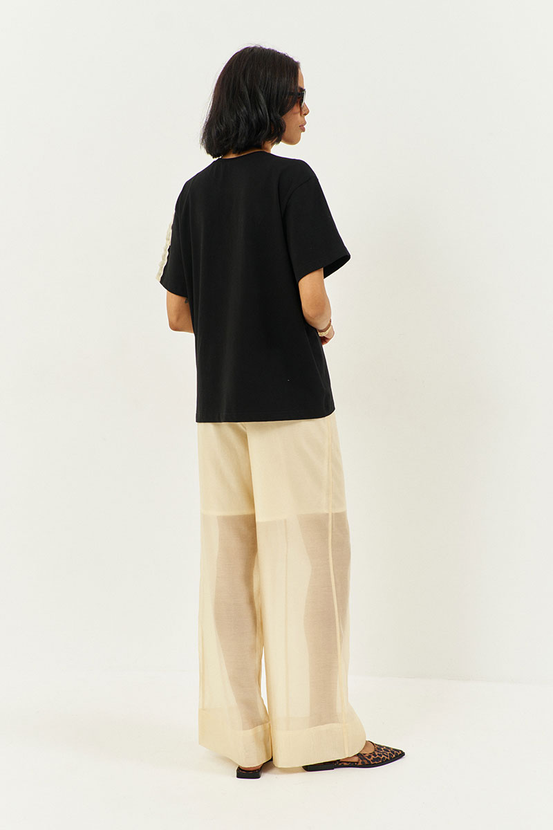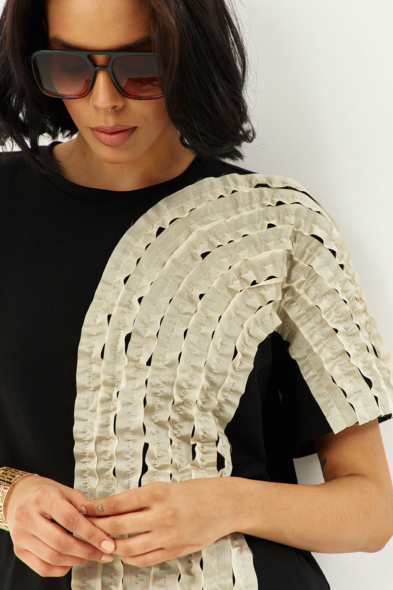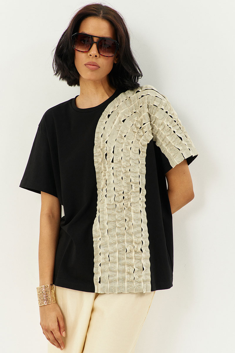 Майка свободного силуэта со спущенным рукавом. Характеристики: выполнена из трикотажного полотна в черном цвете, по переду декоративные детали в цвет брюк, горловина обработана планкой, рукав укороченный.