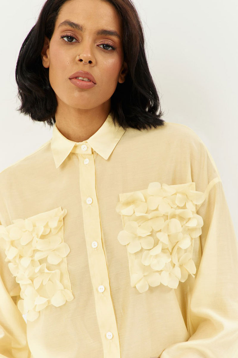 Блузка свободного силуэта с декоративными карманами по переду. Характеристики: выполнена из блузочной ткани в цвете сливочное масло, центральная застежка на петли и пуговицы, по переду карманы с декоративными цветами, по спинке отрезная кокетка.