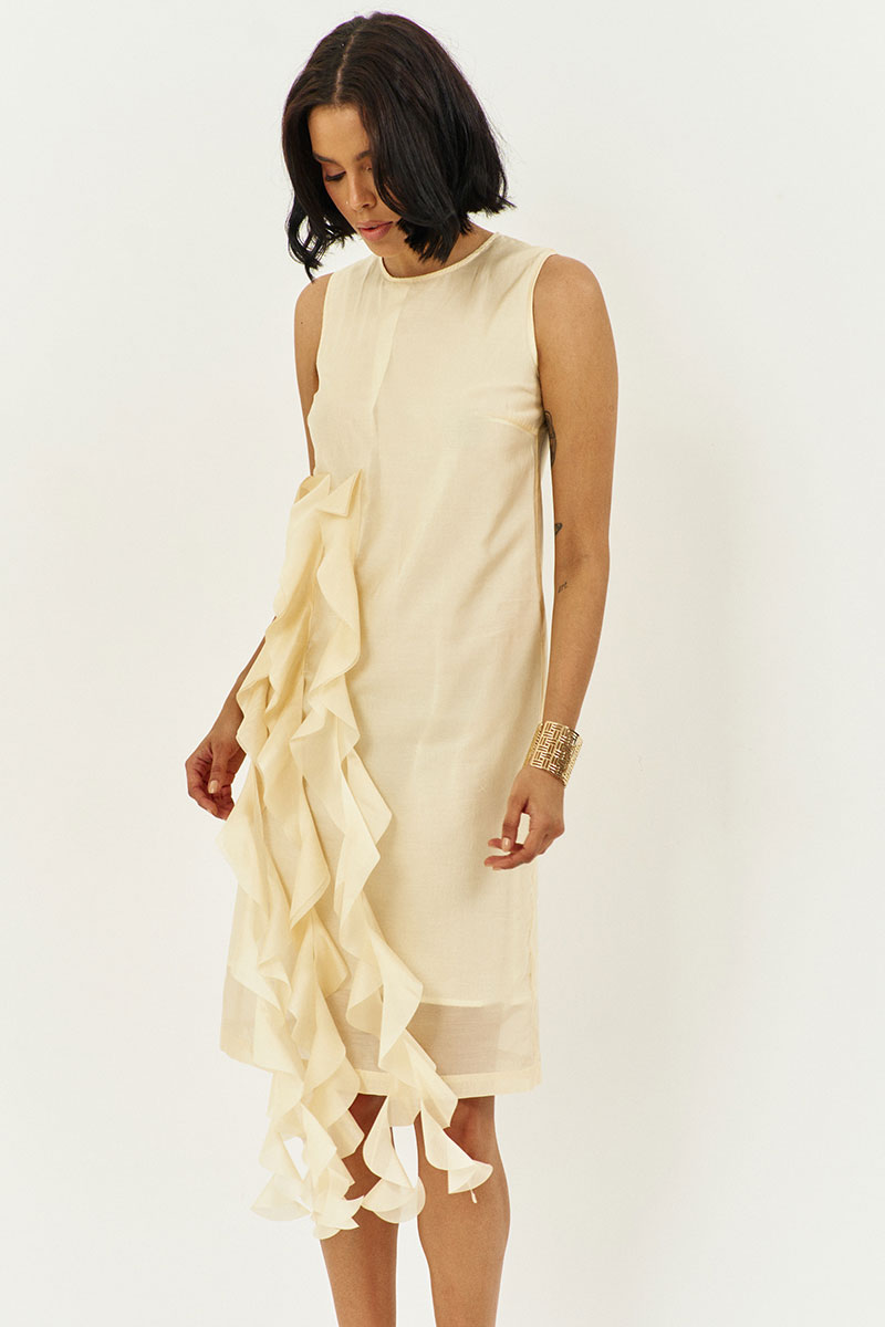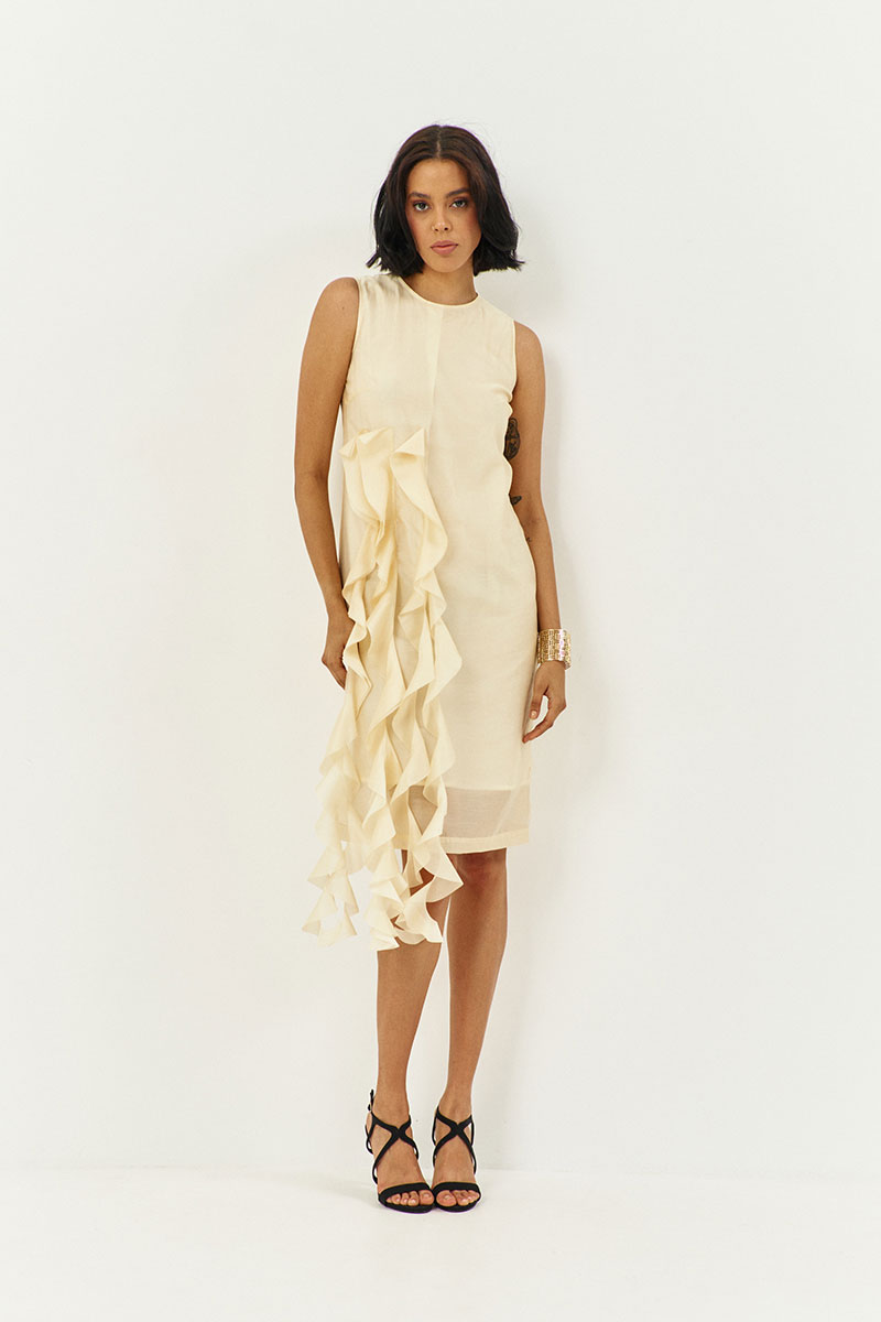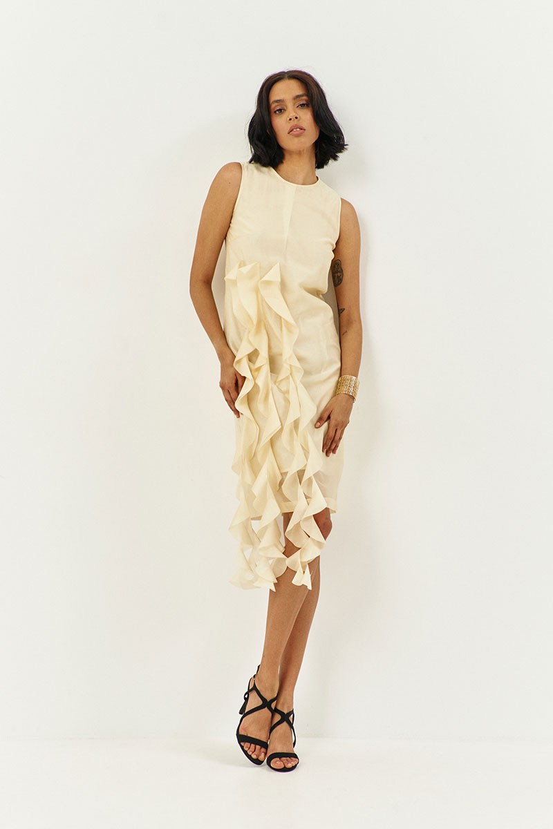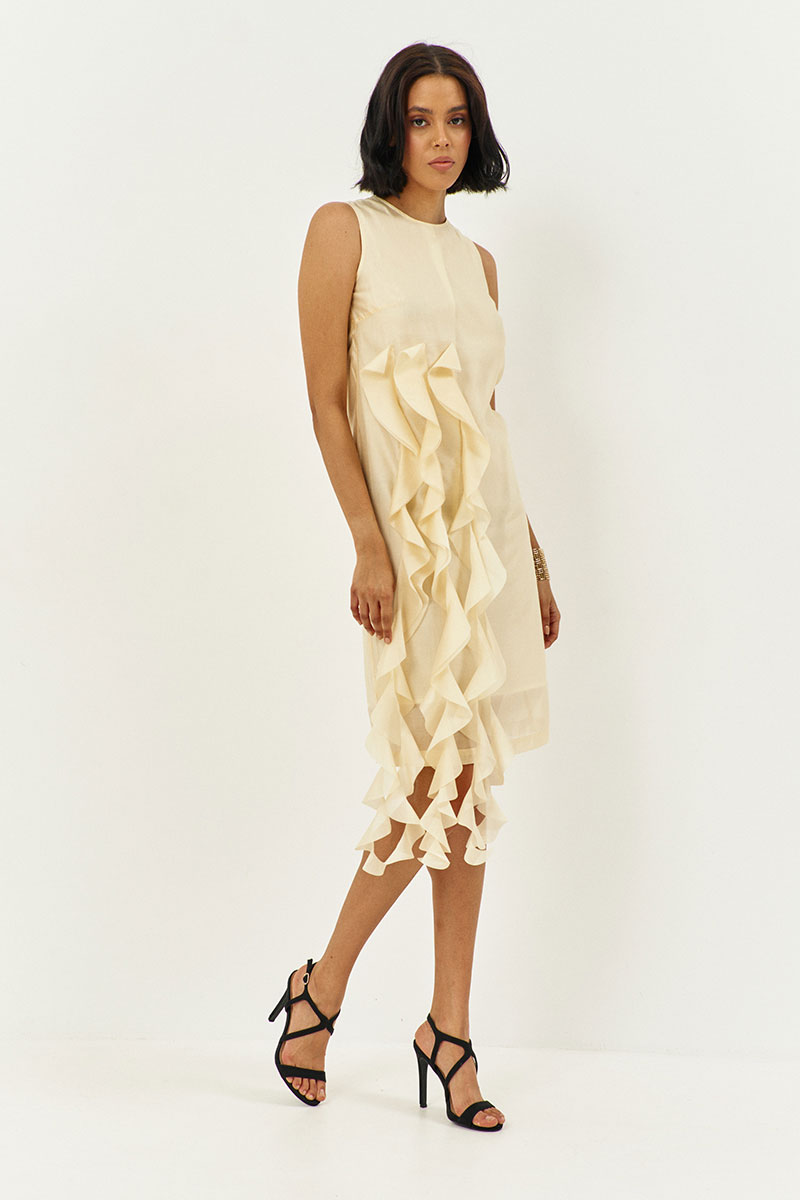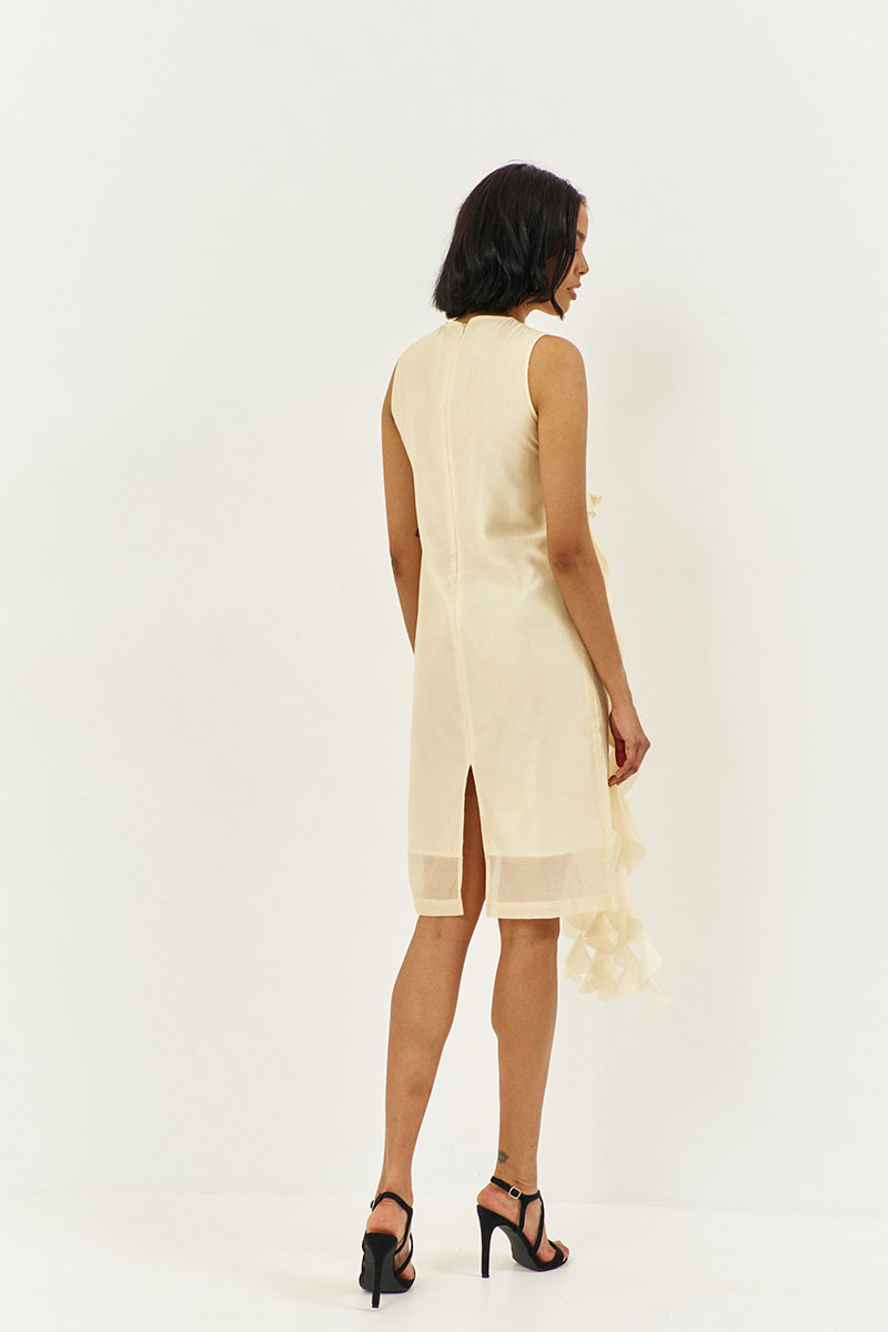 Платье прямого силуэта на подкладке. Характеристики: выполнено из плательной ткани в цвете сливочное масло, по переду декоративные воланы, по спинке потайная застежка-молния.