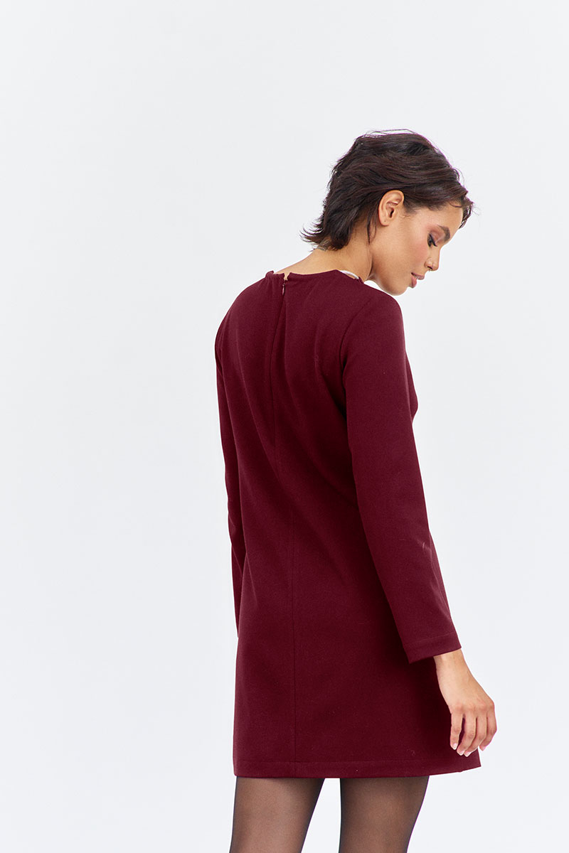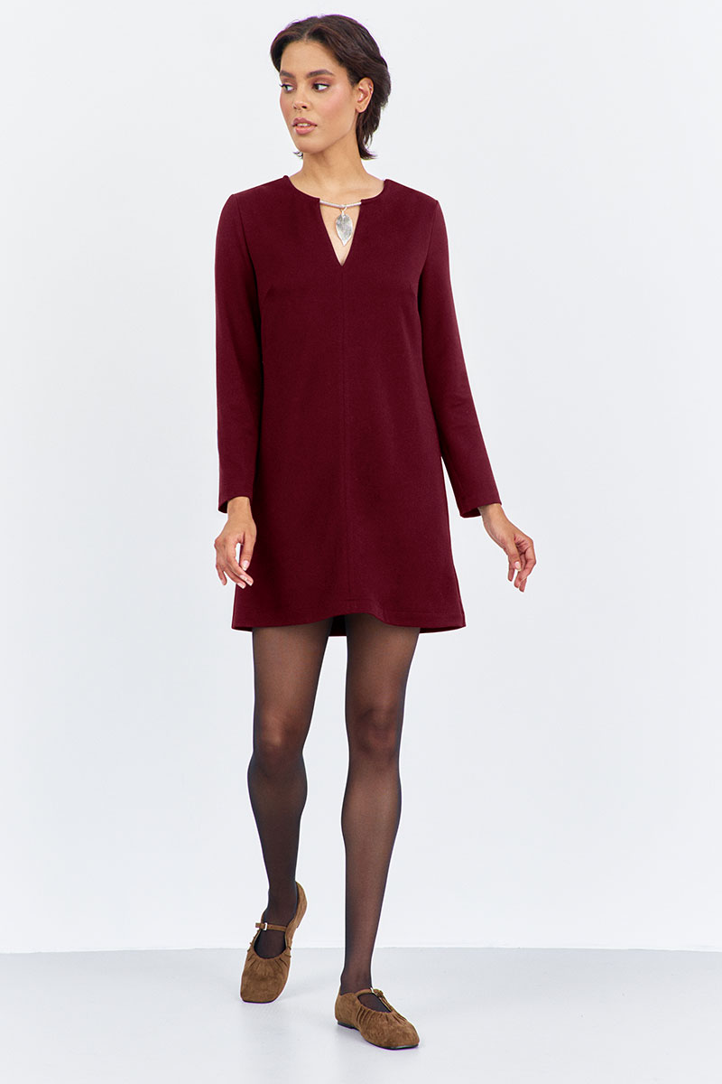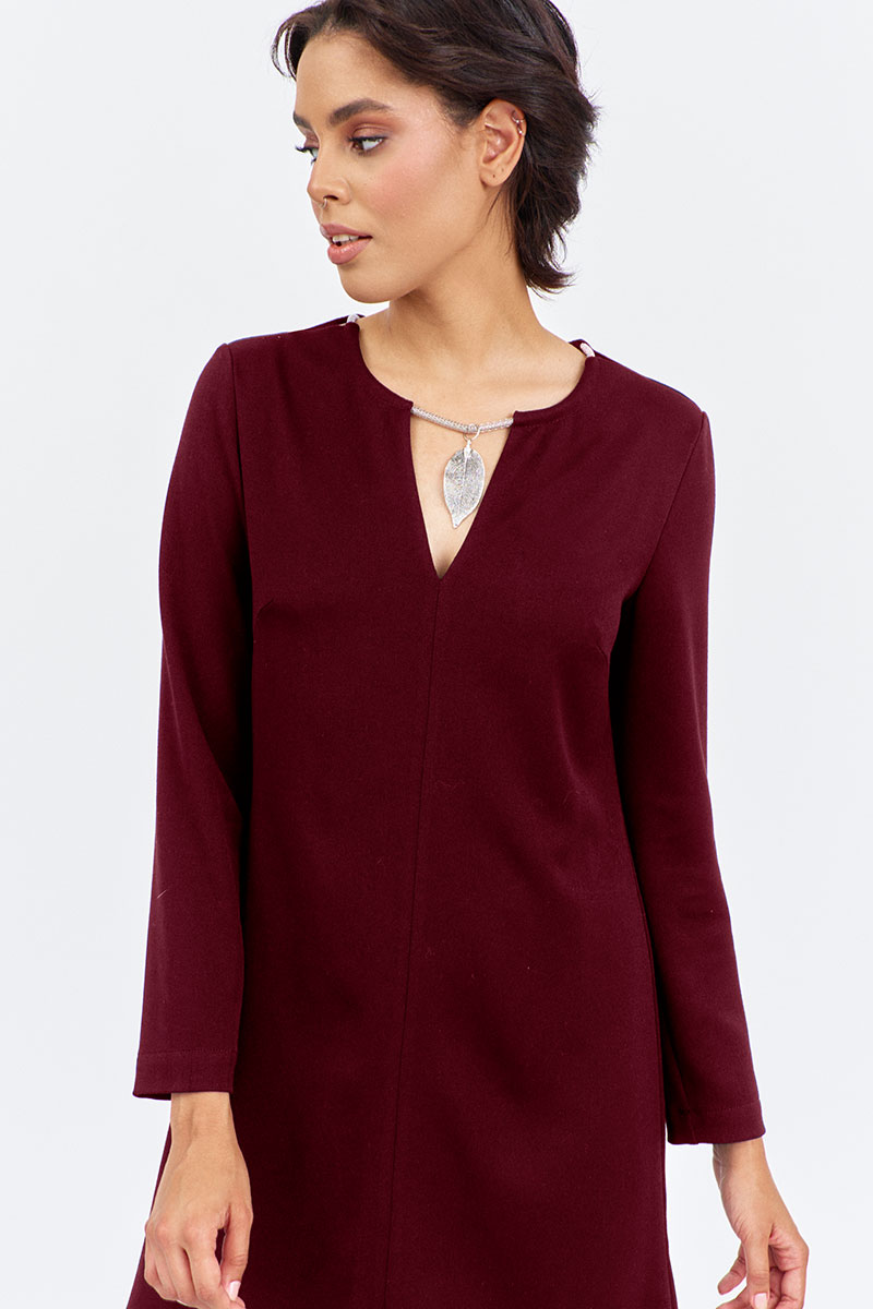 Платье прямого силуэта. Характеристики: выполнено из плательной ткани в бордовом цвете, по горловине переда и спинки декоративный элемент с цепочкой и подвеской, спинка разрезная на потайную застежку-молнию.