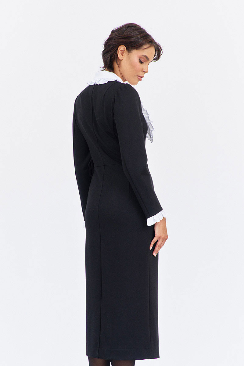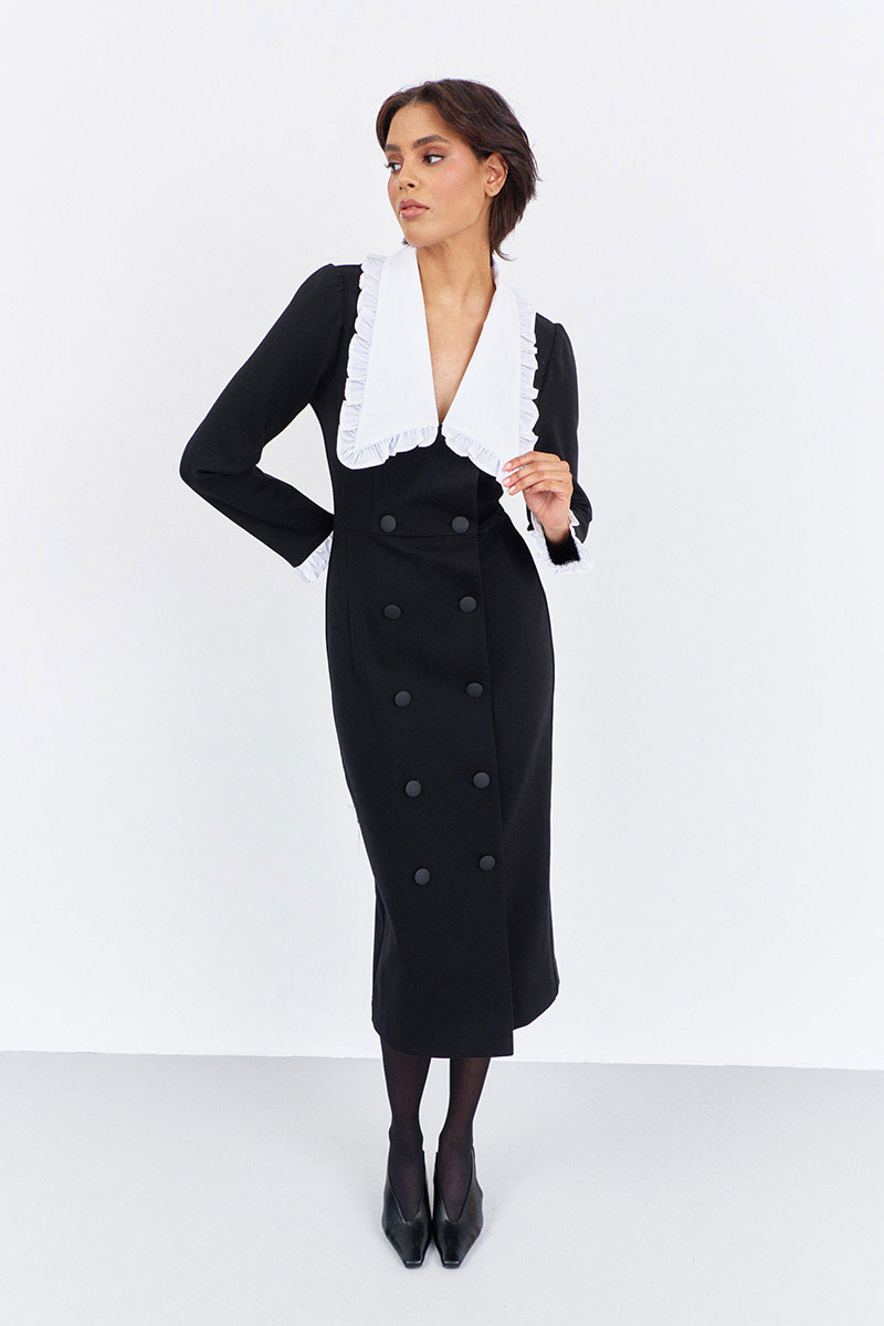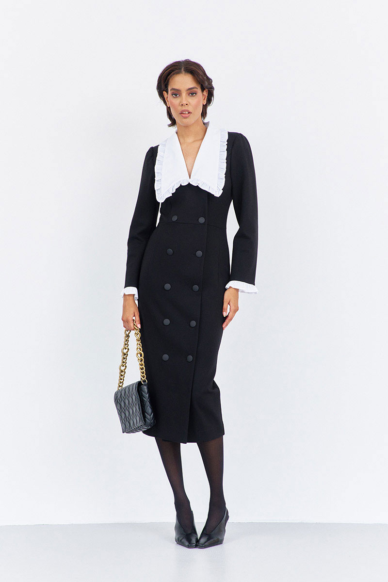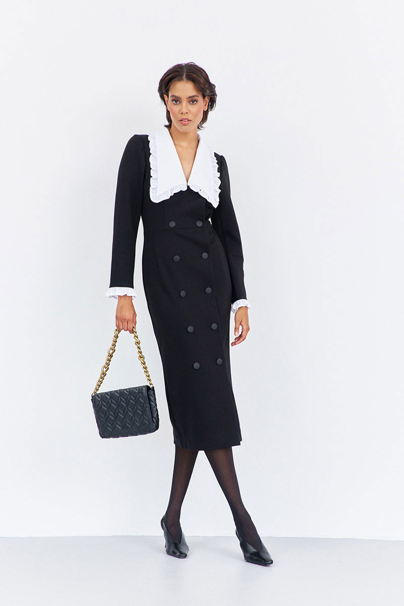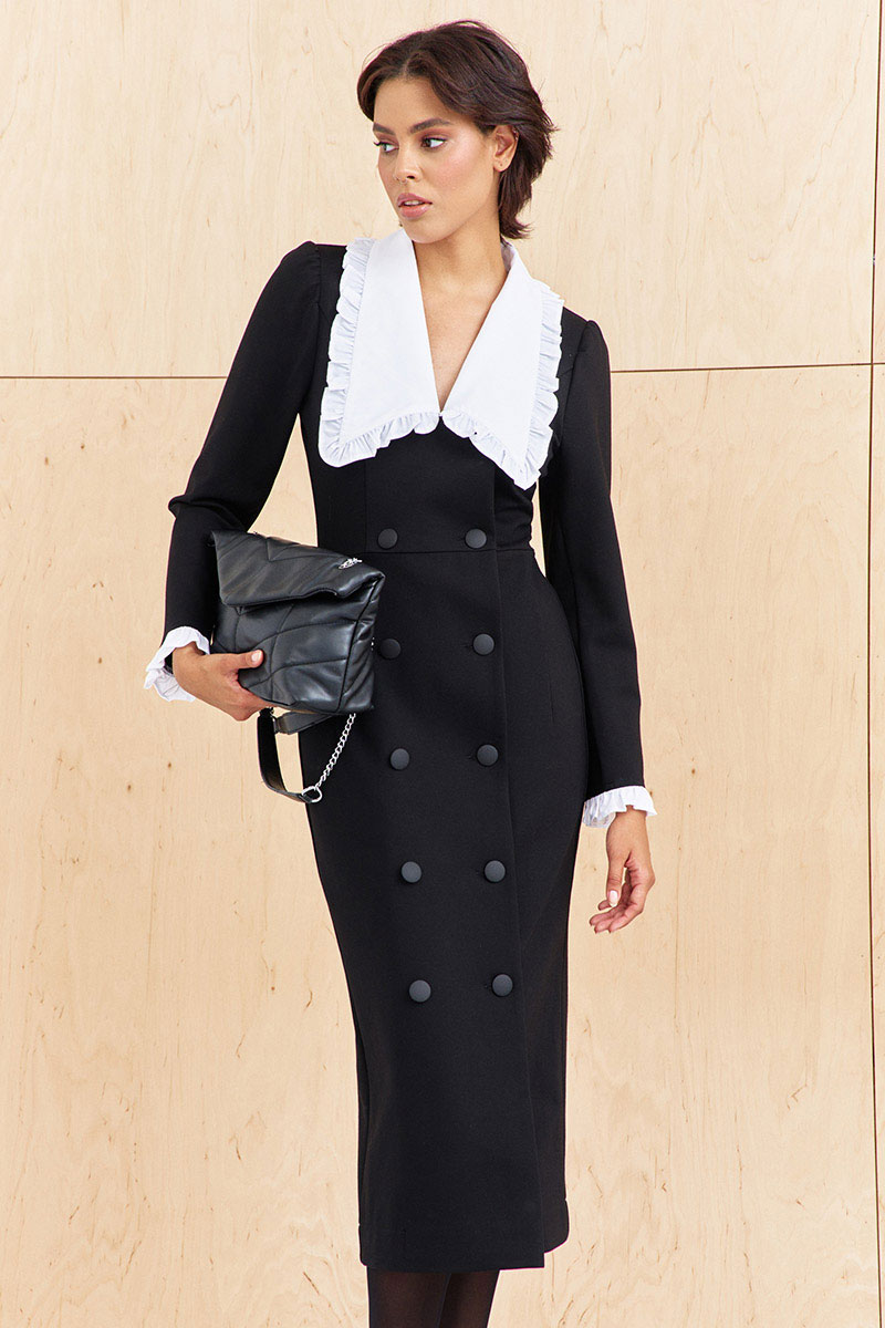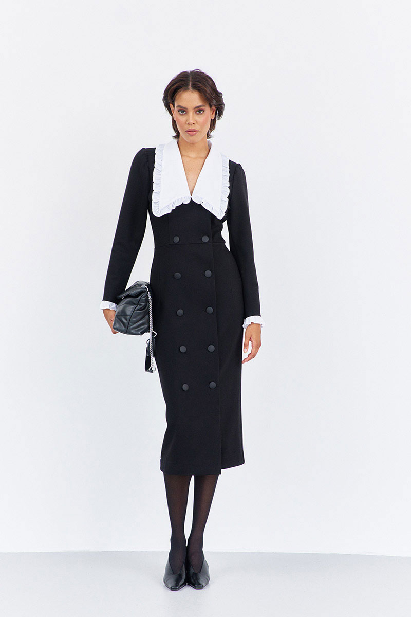Платье приталенного силуэта со смещенной застежкой. Характеристики: выполнено из плательной ткани в черном цвете, воротник отложной отстегивающийся в белом цвете, застежка-смещенная на петли и пуговицы, по рукаву отстегивающиеся манжеты в белом цвете.