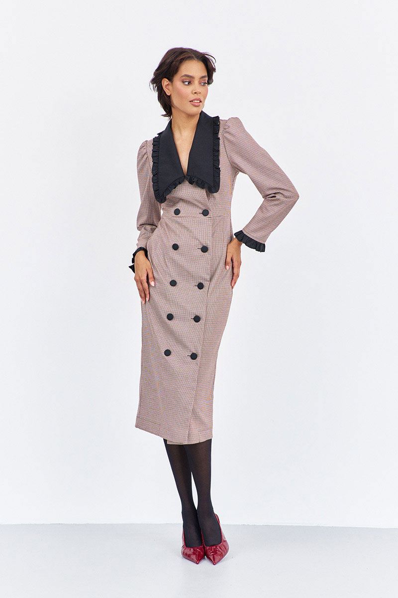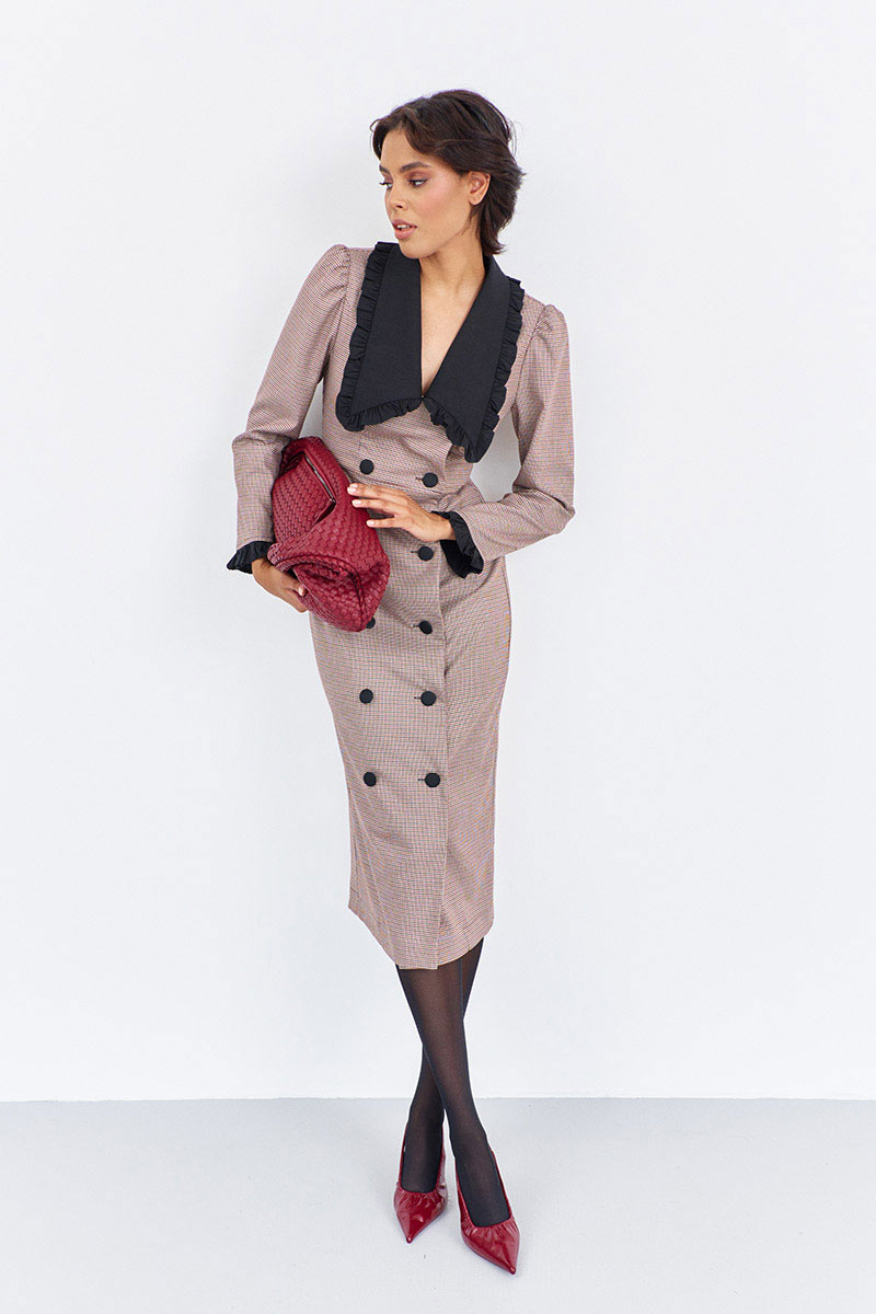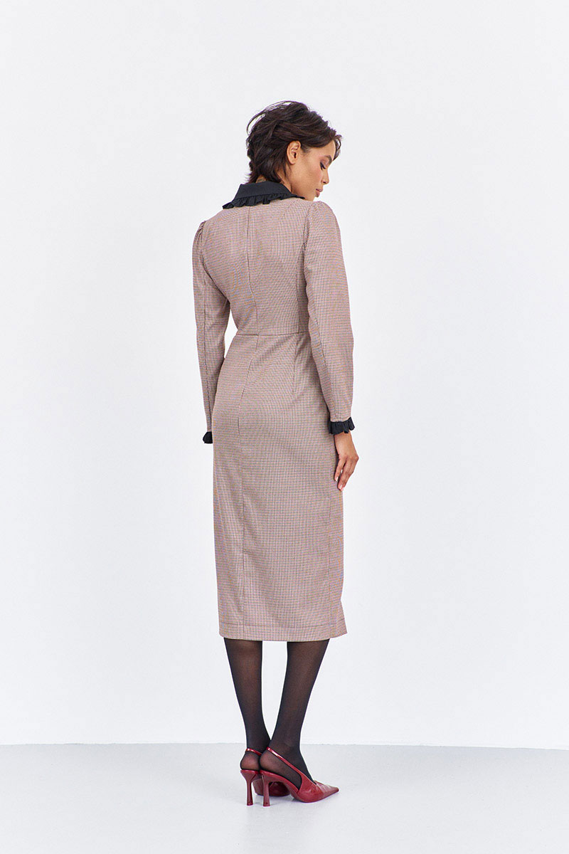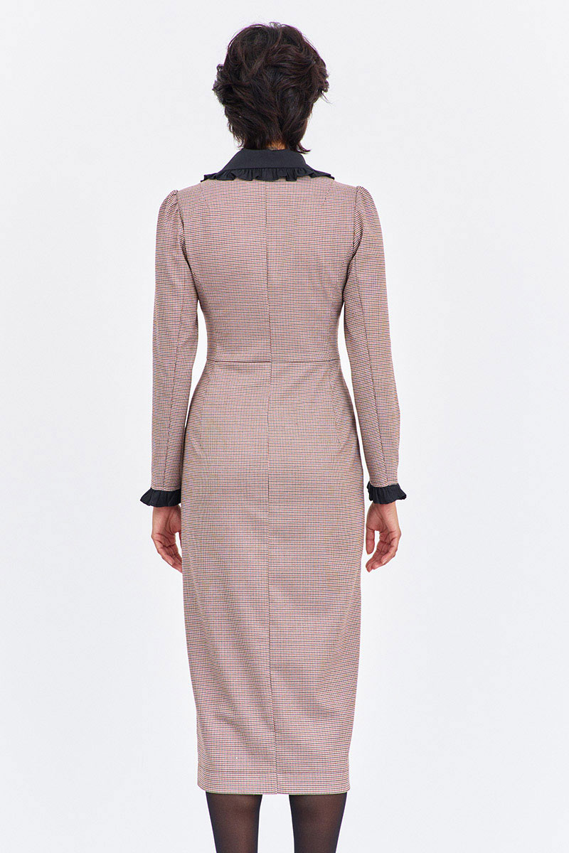 Платье приталенного силуэта со смещенной застежкой. Характеристики: выполнено из плательной ткани в принте "гусиная лапка" пыльная роза, воротник отложной в черном цвете, застежка-смещенная на петли и пуговицы, по рукаву декоративные манжеты в черном.