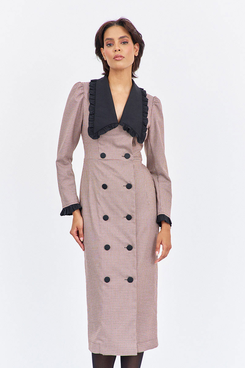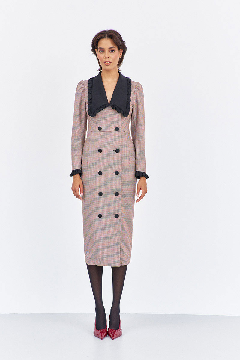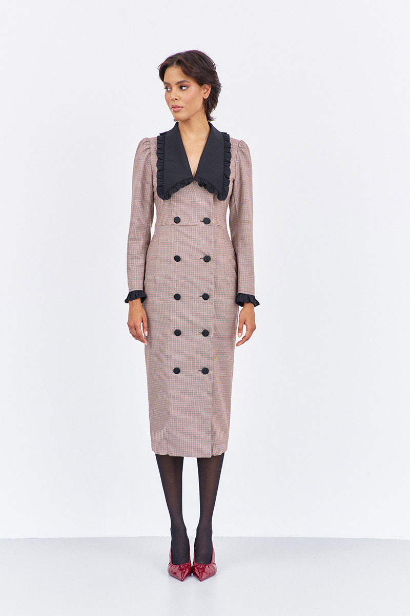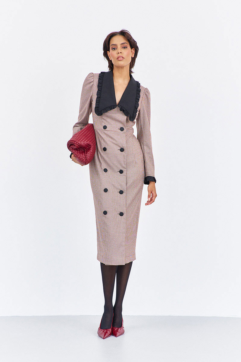 Платье приталенного силуэта со смещенной застежкой. Характеристики: выполнено из плательной ткани в принте "гусиная лапка" пыльная роза, воротник отложной в черном цвете, застежка-смещенная на петли и пуговицы, по рукаву декоративные манжеты в черном.