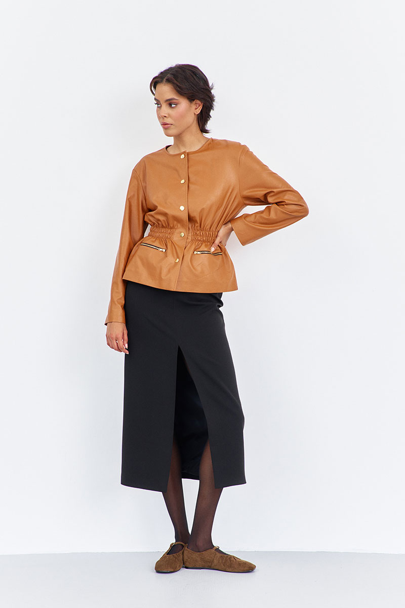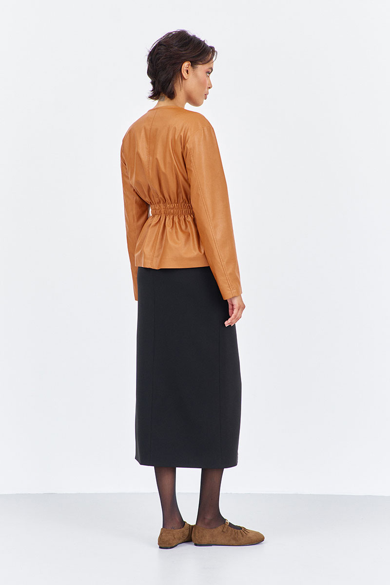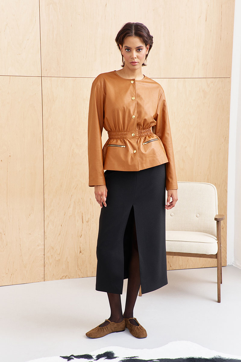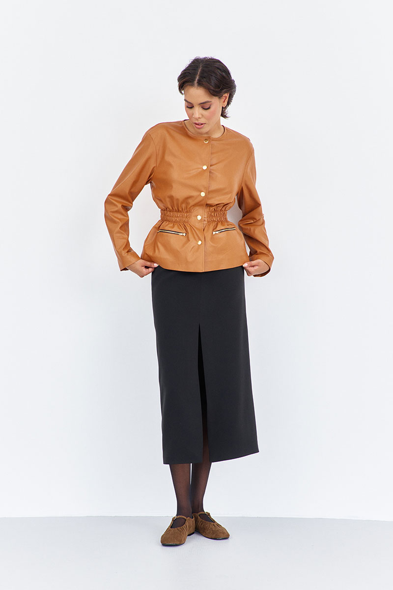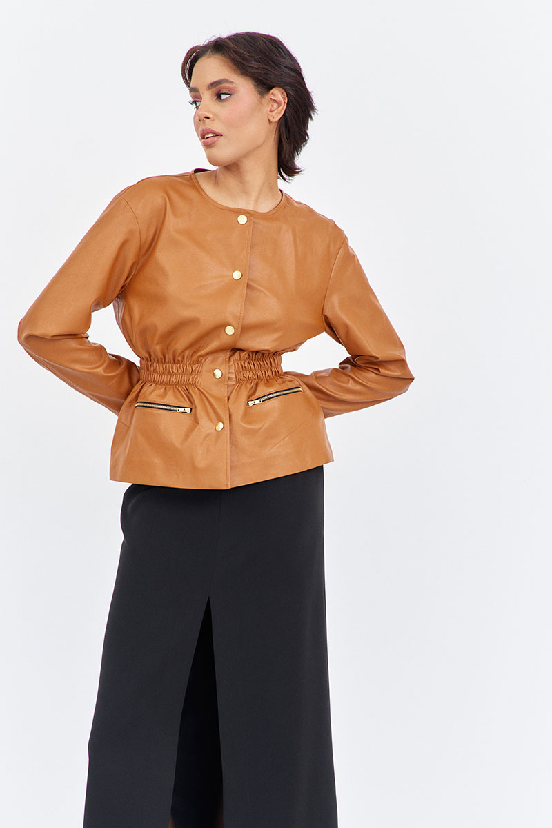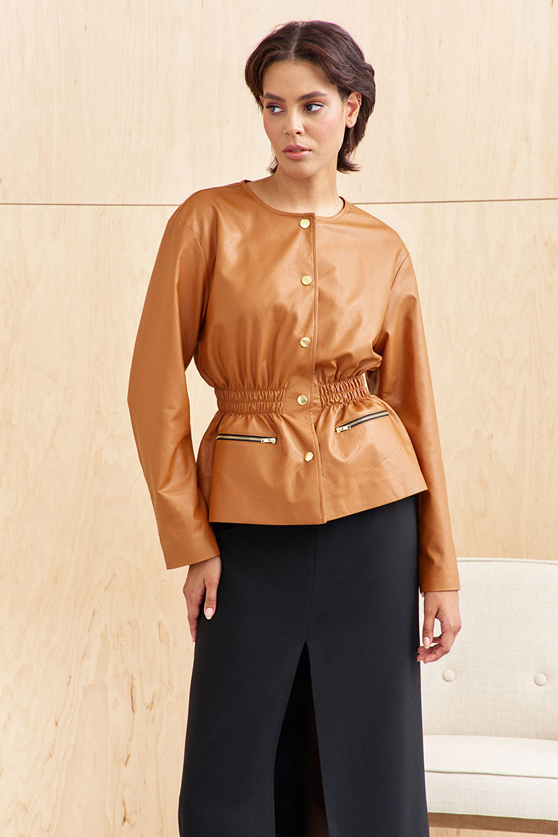 Жакет приталенного силуэта с карманами по переду. Характеристики: выполнен из искусственной кожи в цвете кэмел, центральная застежка на кнопки, по талии резинка.