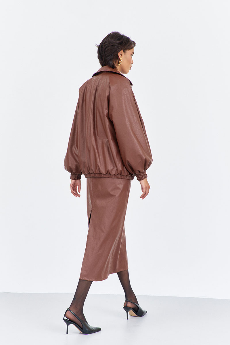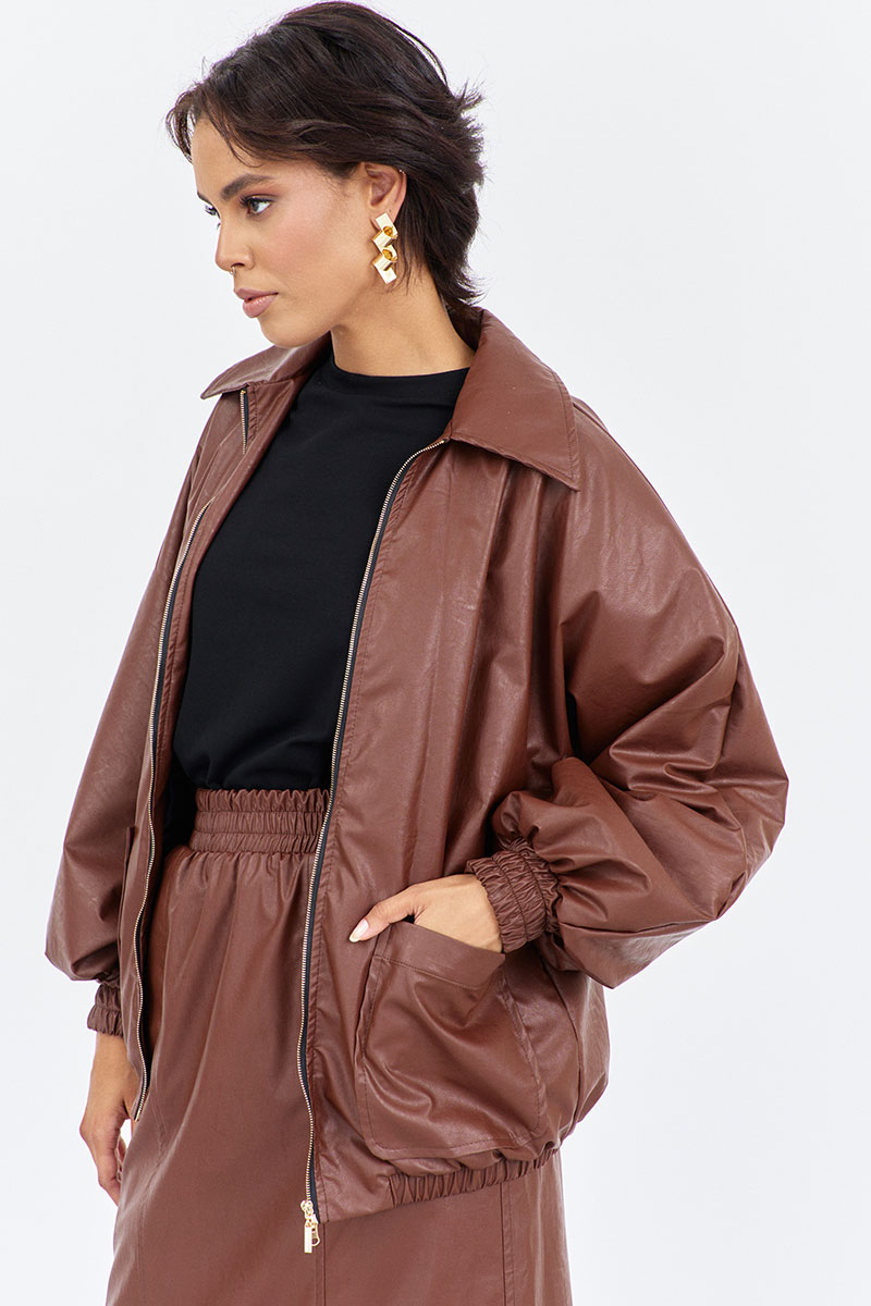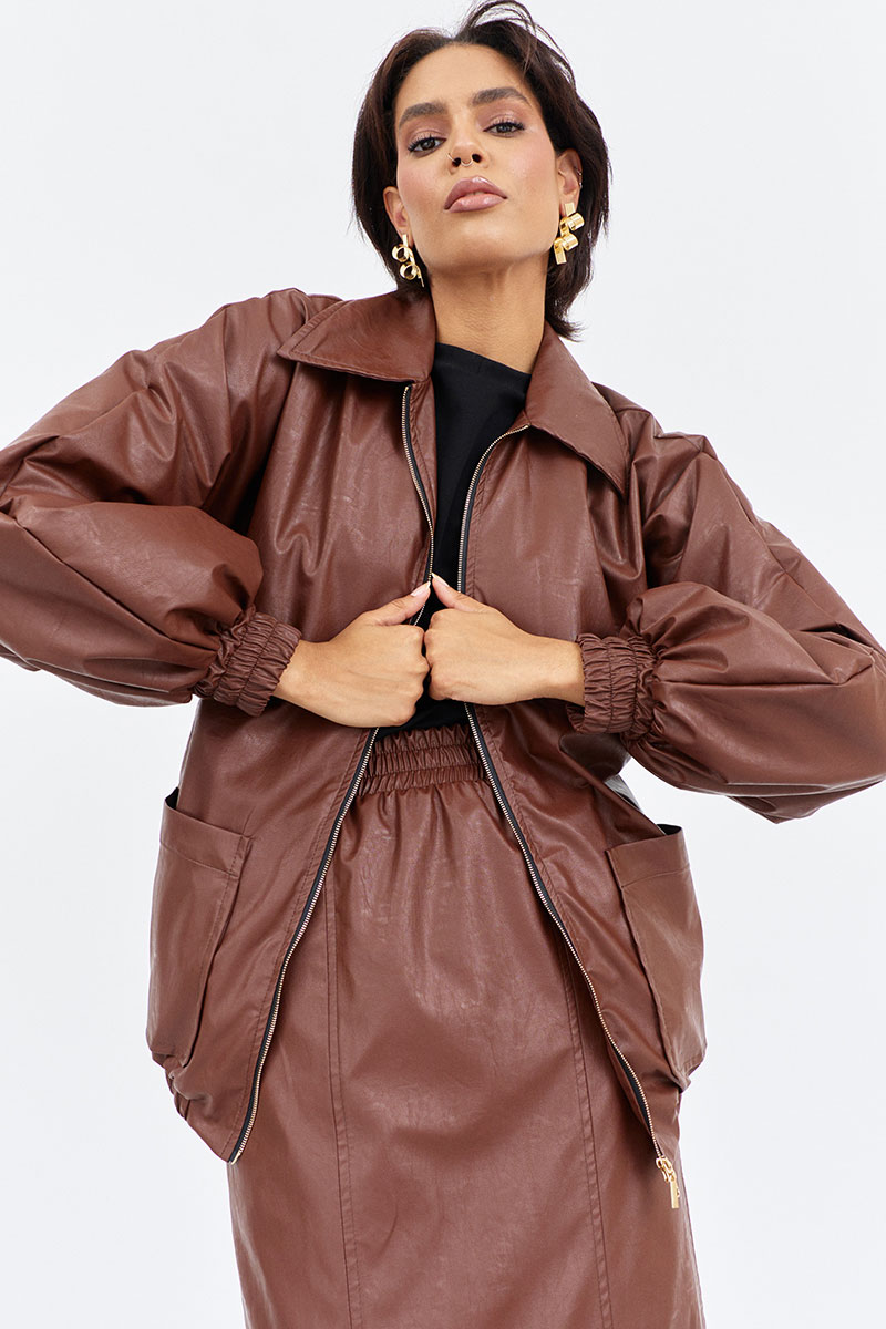 Бомбер свободного кроя на подкладке. Характеристики: выполнен из искусственной кожи в цвете шоколад, застежка-молния, по переду накладные карманы, рукава цельнокроенные на манжете, воротник рубашечного типа.