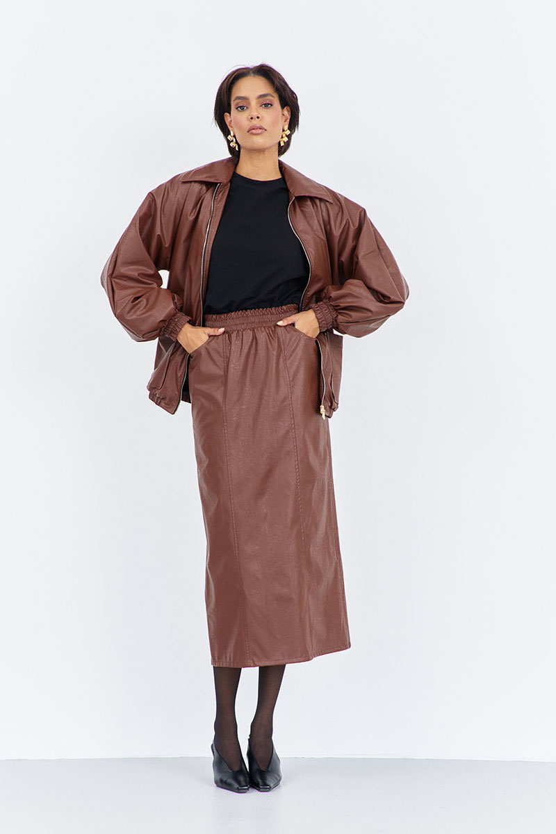 Юбка выполнена из искусственной кожи в цвете шоколад, пояс обработан эластичной тесьмой (резинкой), по заднему полотнищу юбки обработан разрез.