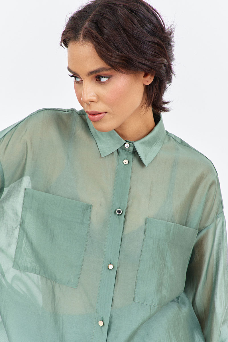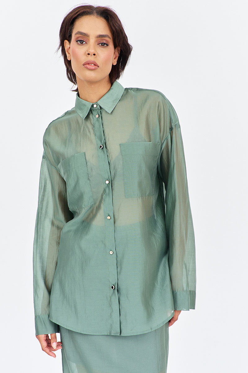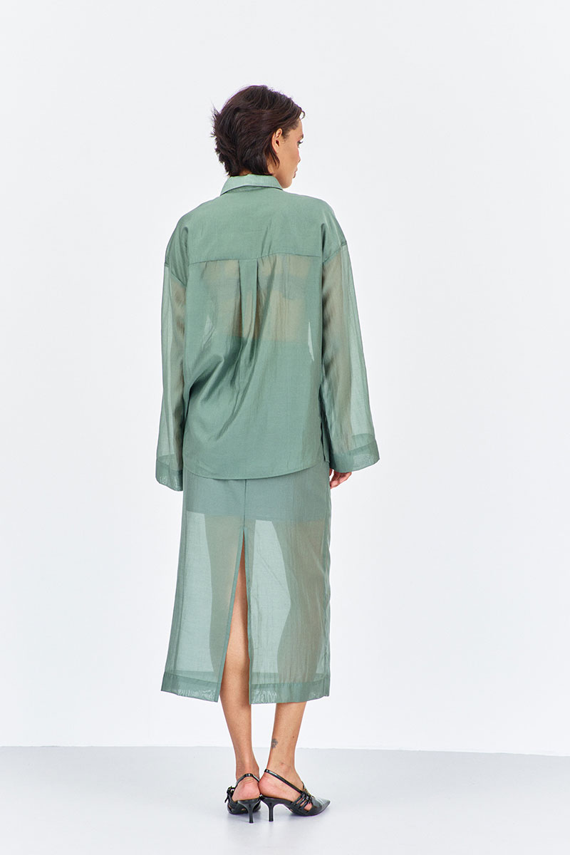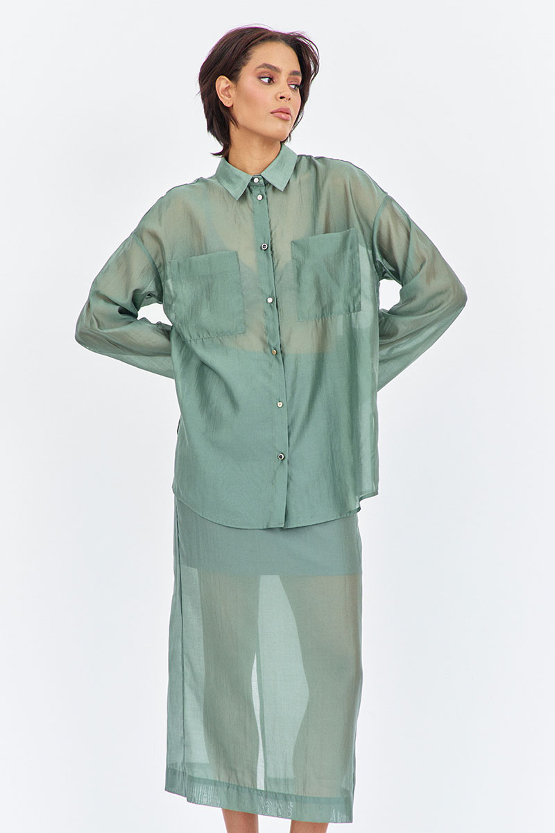 Комплект блузка свободного силуэта с юбкой. Характеристики: выполнена из блузочной ткани в цвете зеленый мох, центральная застежка на петли и пуговицы, по переду карманы, по спинке отрезная кокетка.