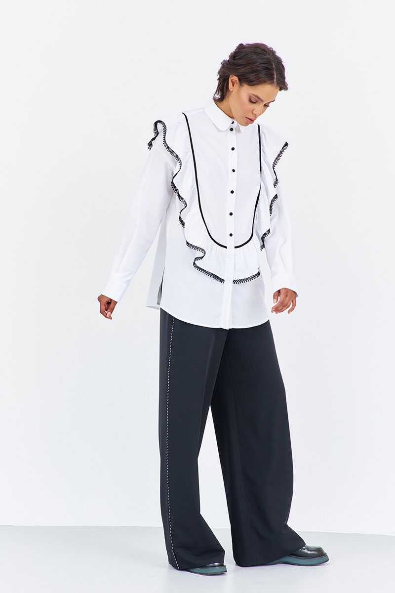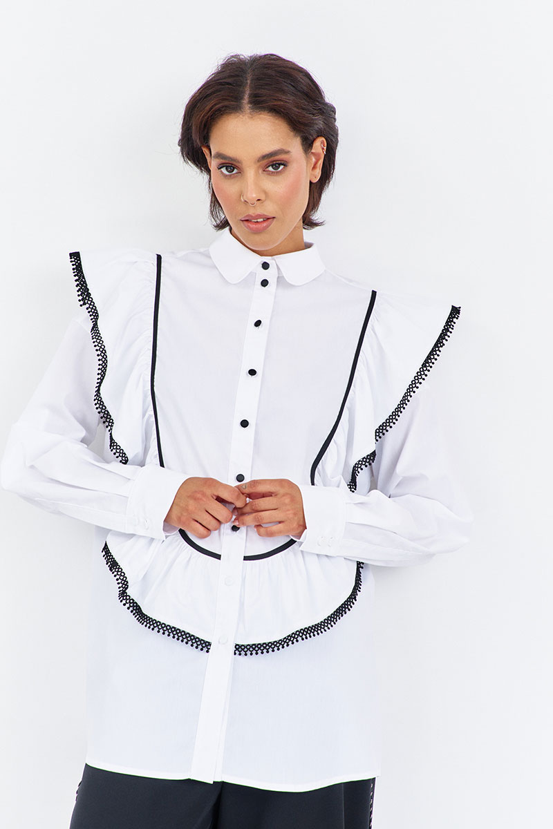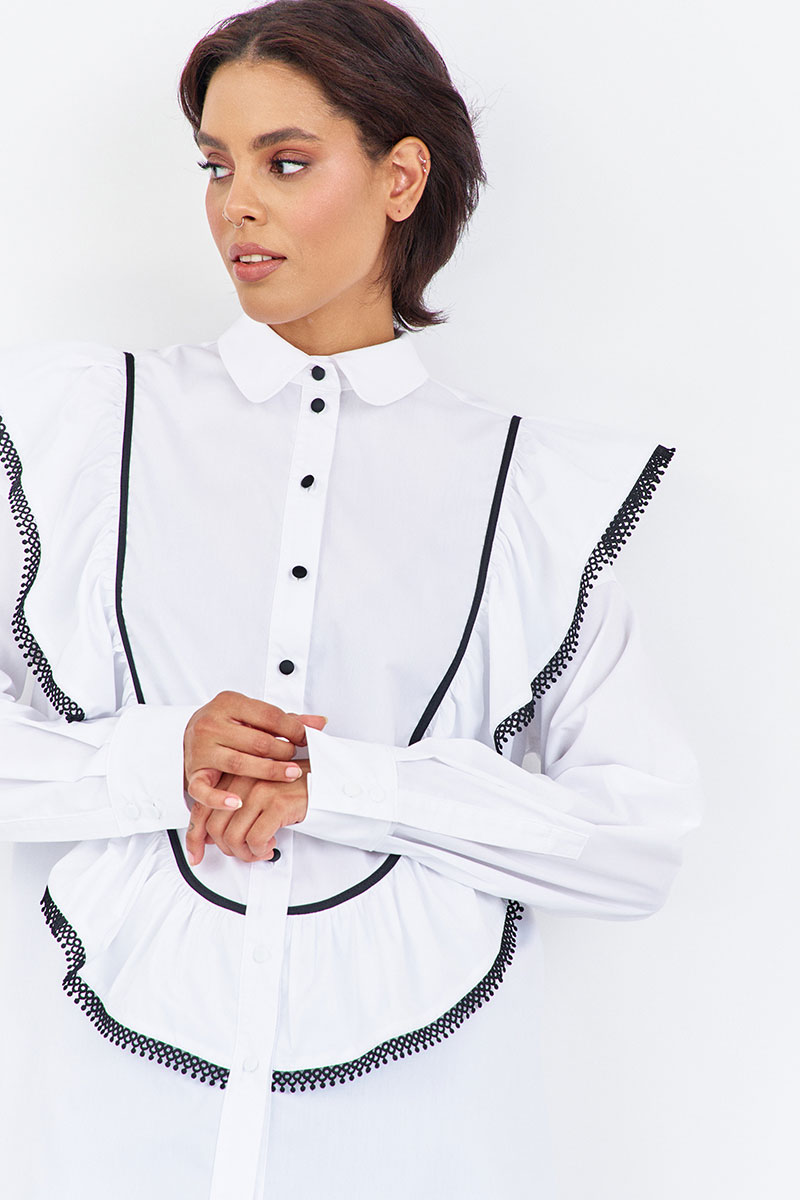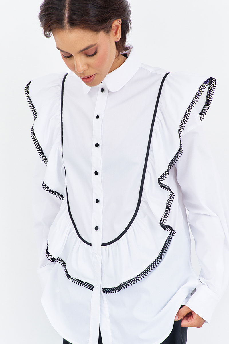 Характеристики блузки: выполнена из блузочной ткани, центральная застежка на петли и пуговицы, по переду и спинке декоративные рюши с тесьмой.