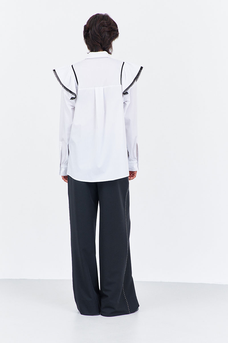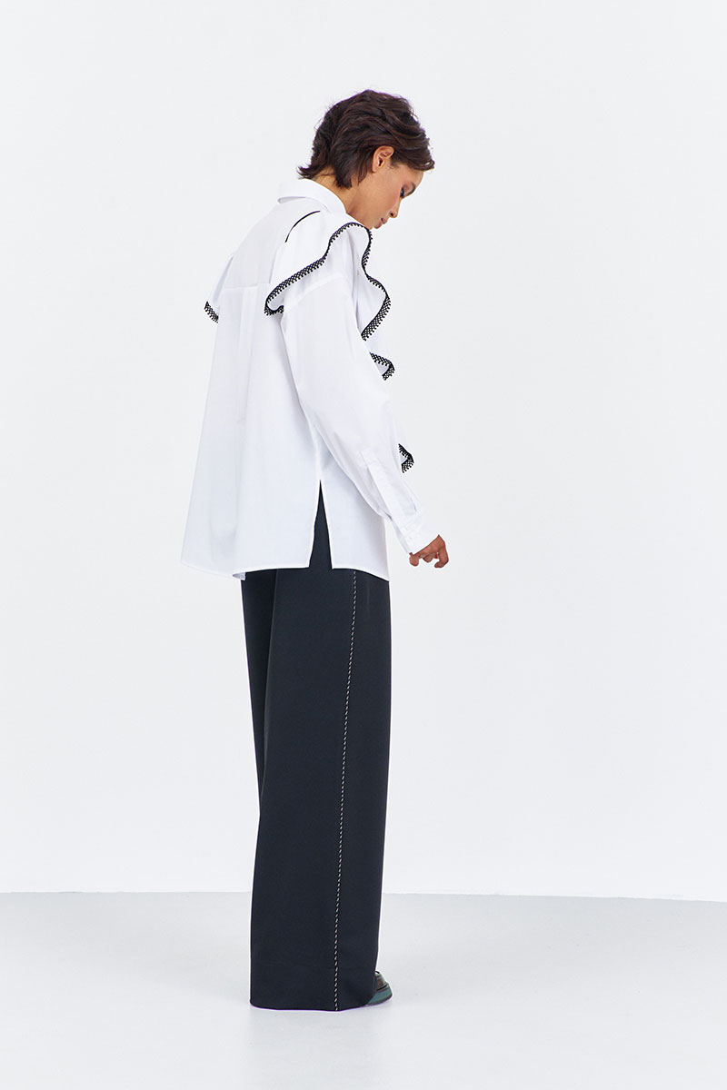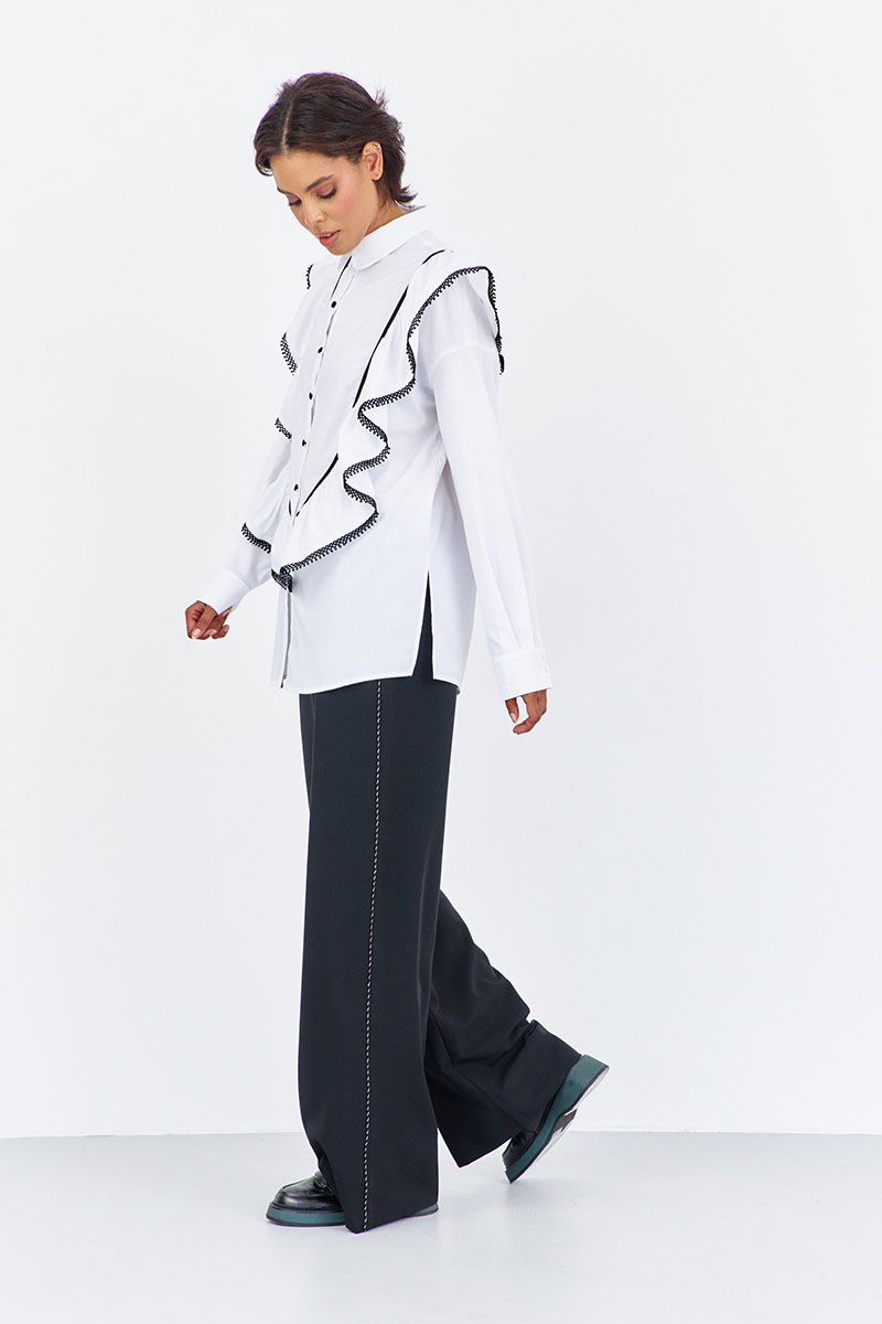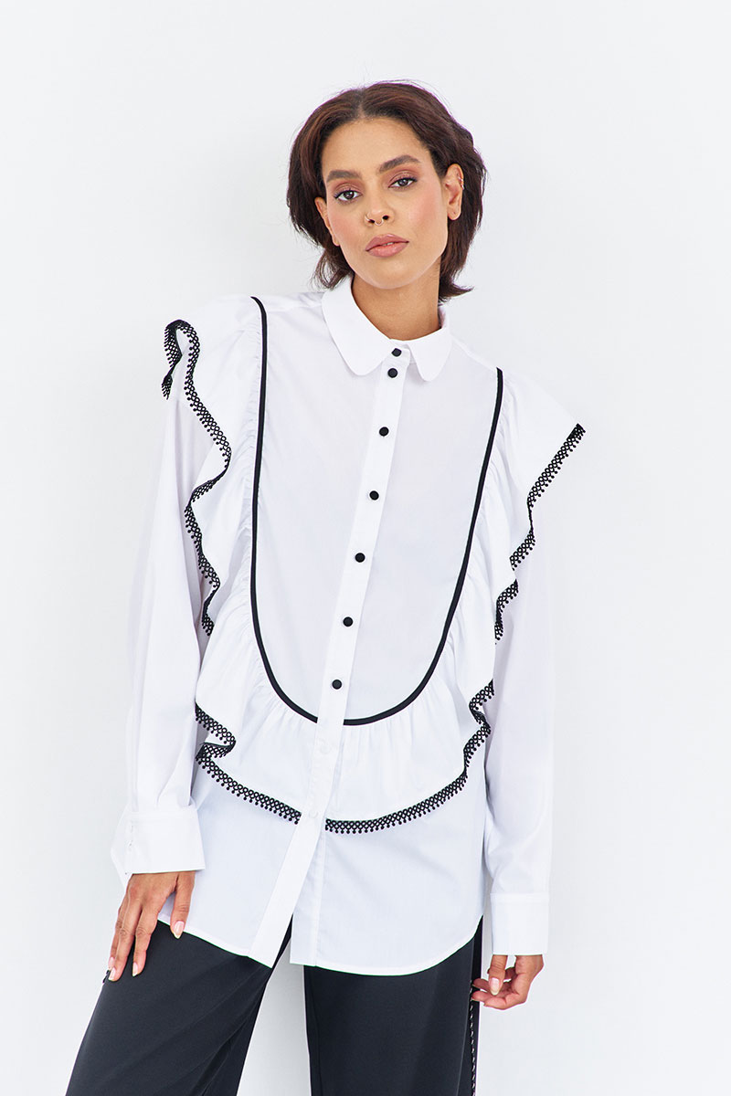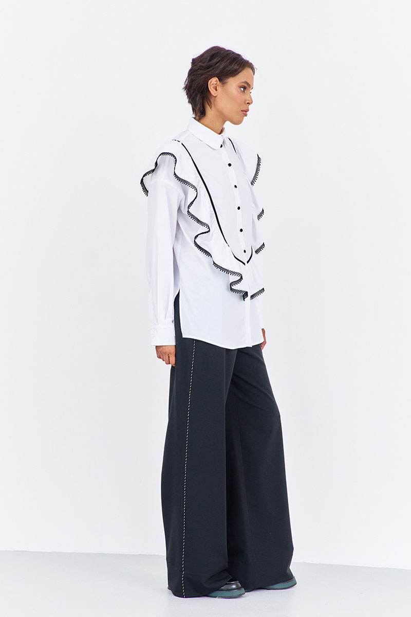 Характеристики блузки: выполнена из блузочной ткани, центральная застежка на петли и пуговицы, по переду и спинке декоративные рюши с тесьмой.