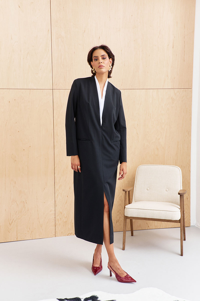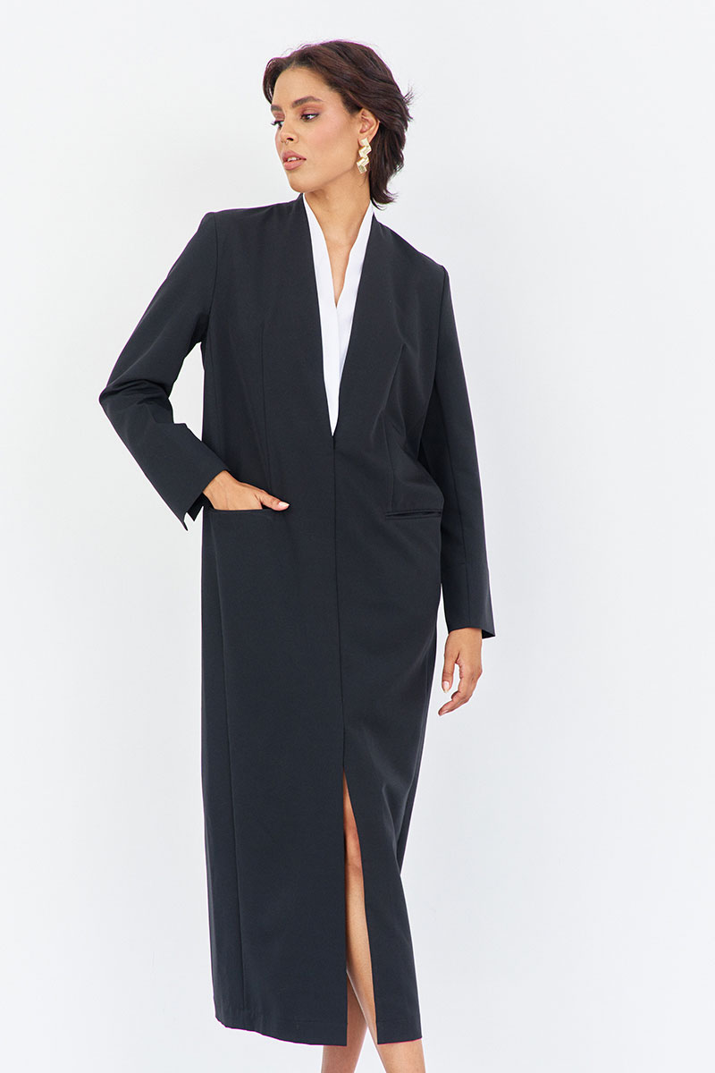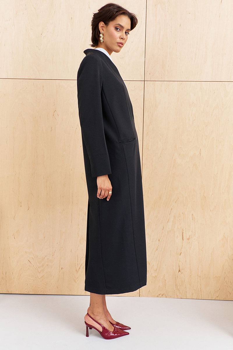 Платье прямого силуэта с воротником шаль. Характеристики: выполнено из плательной ткани в черном цвете, по переду карманы в рамку, рукава по низу с разрезами, вортник-шаль, разрезы по центру переда и спинки.