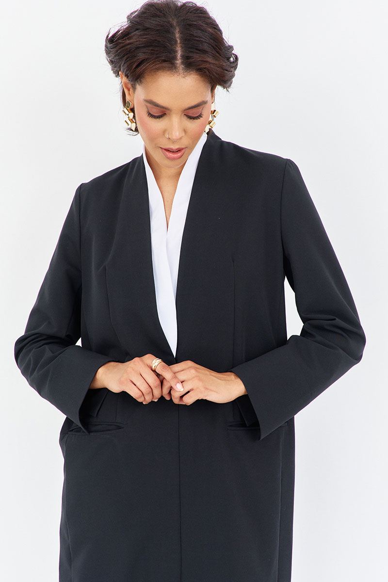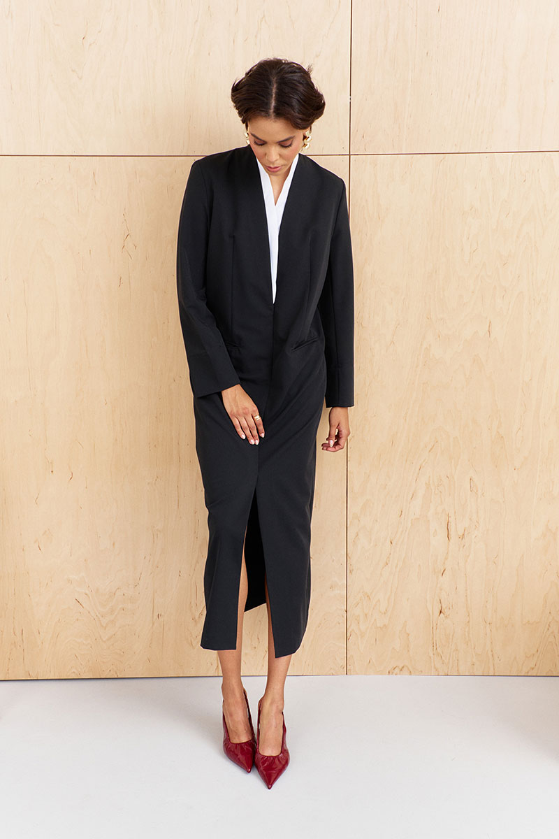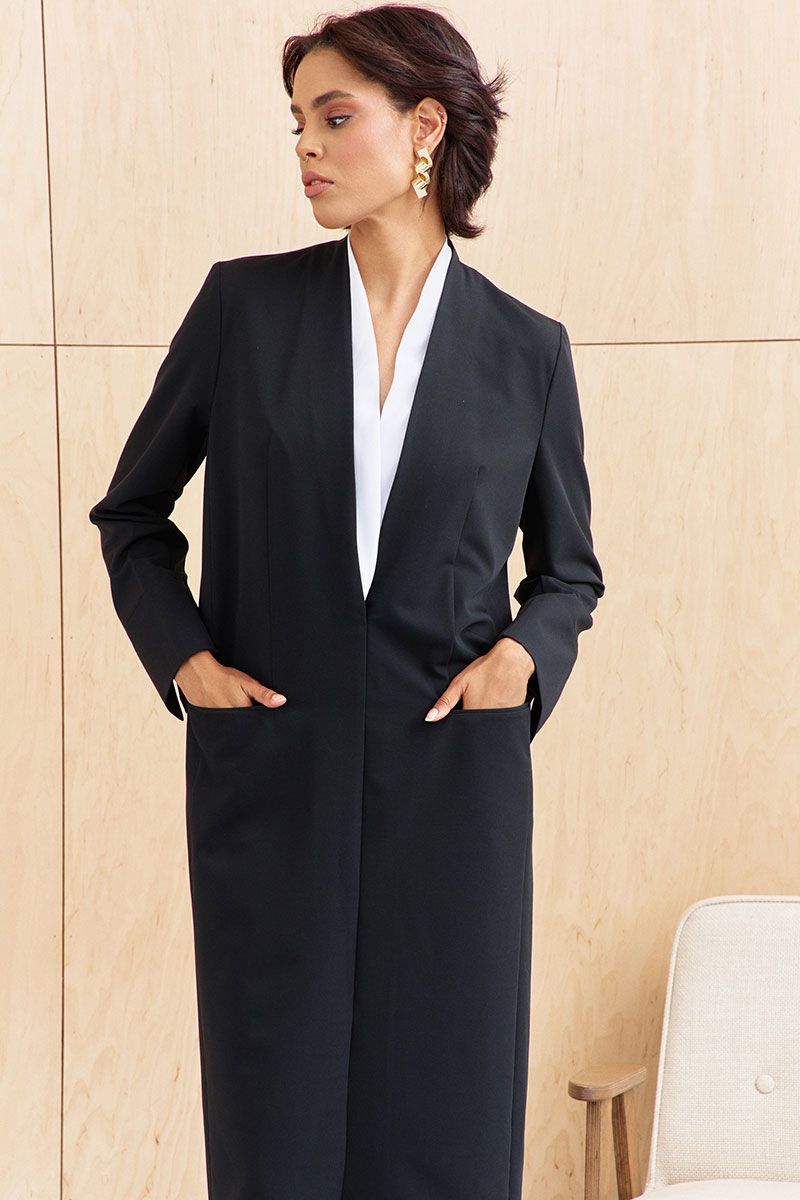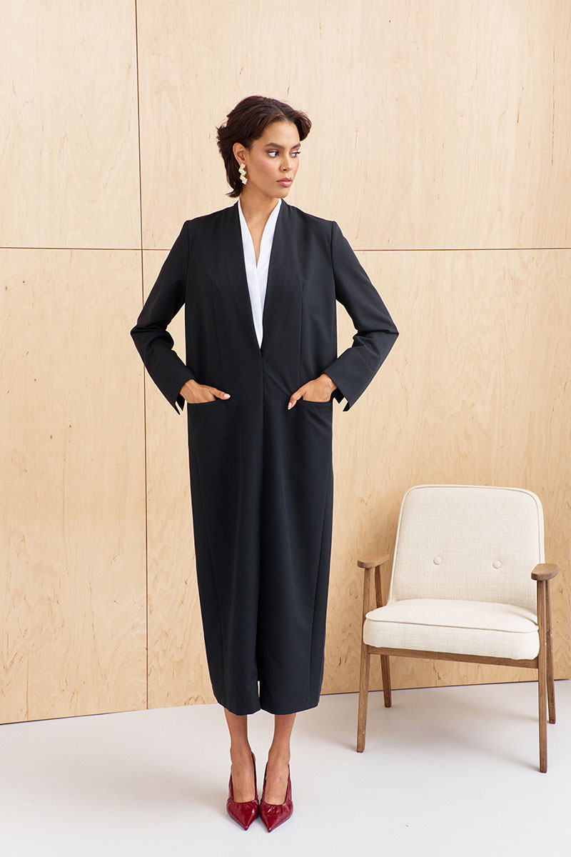 Платье прямого силуэта с воротником шаль. Характеристики: выполнено из плательной ткани в черном цвете, по переду карманы в рамку, рукава по низу с разрезами, вортник-шаль, разрезы по центру переда и спинки.