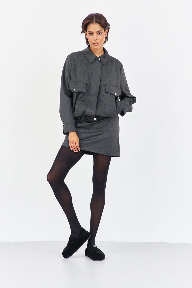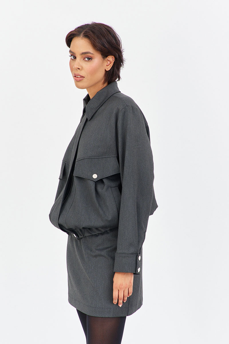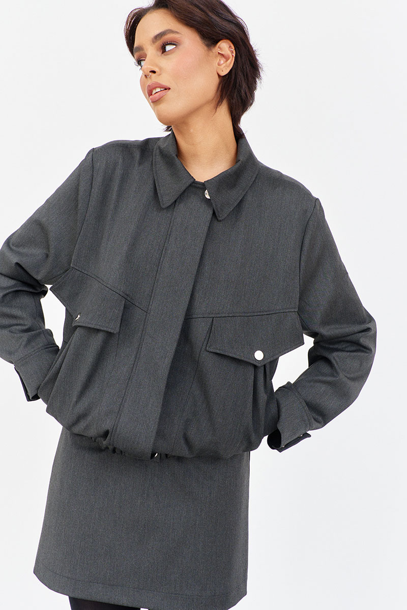 Характеристики: бомбер выполнен из костюмно-плательной ткани в цвете графит, по переду карманы-портфели с клапаном, застежка на молнию и кнопки, низ рукава и бомбера на резинке, воротник рубашечного типа.