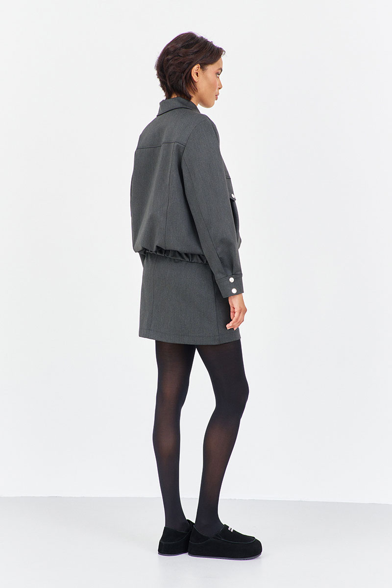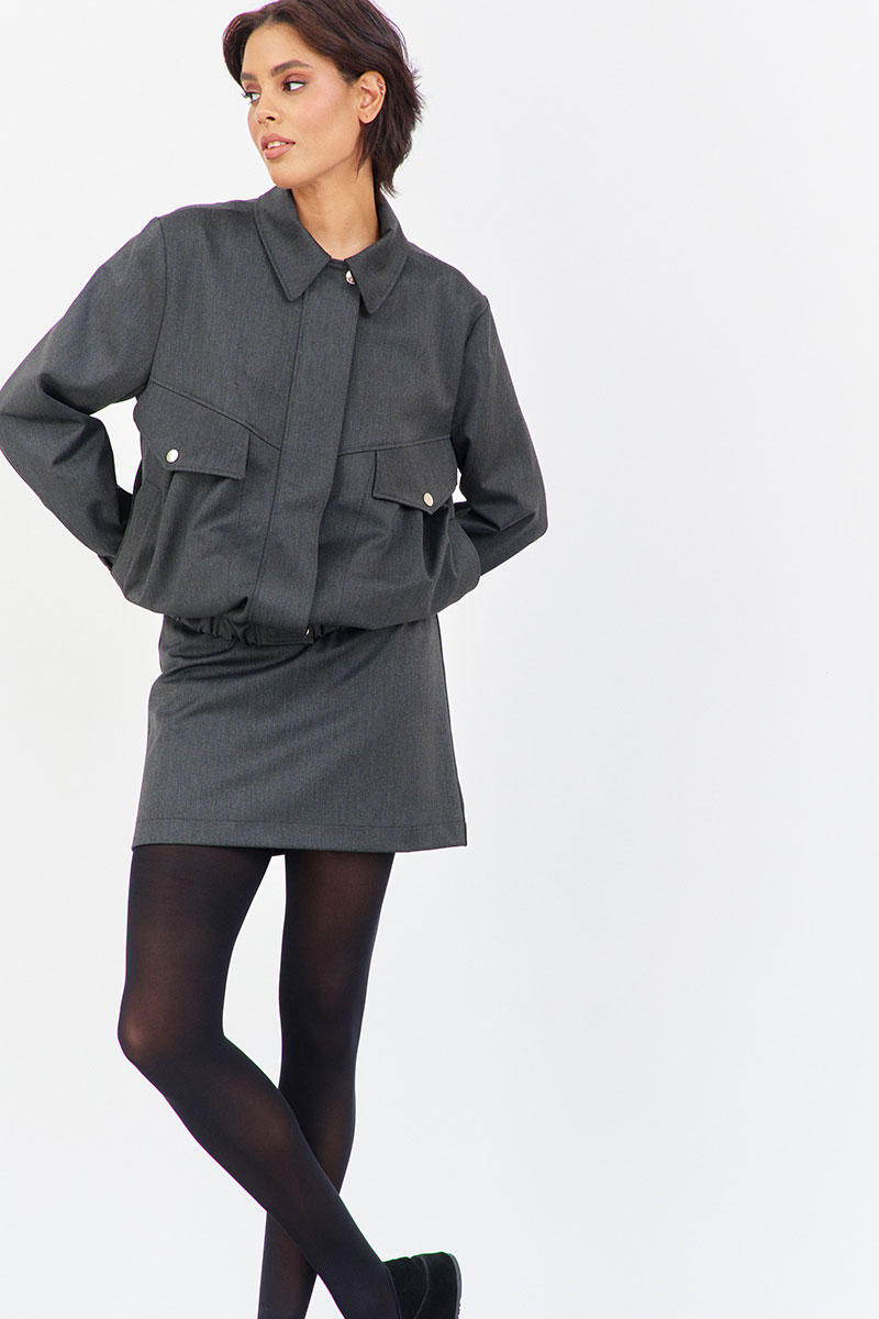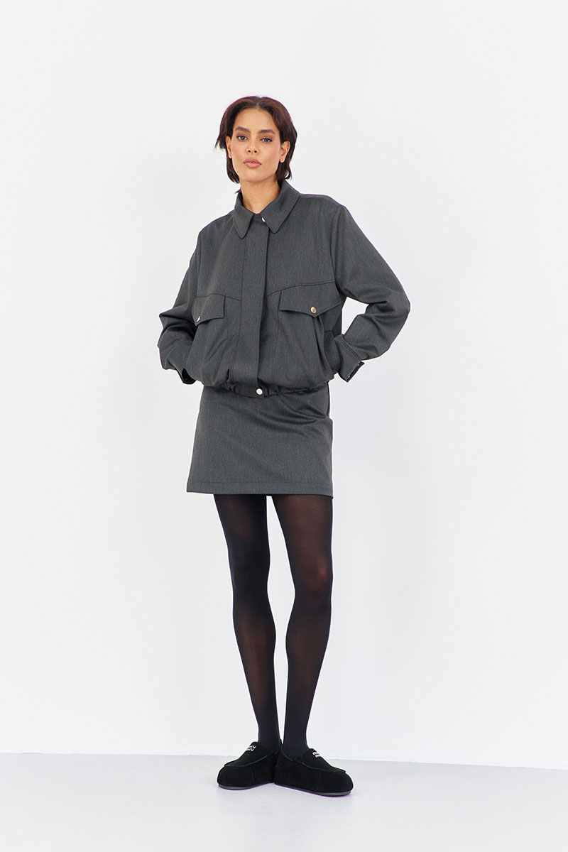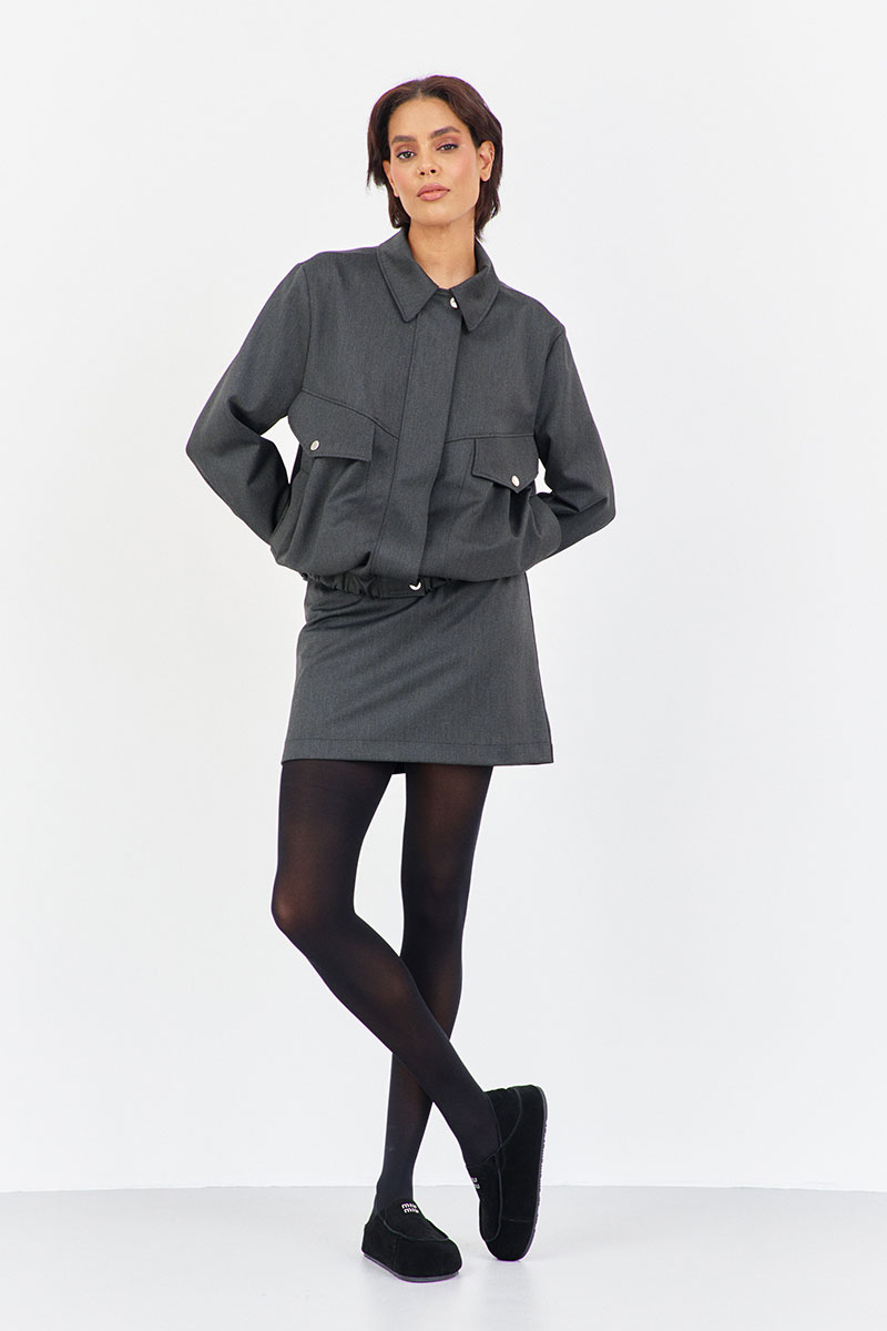 Характеристики: бомбер выполнен из костюмно-плательной ткани в цвете графит, по переду карманы-портфели с клапаном, застежка на молнию и кнопки, низ рукава и бомбера на резинке, воротник рубашечного типа.