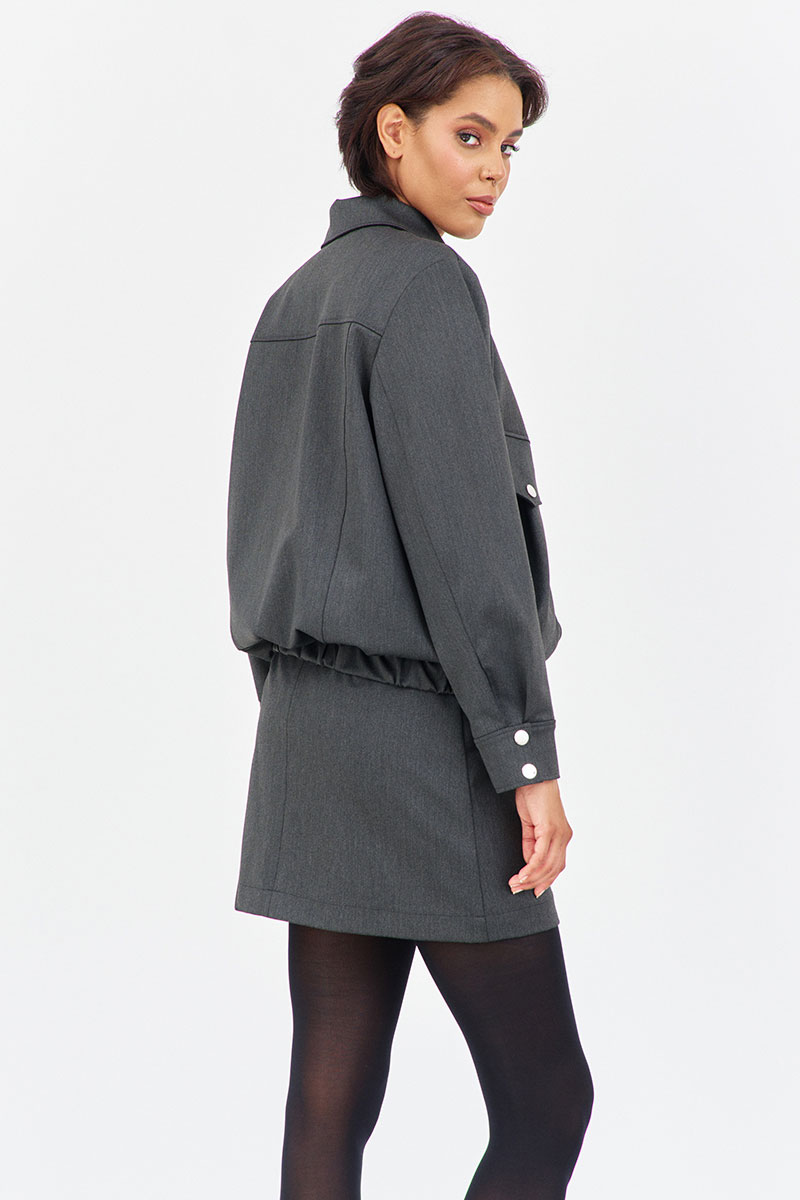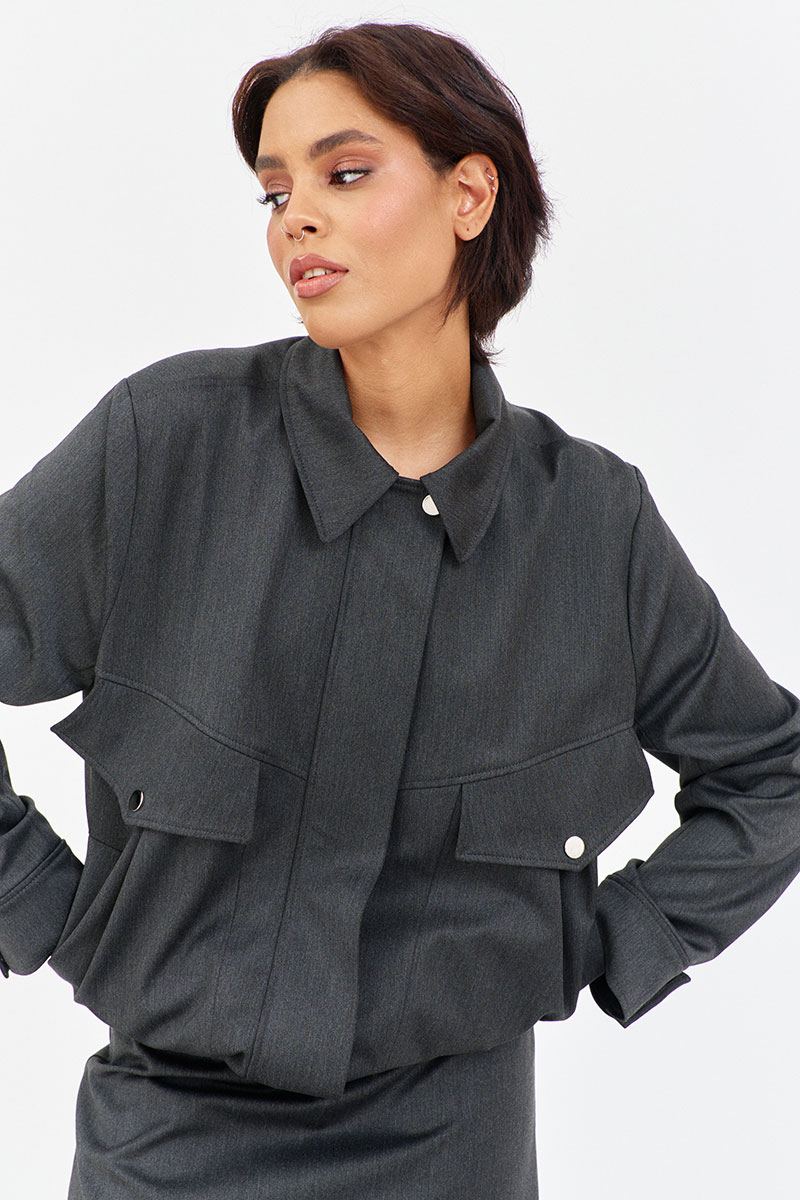 Характеристики: бомбер выполнен из костюмно-плательной ткани в цвете графит, по переду карманы-портфели с клапаном, застежка на молнию и кнопки, низ рукава и бомбера на резинке, воротник рубашечного типа.