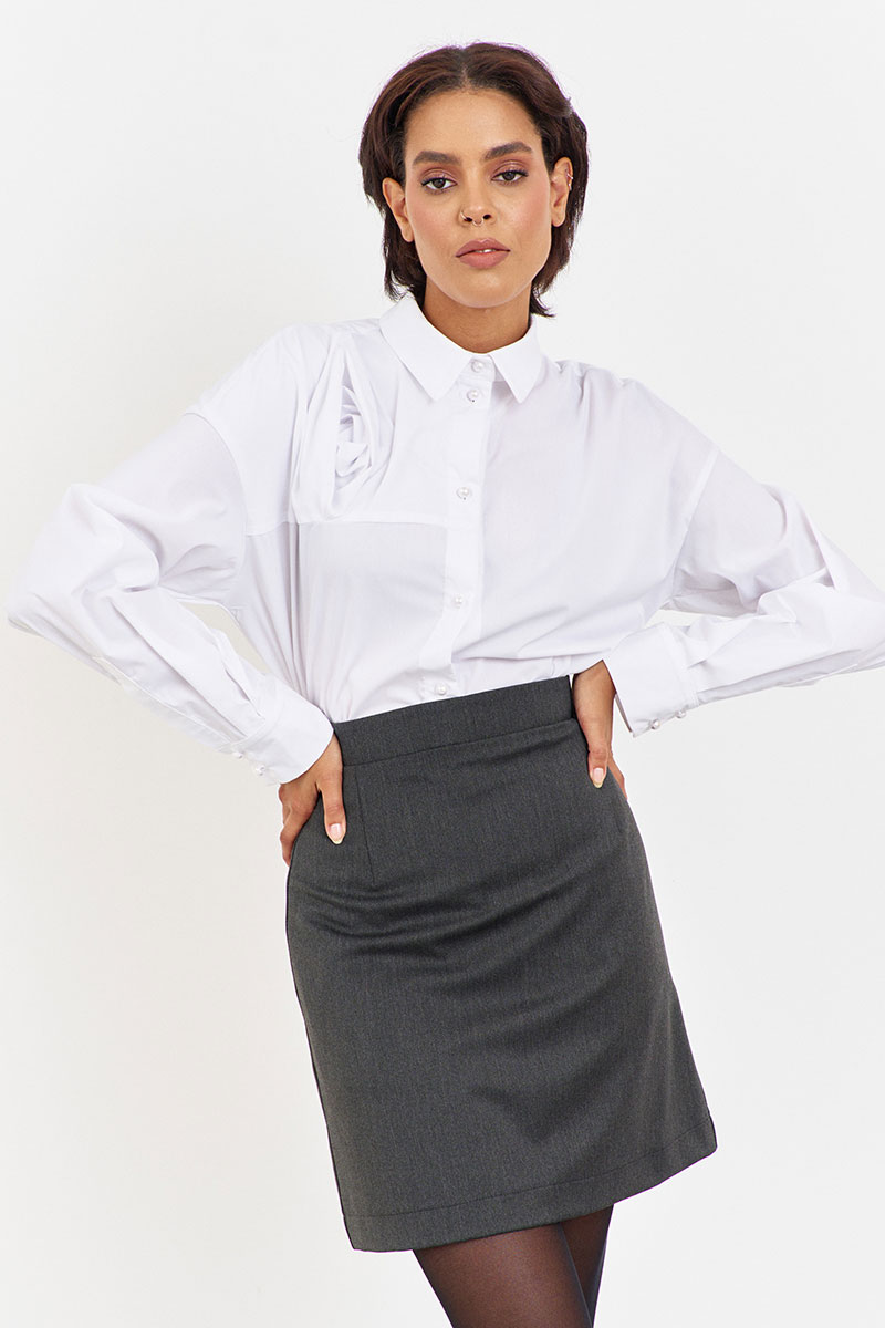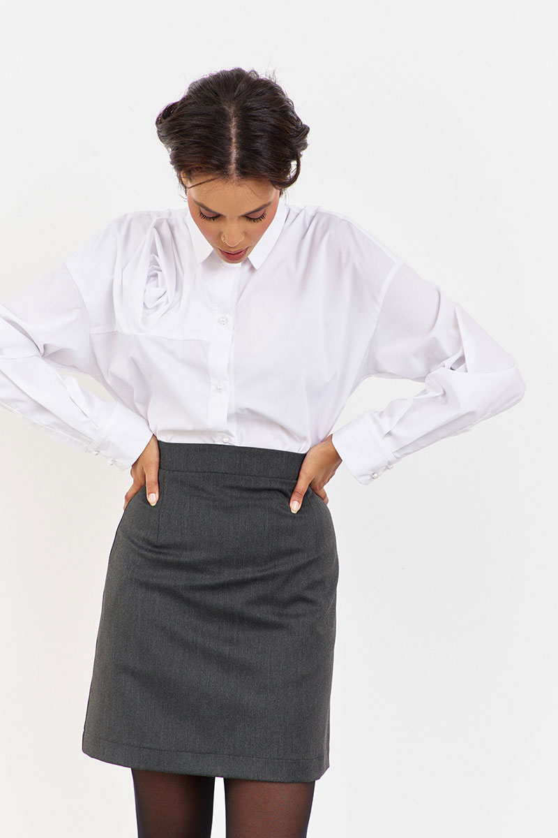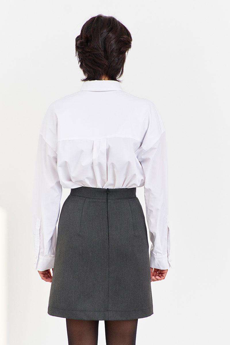 Юбка А-силуэта в цвете графит. Характеристики: застежка на потайную молнию, верх юбки обработан притачным поясом.