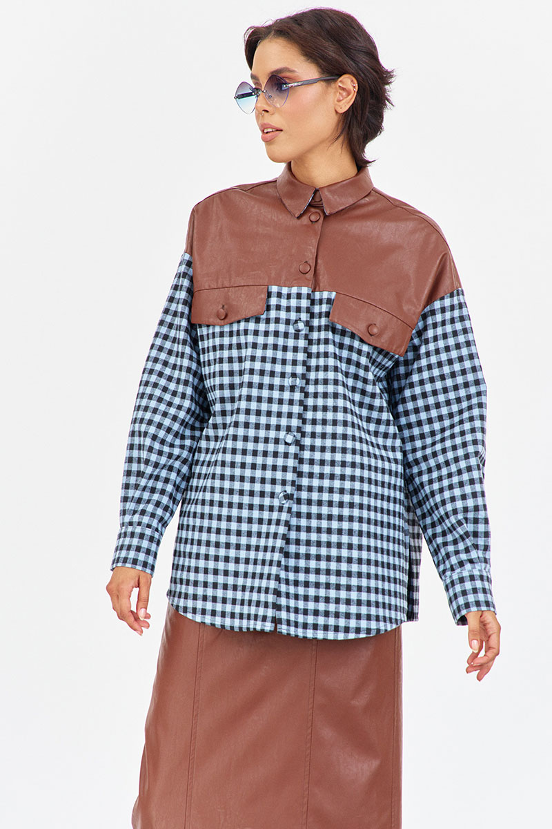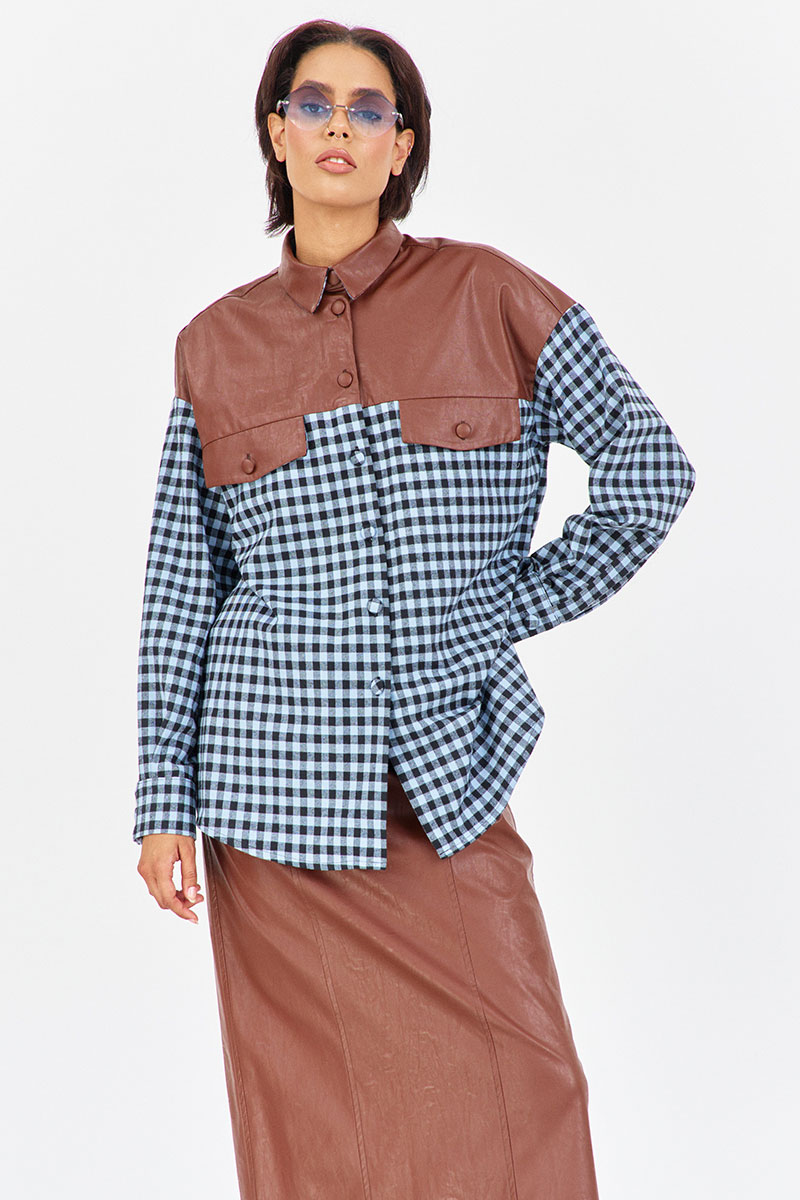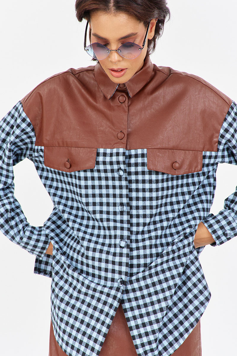 Рубашка в клетку с декоративными вставками из кожи. Характеристики: свободный силуэт, выполнена из фланелевой рубашечной ткани в черно-голубую клетку с кокеткаками, клапанами и воротником из кожи, центральная застежка на петли и пуговицы, по спинке отрезная кокетка и складка, низ рукава обработан манжетой на петли и пуговицы.