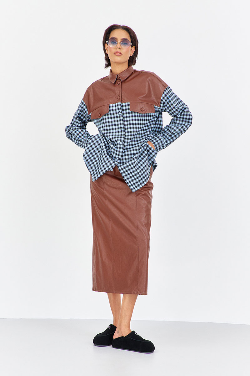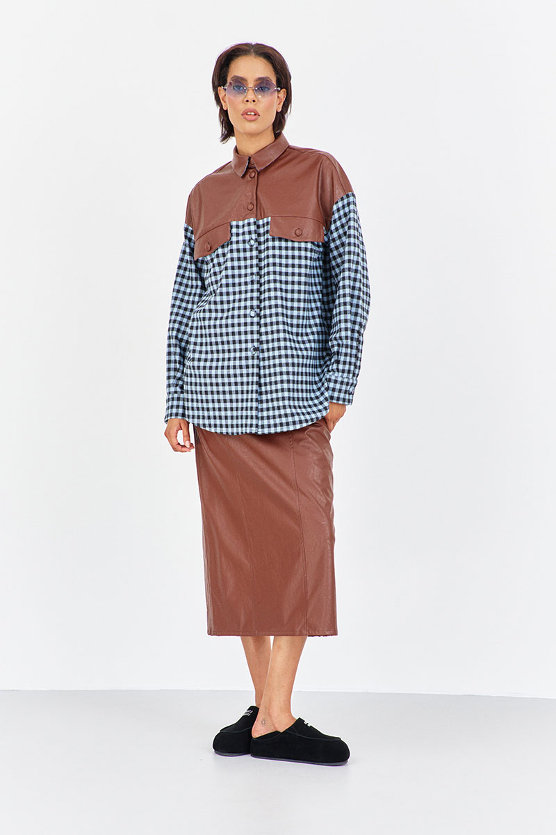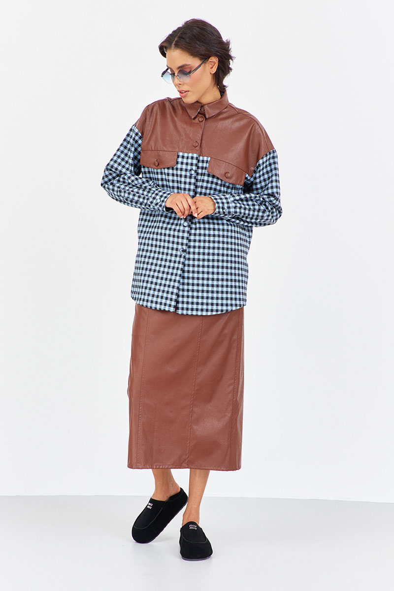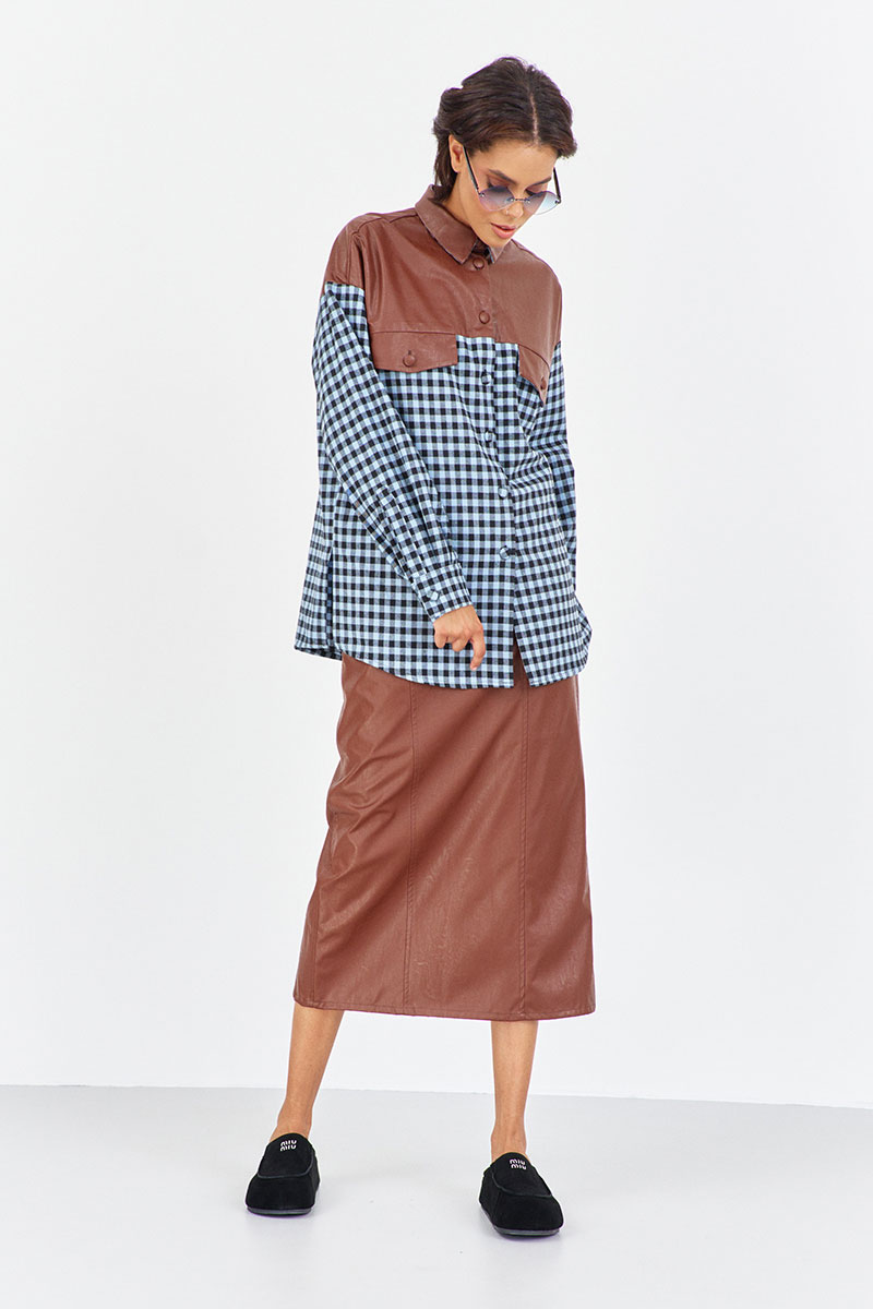 Рубашка в клетку с декоративными вставками из кожи. Характеристики: свободный силуэт, выполнена из фланелевой рубашечной ткани в черно-голубую клетку с кокеткаками, клапанами и воротником из кожи, центральная застежка на петли и пуговицы, по спинке отрезная кокетка и складка, низ рукава обработан манжетой на петли и пуговицы.