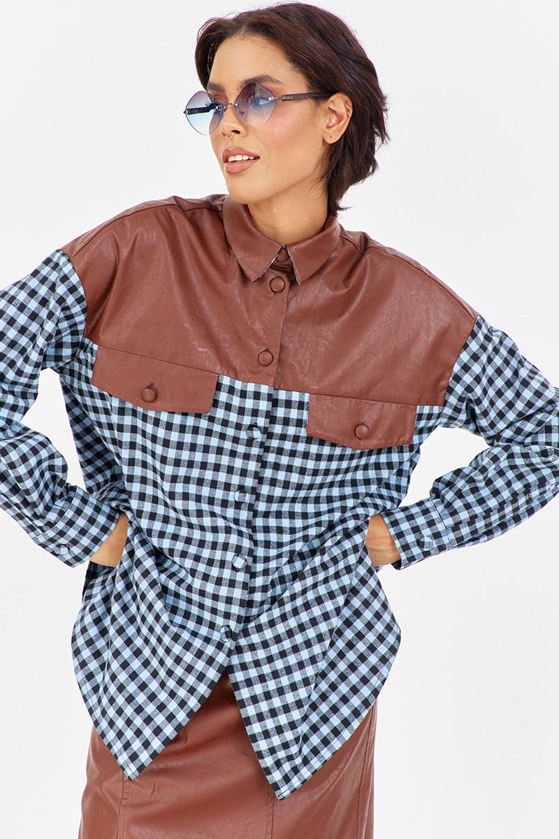 Рубашка в клетку с декоративными вставками из кожи. Характеристики: свободный силуэт, выполнена из фланелевой рубашечной ткани в черно-голубую клетку с кокеткаками, клапанами и воротником из кожи, центральная застежка на петли и пуговицы, по спинке отрезная кокетка и складка, низ рукава обработан манжетой на петли и пуговицы.