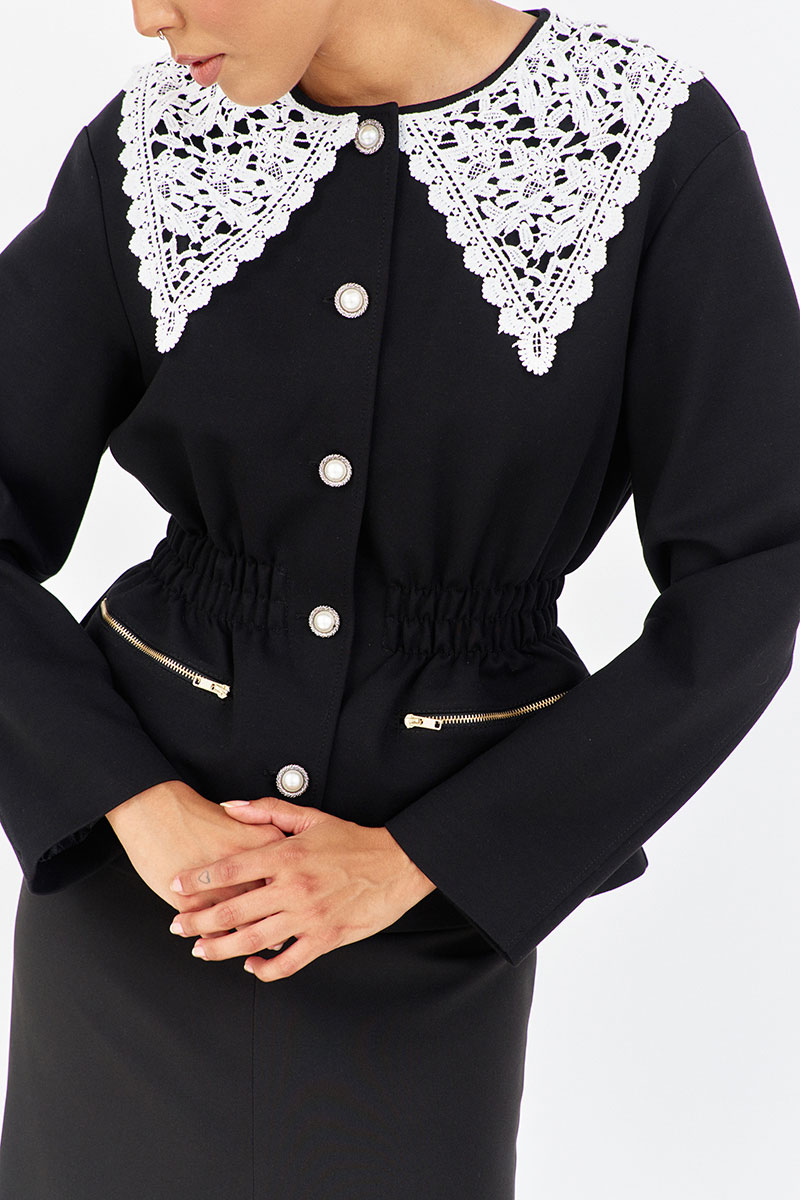 Жакет приталенного силуэта с карманами по переду и хлопковым воротником. Характеристики: выполнен из костюмно-плательной ткани в черном цвете, центральная застежка на кнопки, по талии резинка, на подкладке.