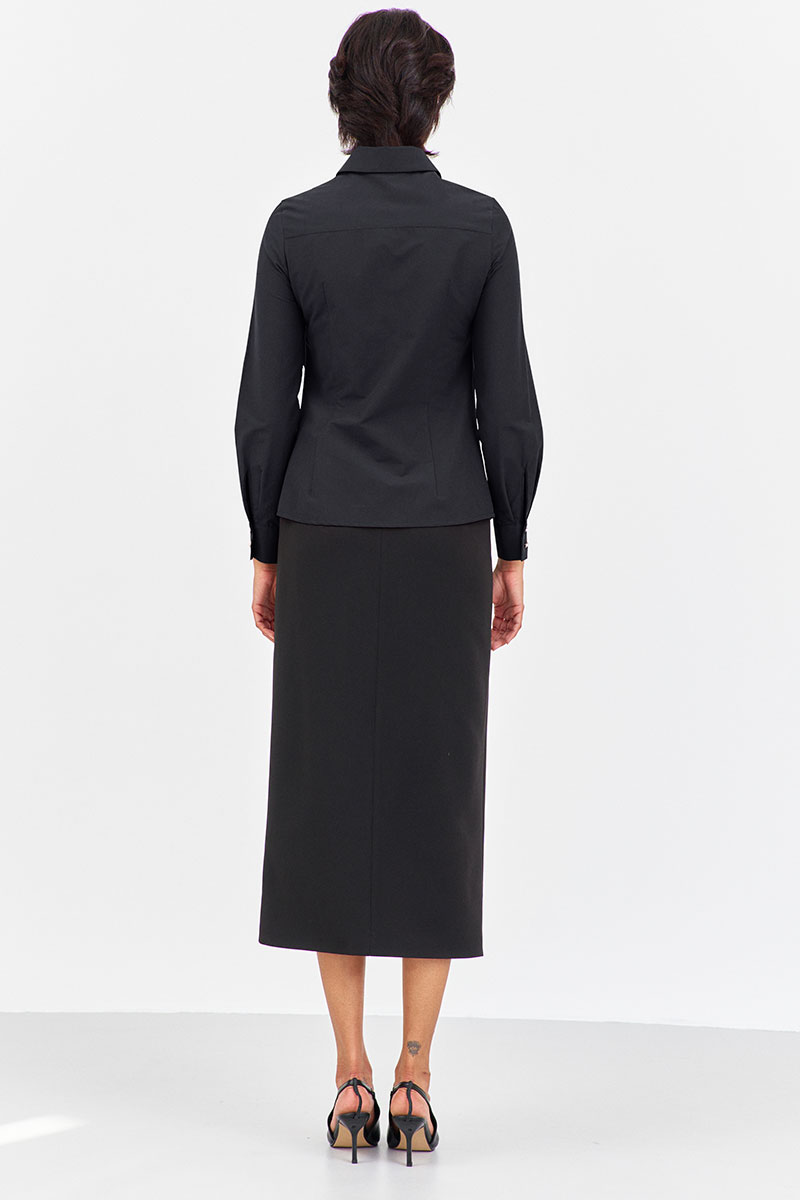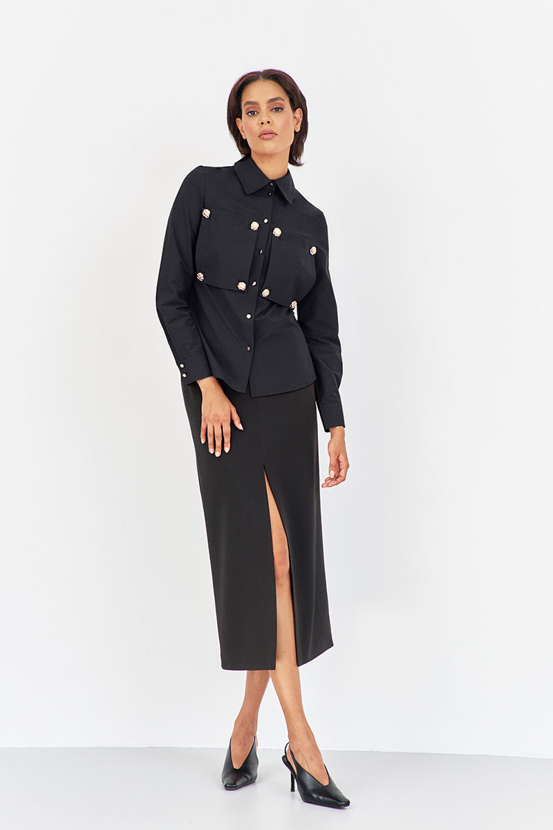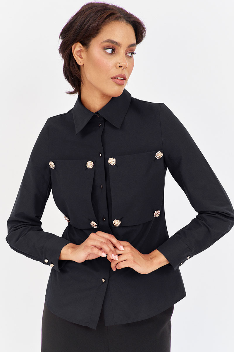 Блузка приталенного силуэта с декоративными карманами по переду. Характеристики: выполнена из блузочной ткани в черном цвете, центральная застежка на петли и пуговицы, по переду декоративные карманы на петли и пуговицы, по спинке отрезная кокетка.