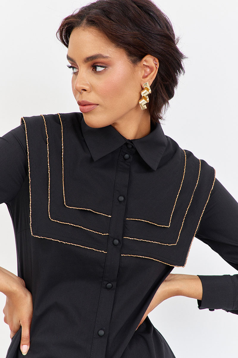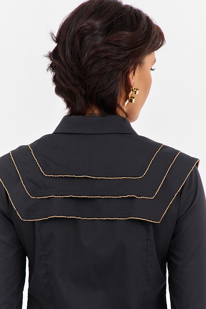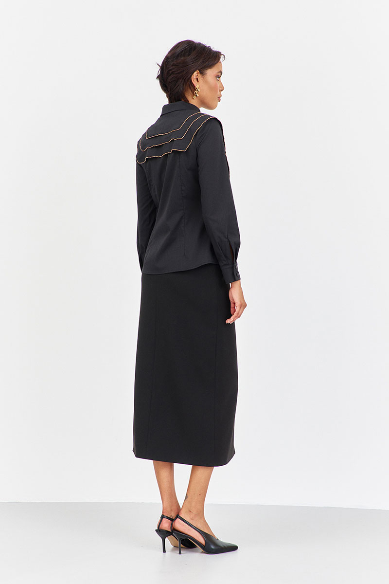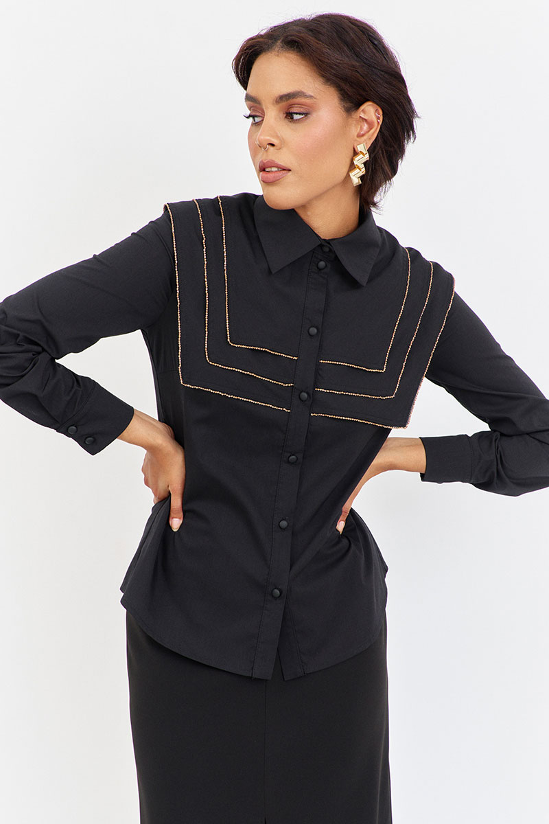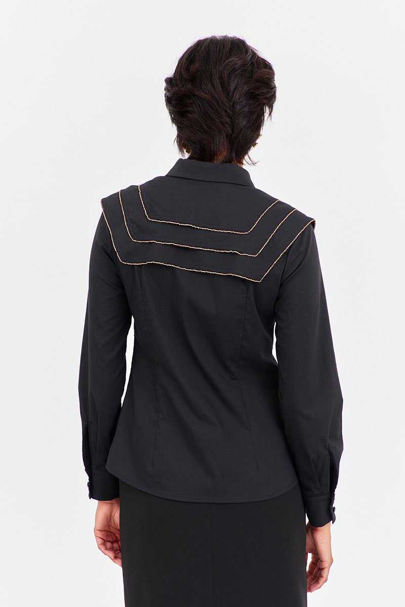 Блузка приталенного силуэта с декоративными кокетками. Характеристики: выполнена из блузочной ткани в черном цвете, центральная застежка на петли и пуговицы, по переду и спинке декоративные отлетные кокетки, низ рукава обработан манжетой.