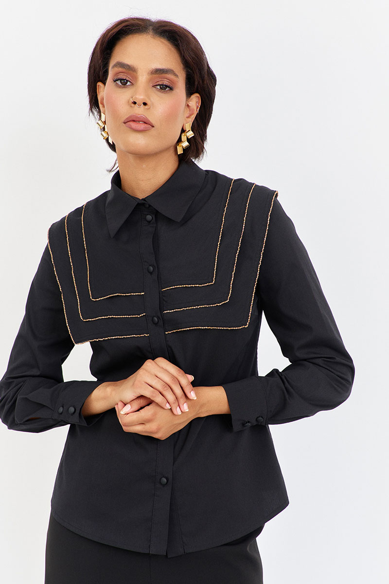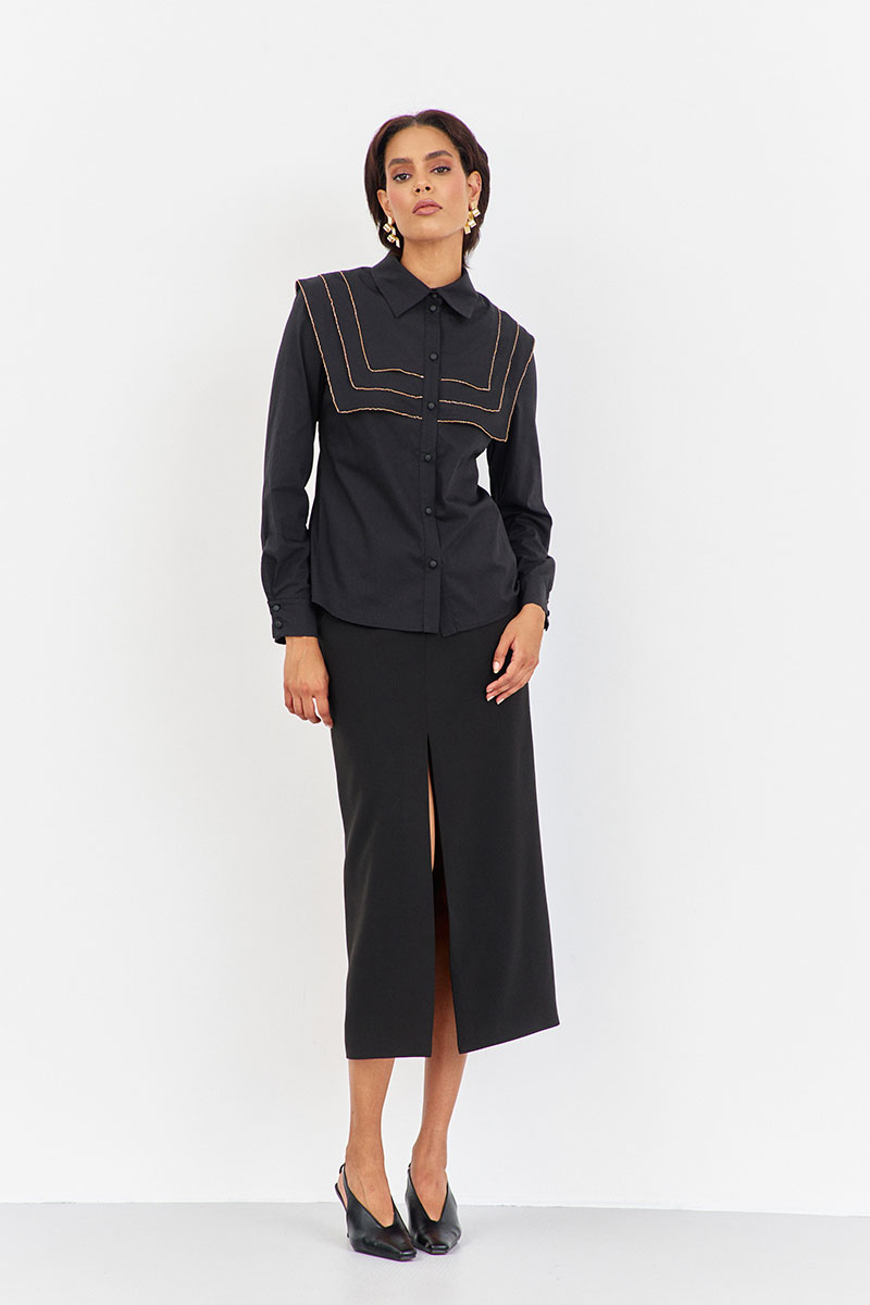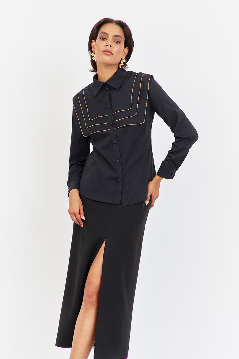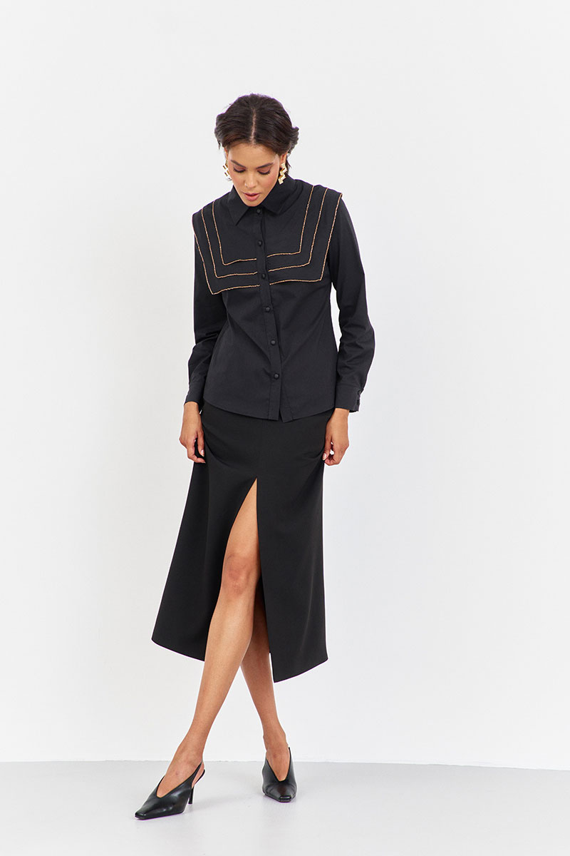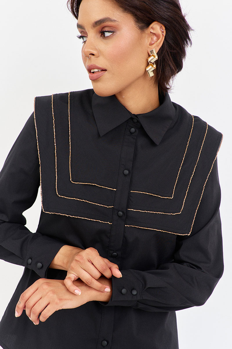 Блузка приталенного силуэта с декоративными кокетками. Характеристики: выполнена из блузочной ткани в черном цвете, центральная застежка на петли и пуговицы, по переду и спинке декоративные отлетные кокетки, низ рукава обработан манжетой.