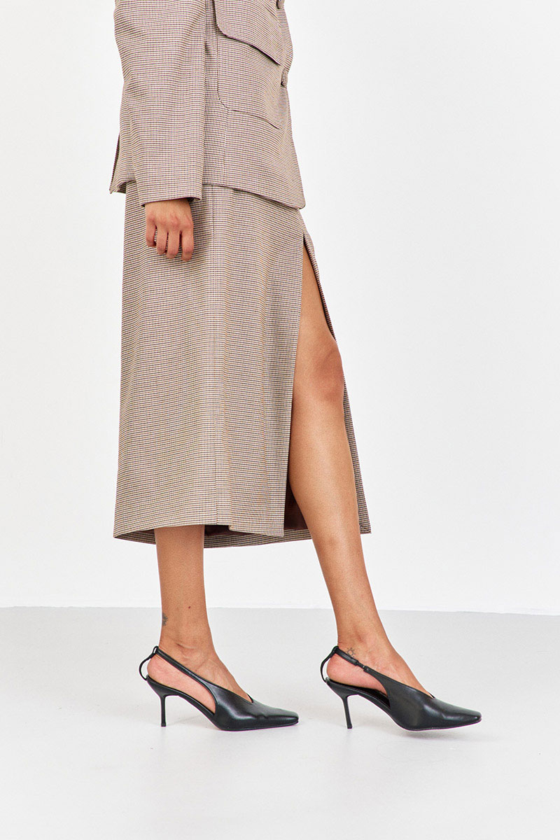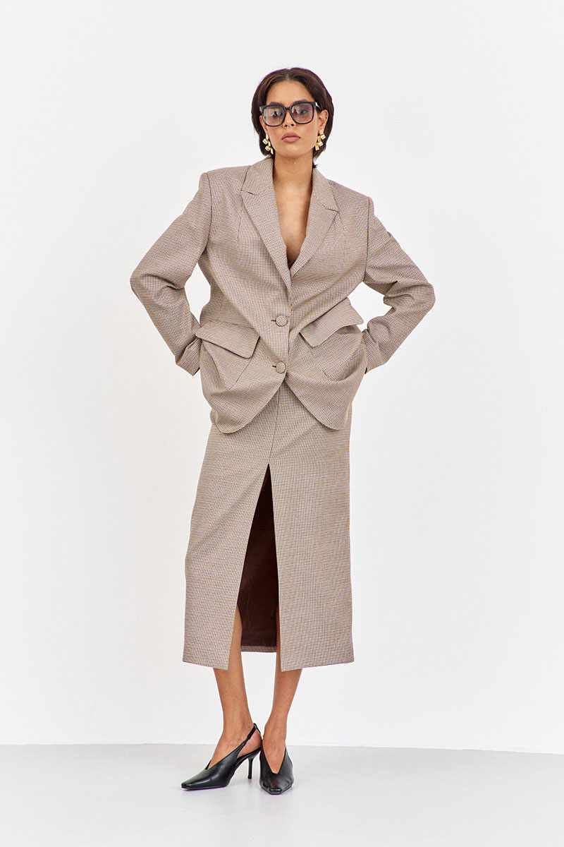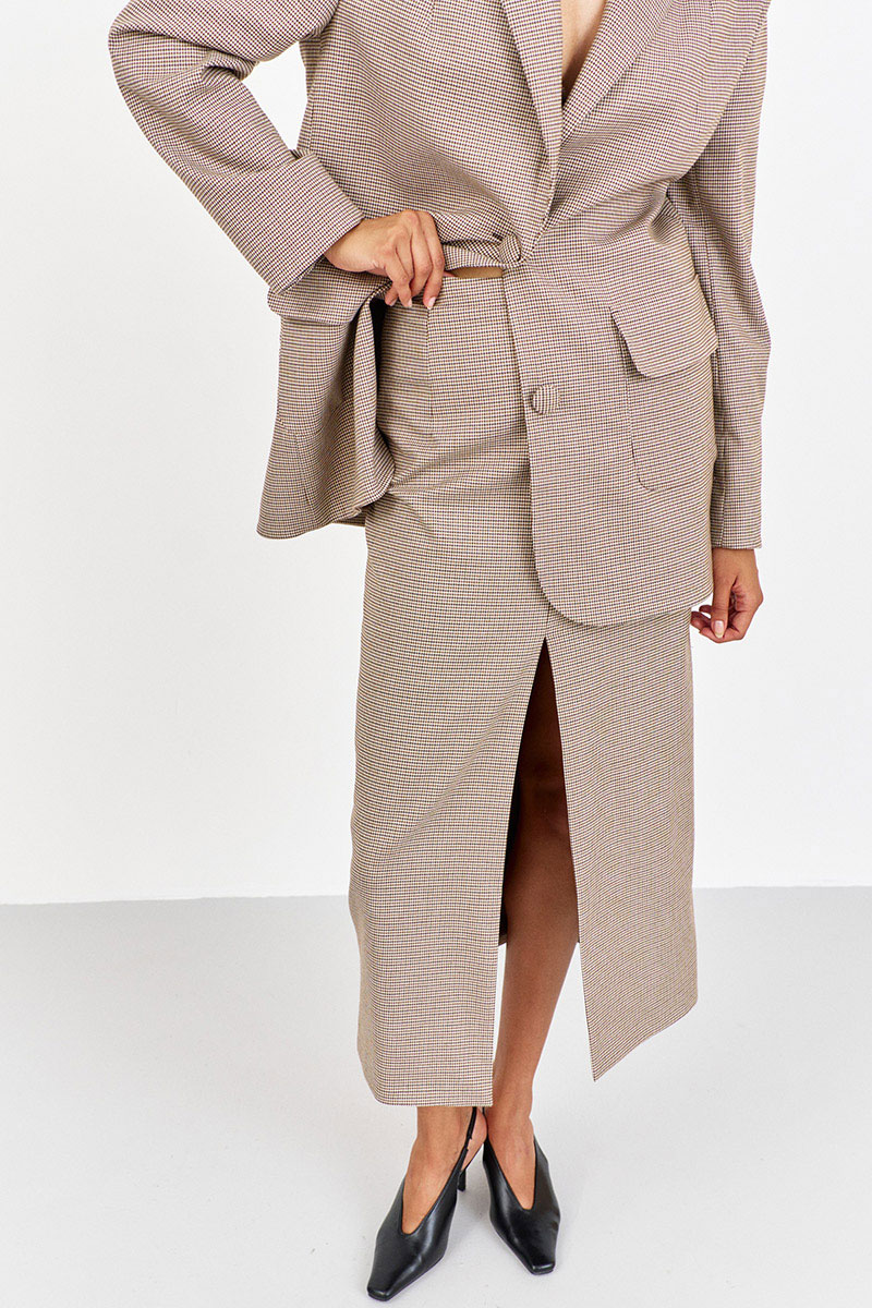 Юбка прямого силуэта в длине миди. Харктеристики: выполнена из костюмной ткани в принте"гусиная лапка" капучино, по центру переда разрез, юбка на подкладке, застежка-молния по заднему полотнищу юбки, верх юбки обработан поясом-обтачкой.