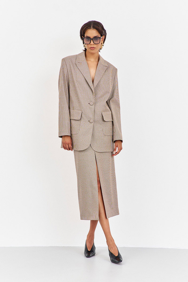 Жакет свободного кроя. Характеристики: выполнен из костюмной ткани в принте"гусиная лапка" капучино, однобортная застежка на петли и пуговицы, жакет на подкладке, накладные карманы с клапанами, по спинке разрез-шлица, рукава двухшовные.