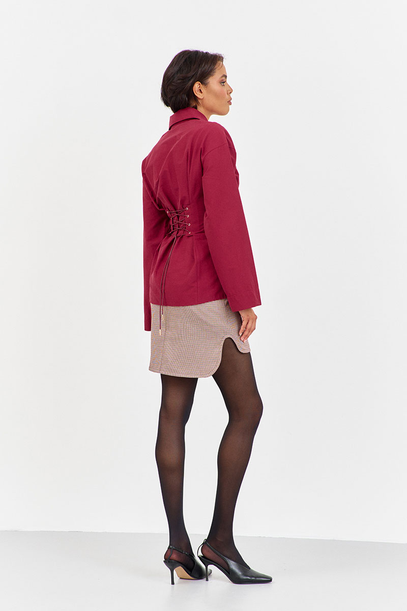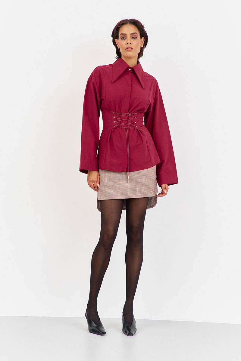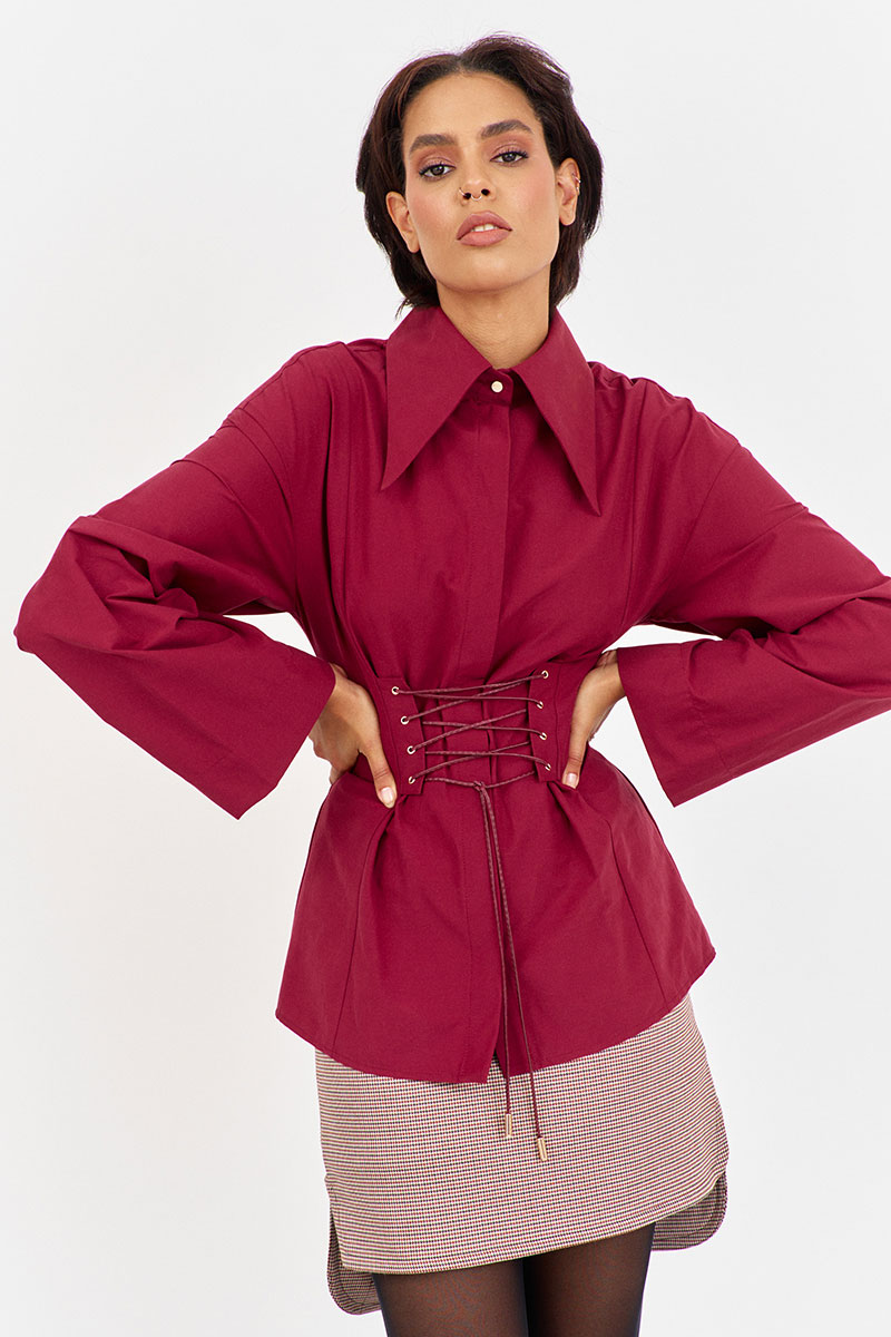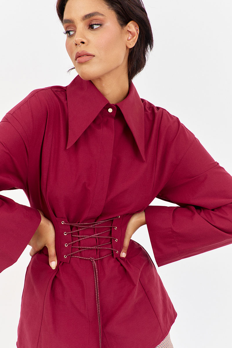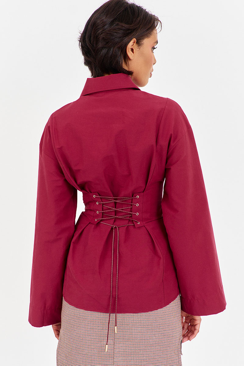 Блузка приталенного силуэта с декоративной шнуровкой по переду и спинке. Характеристики: выполнена из блузочной ткани в цвете марсала, центральная застежка на петли и пуговицы, по переду и спинке декоративная шнуровка, воротник рубашечного типа, спущенное плечо.