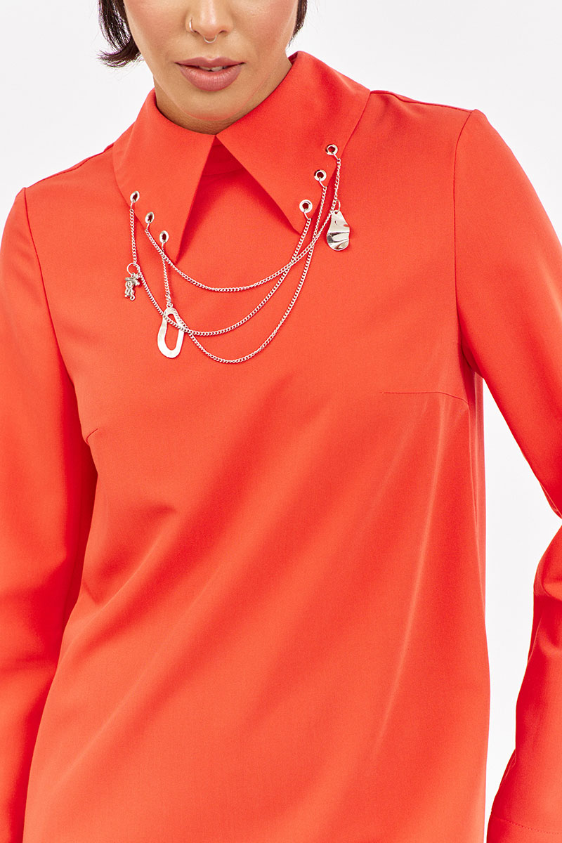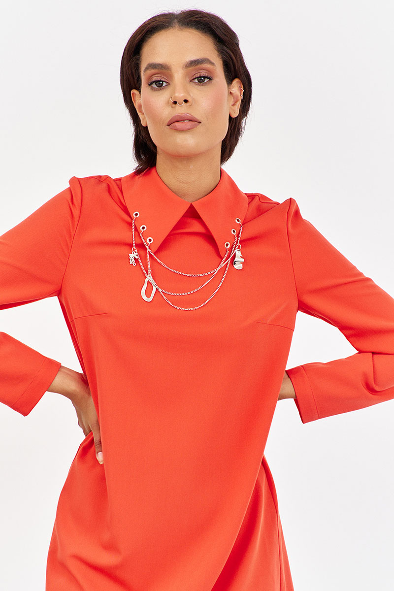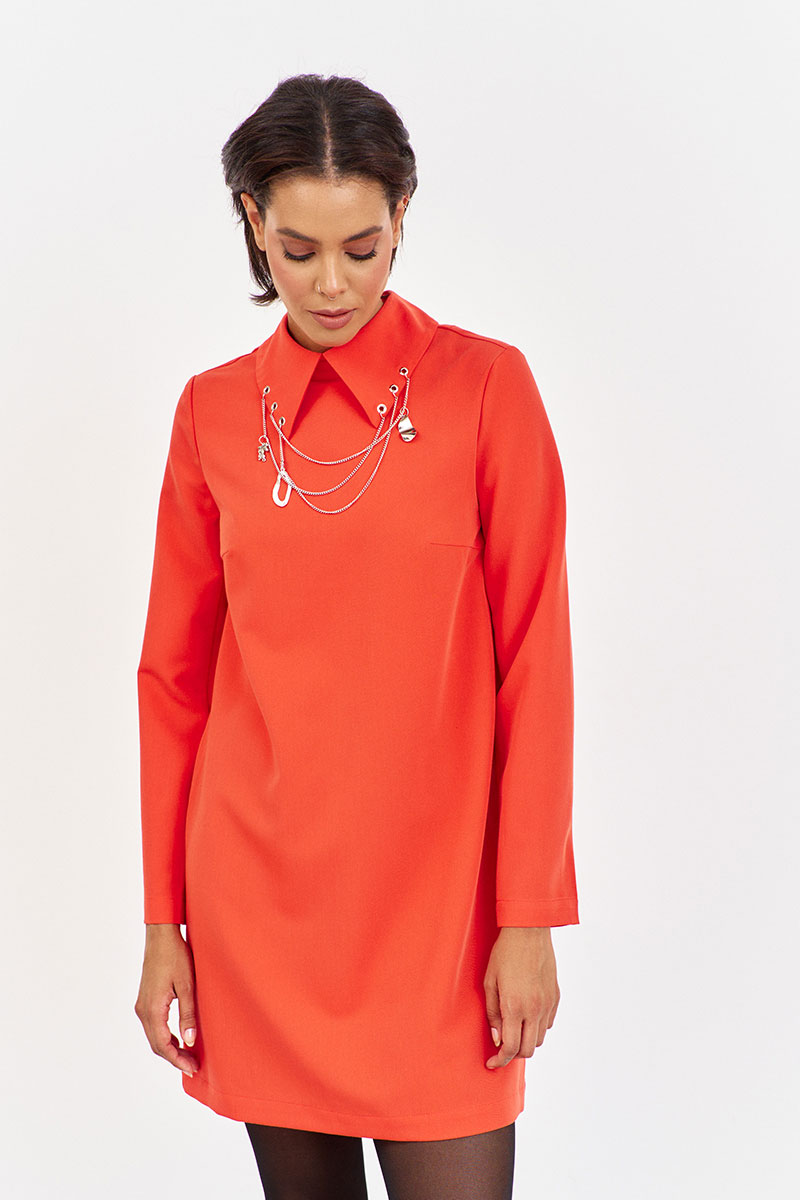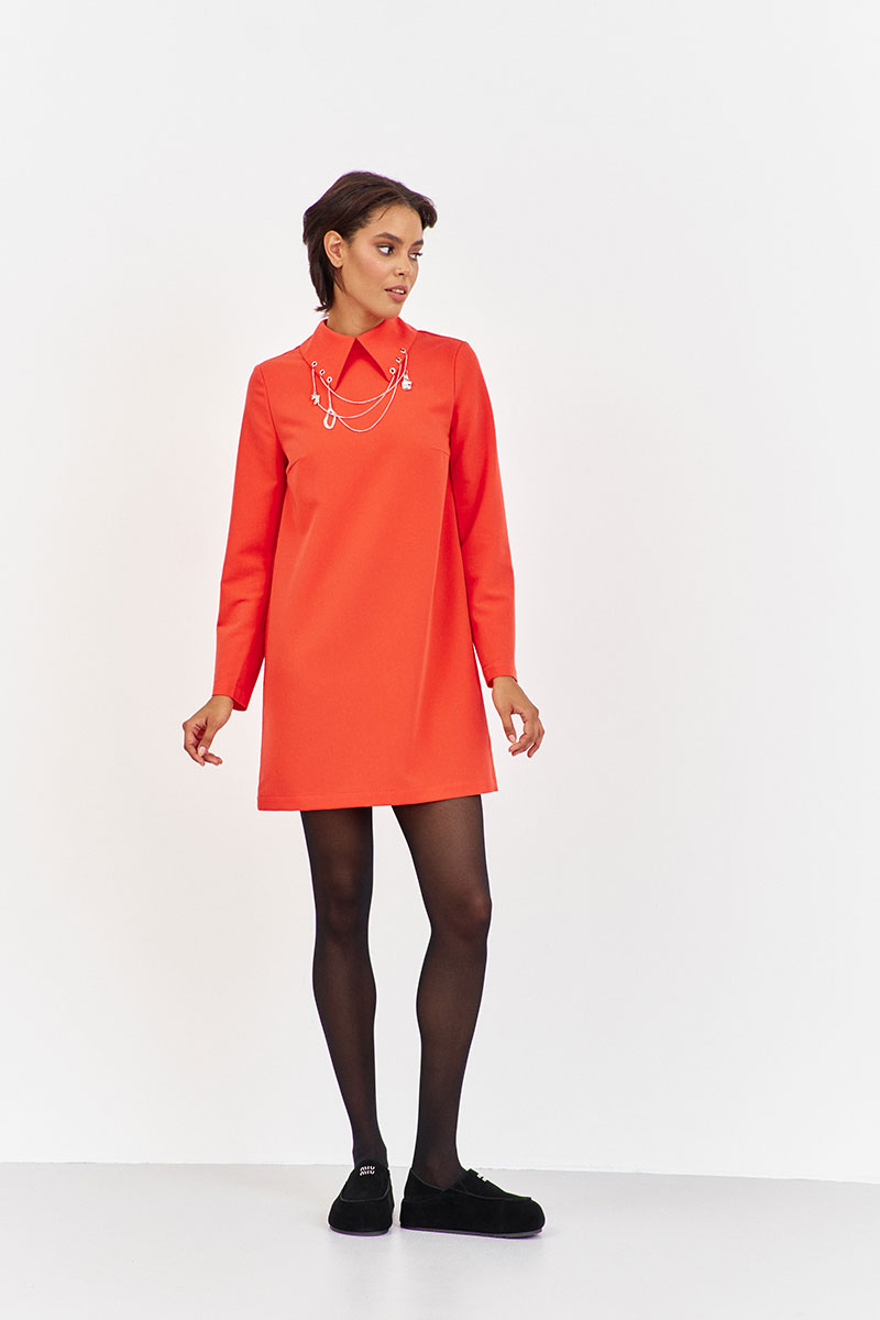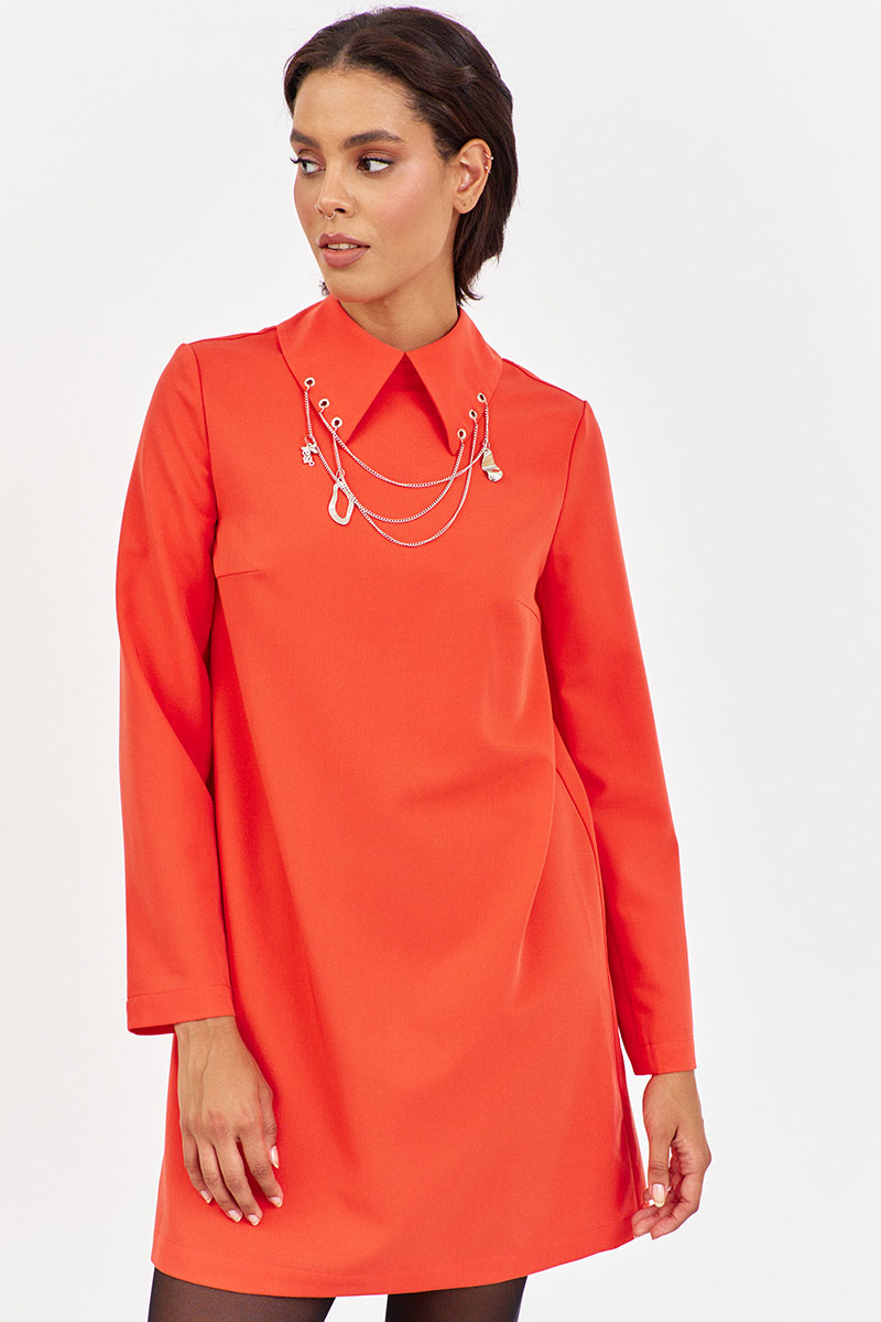 Платье с декоративным воротником в оранжевом цвете. Характеристики: выполнено из плательной ткани в оранжевом цвете, воротник рубашечного типа с декоративными подвесками, по спинке застежка-молния, рукав двухшовный.